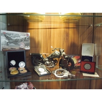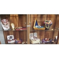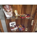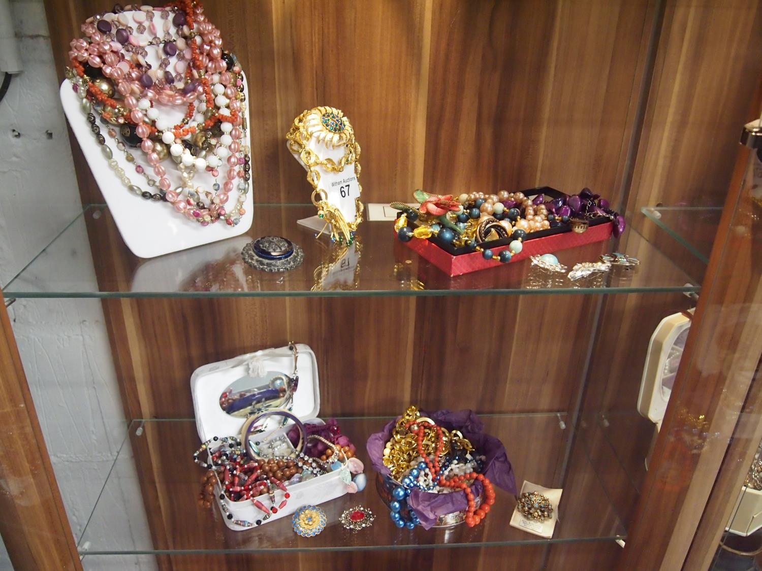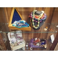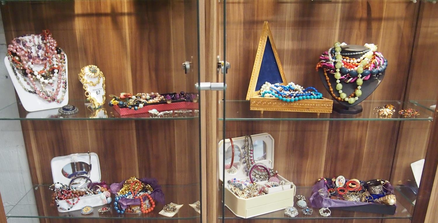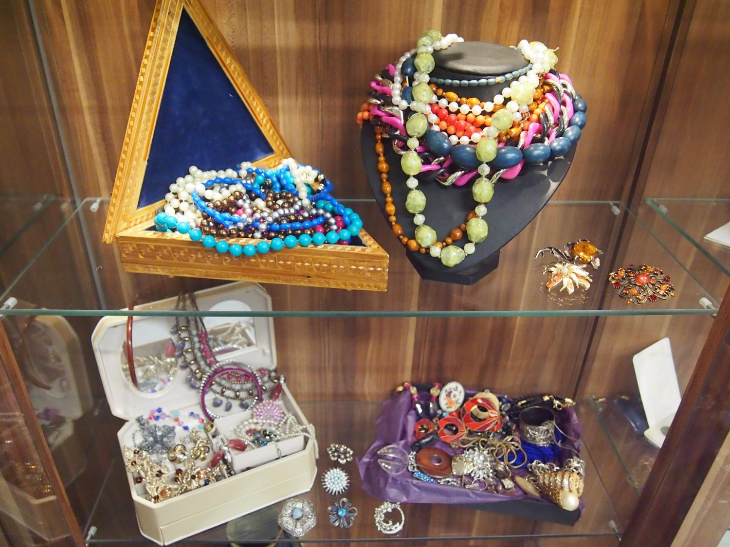 Four shelves full of costume jewellery including beads, brooches, bangles, earrings etc.