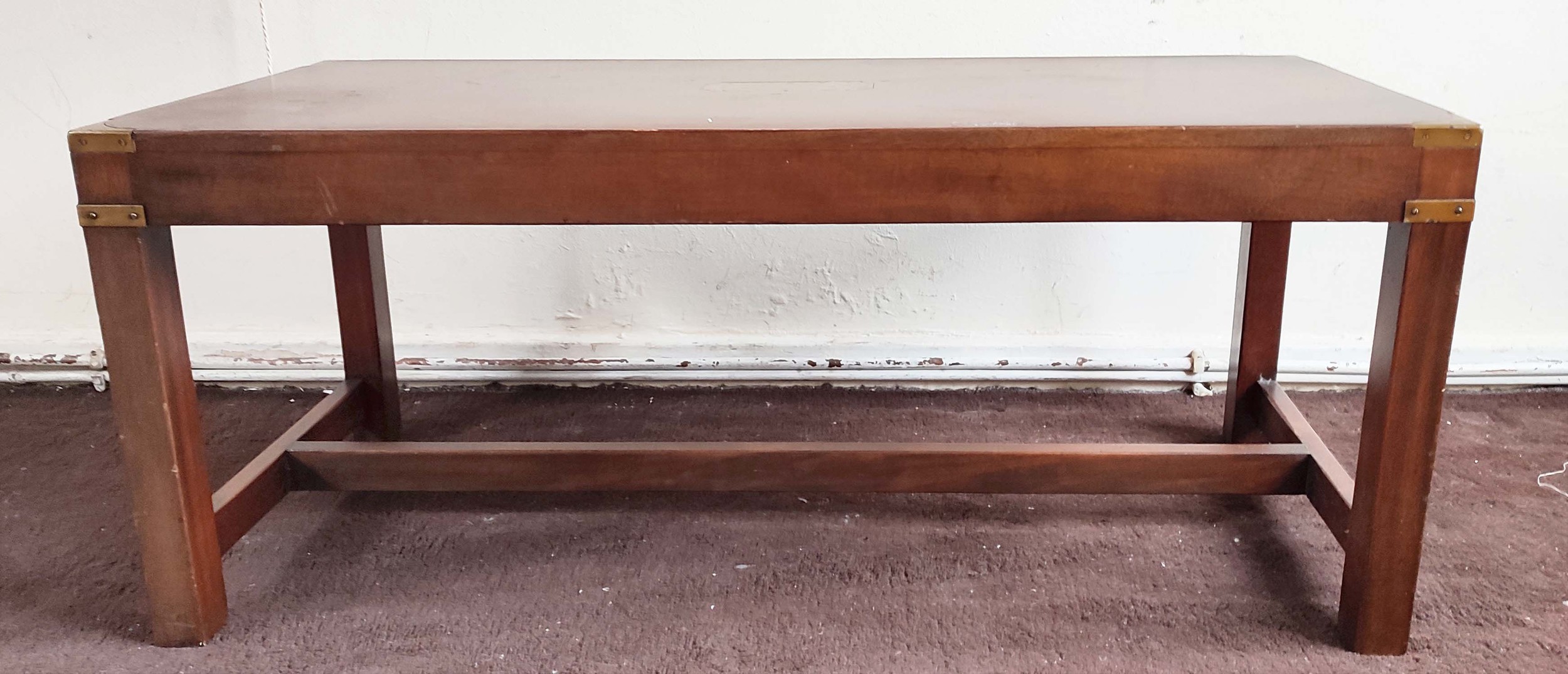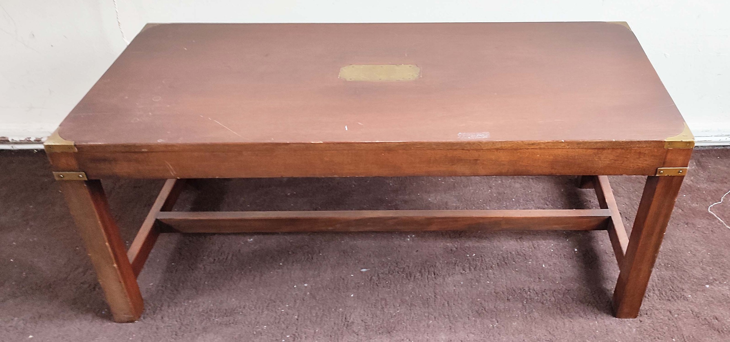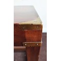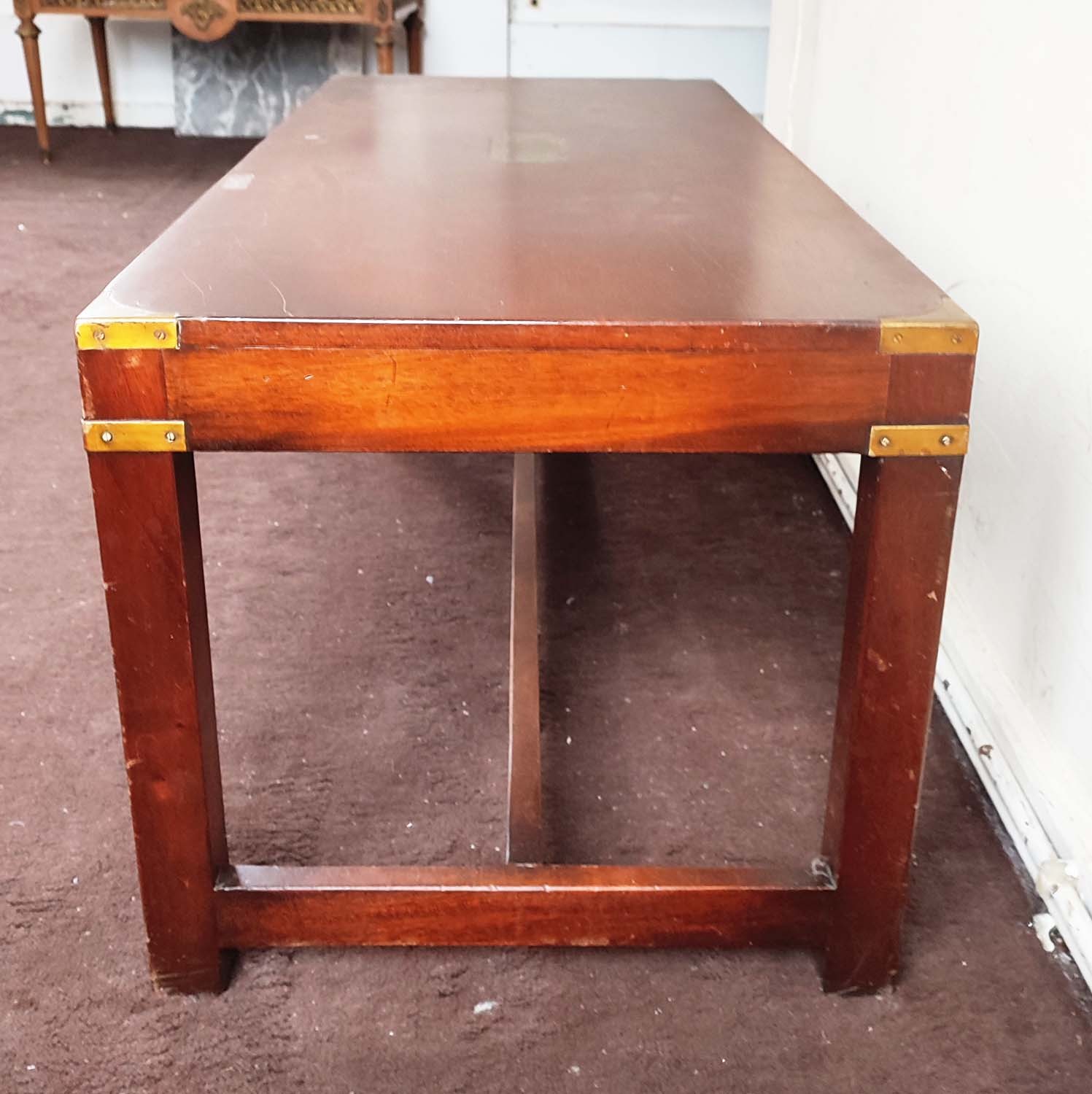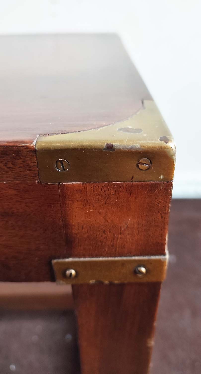 LOW TABLE, 43cm H x 107cm W x 46cm D, campaign style mahogany and brass bound.