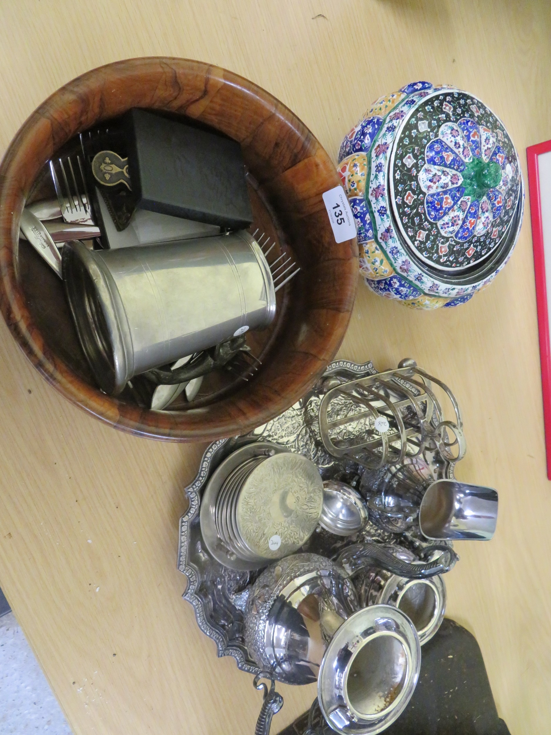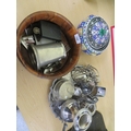 Collection of platedware, wooden bowl and a tin bowl