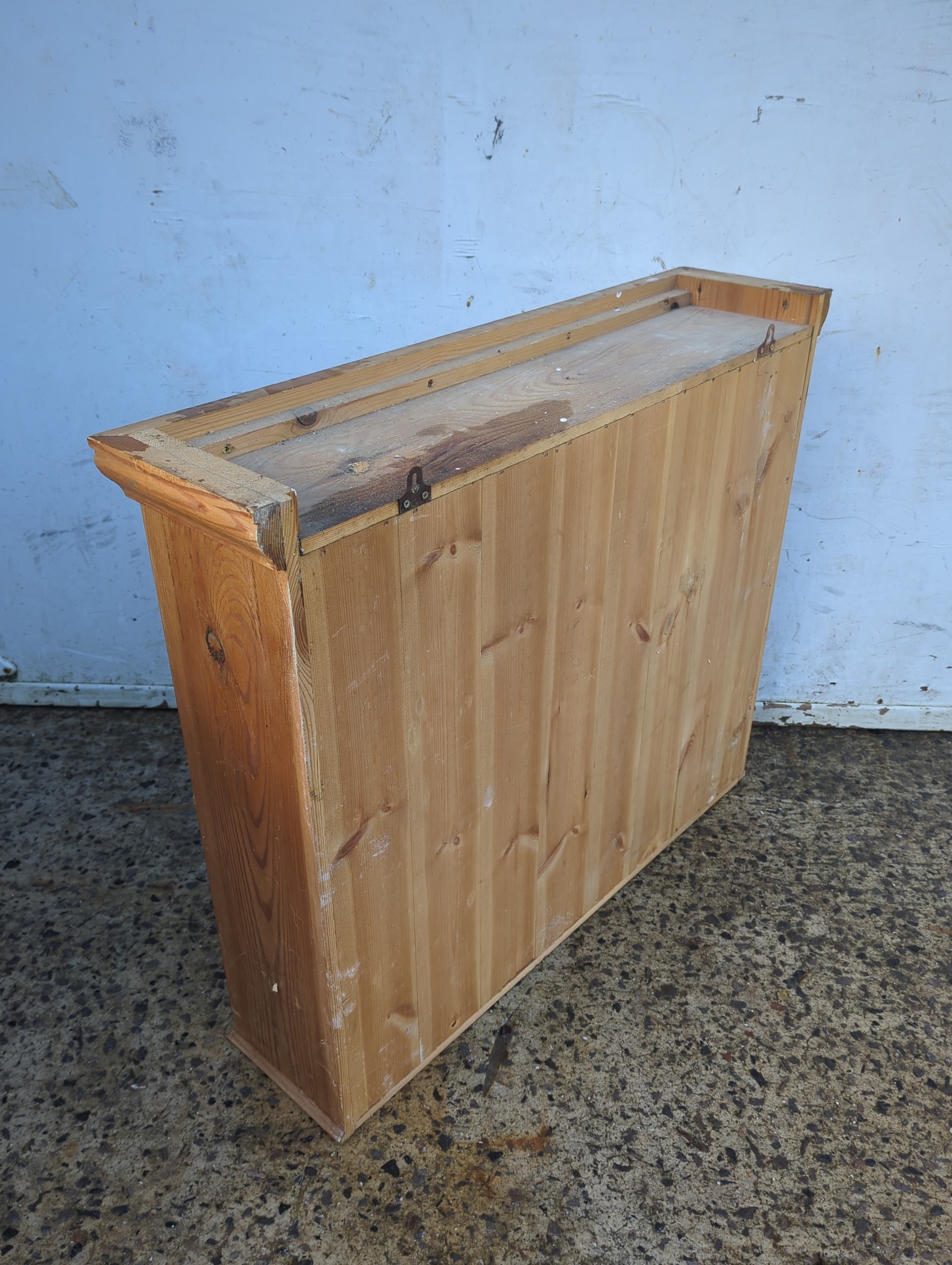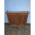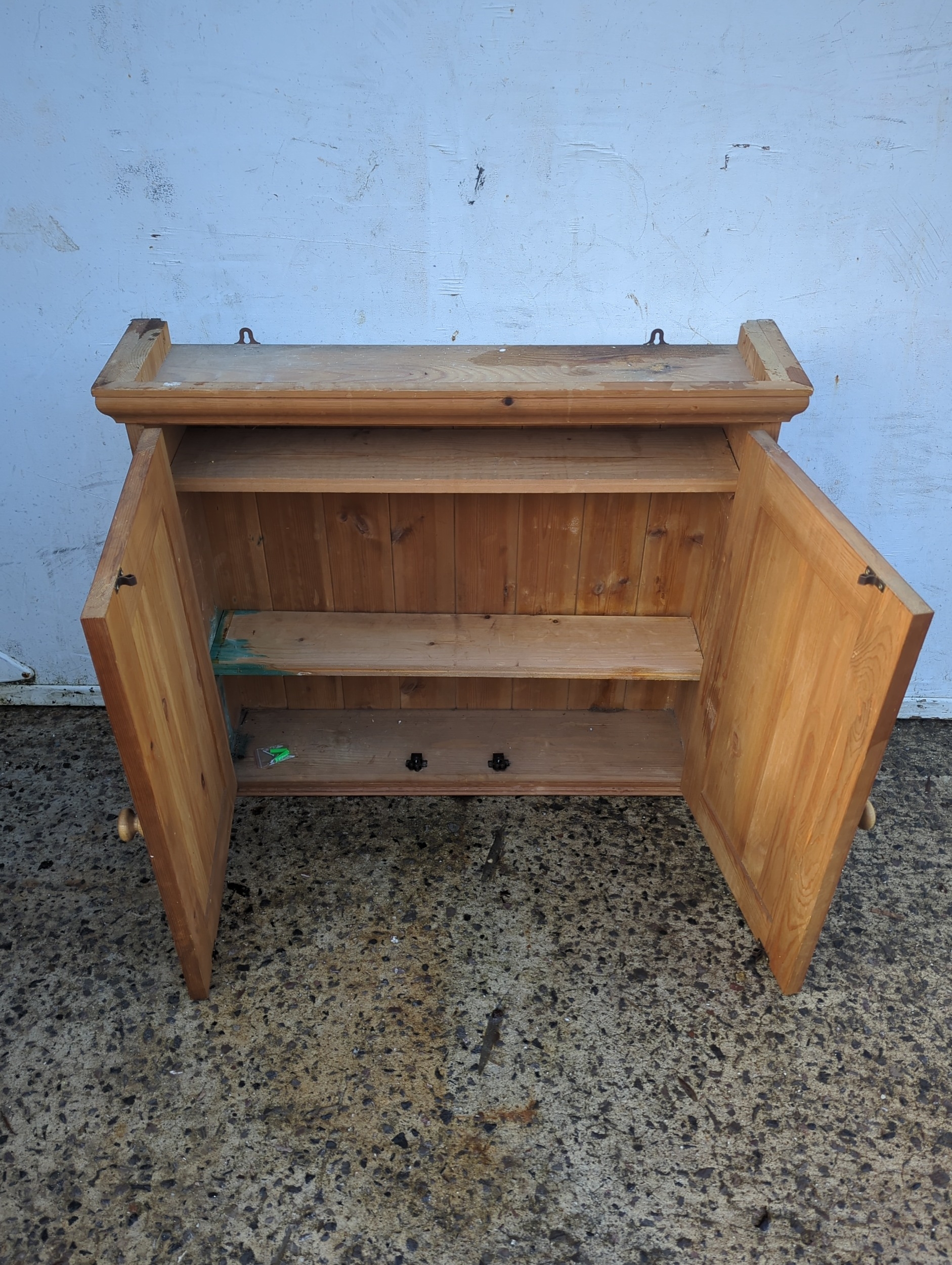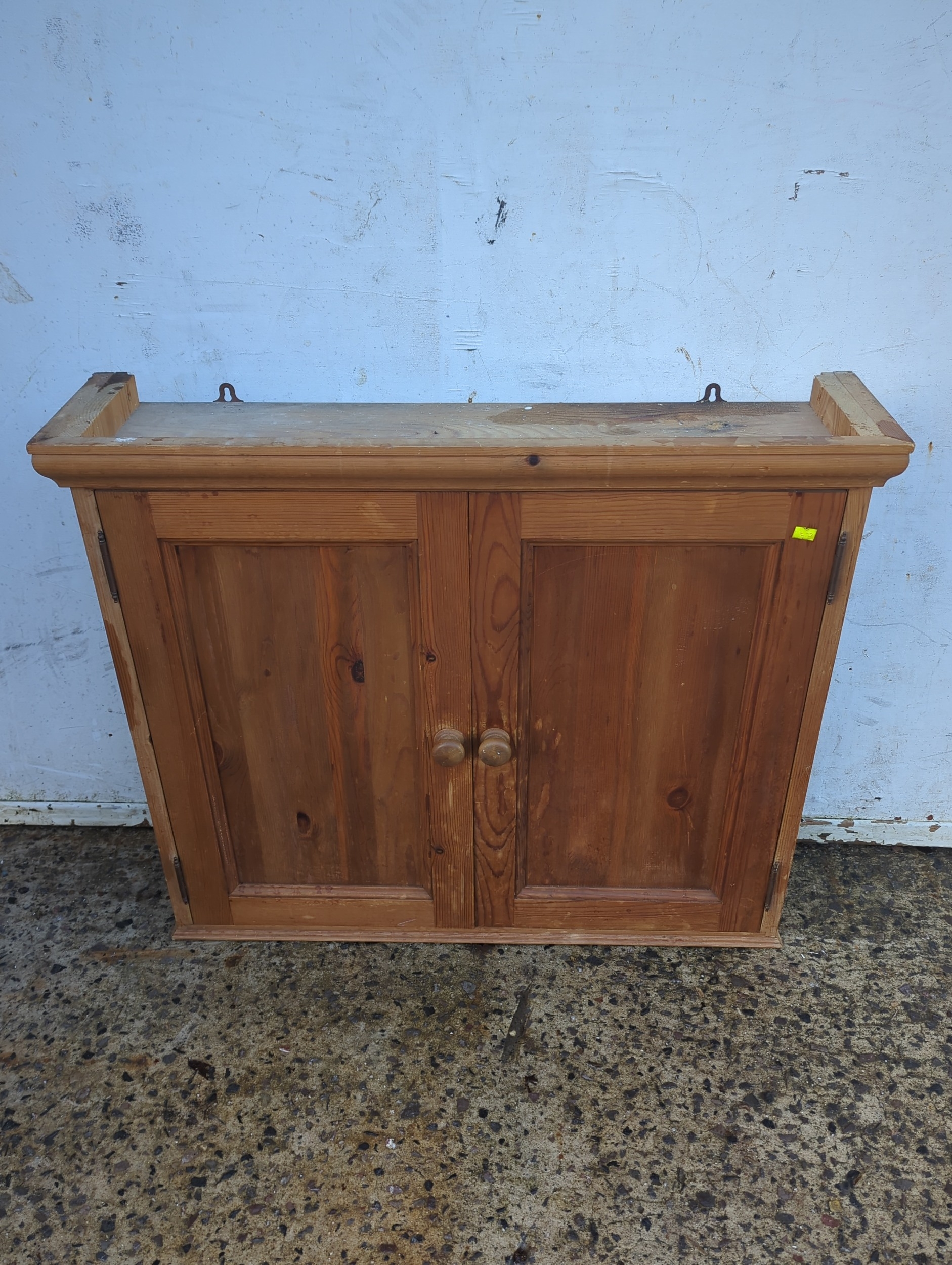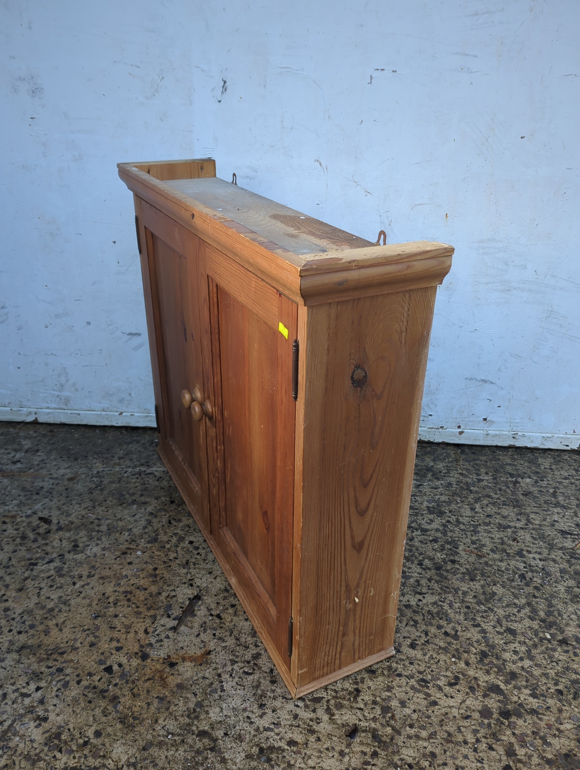 This pine wall cabinet features two panelled doors with wooden knobs, offering generous storage space inside. It is designed to be wall-mounted, with sturdy brackets on either side for secure attachment. The cabinet showcases a natural pine finish, adding a rustic charm suitable for various interior styles.