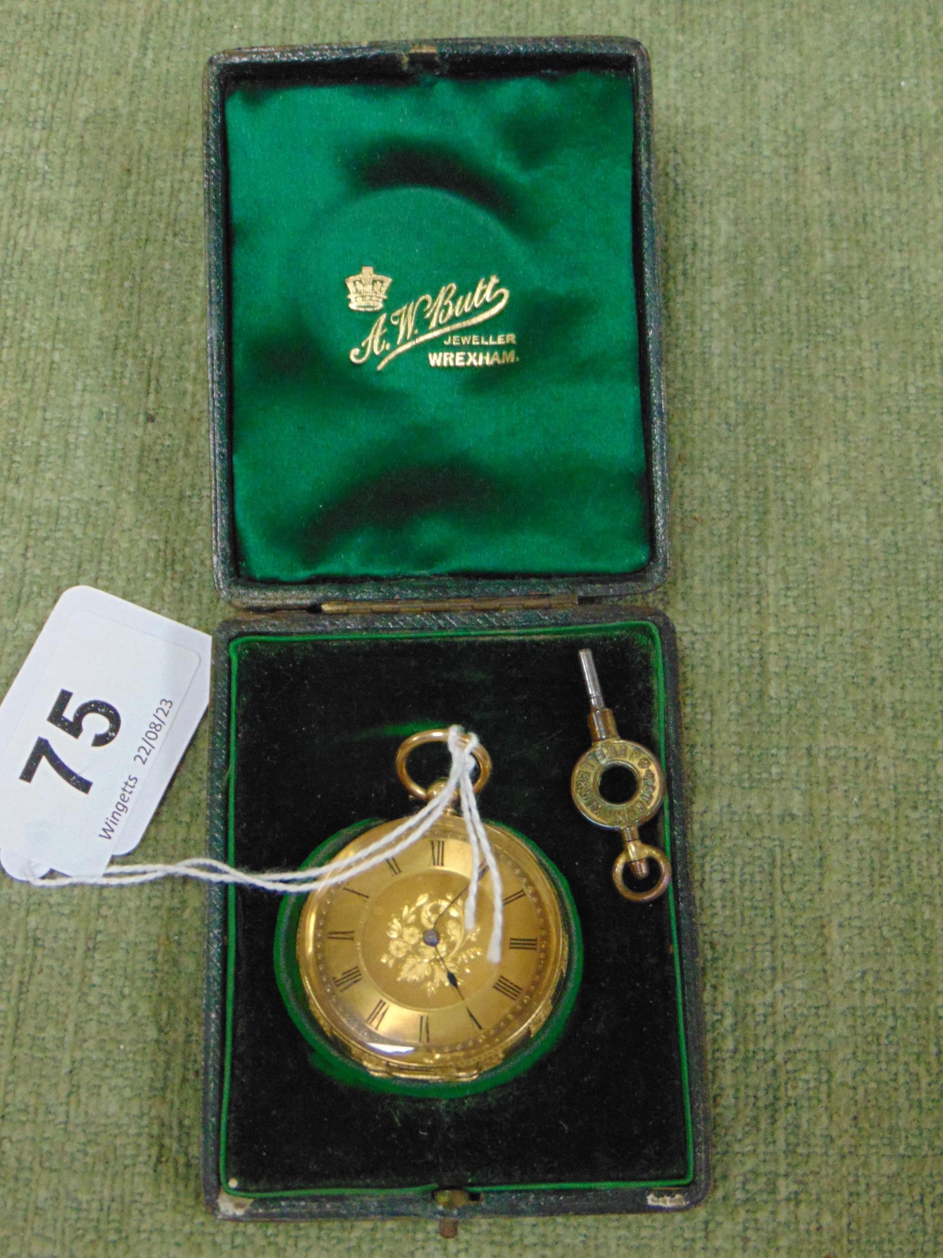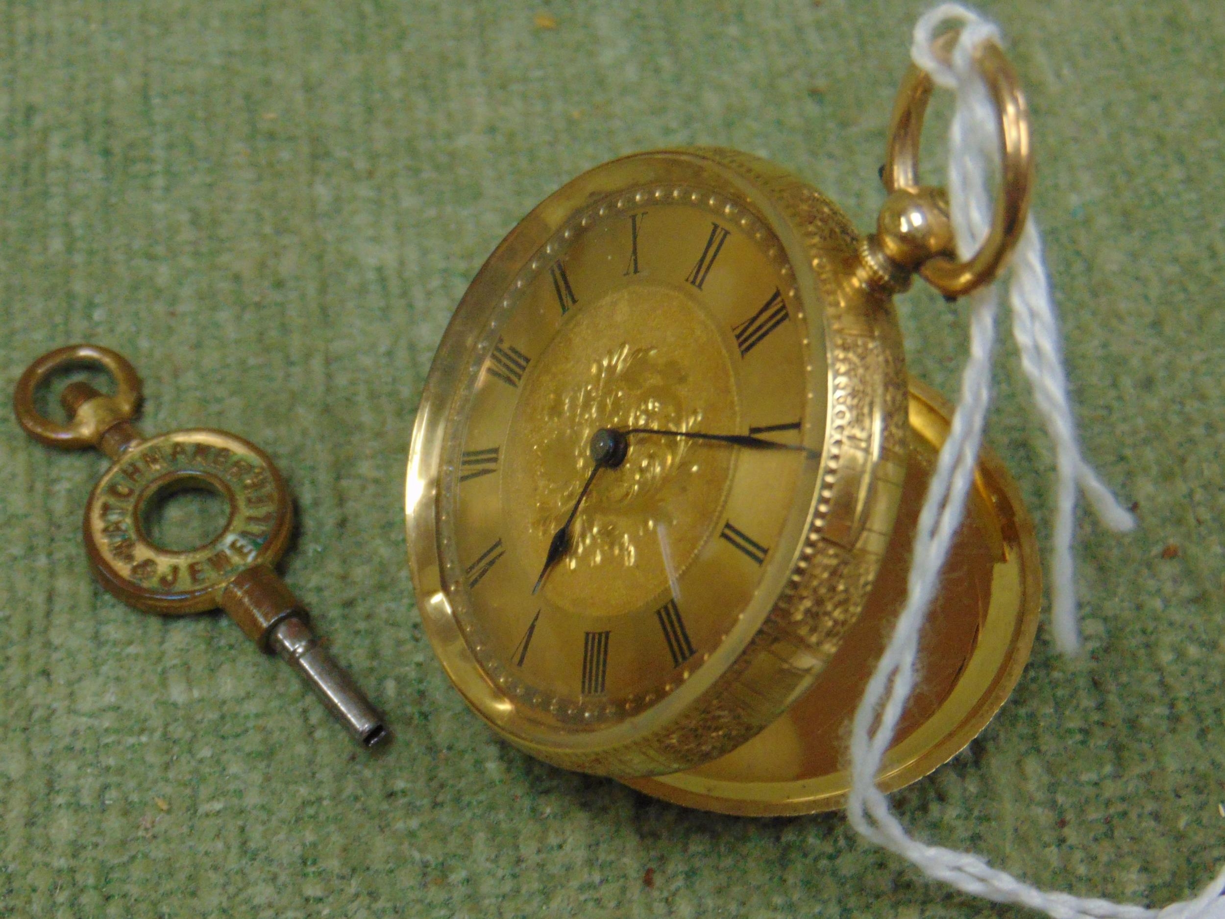 Antique pocket watch, having Roman numerals and engraved decoration, marked 18 k .