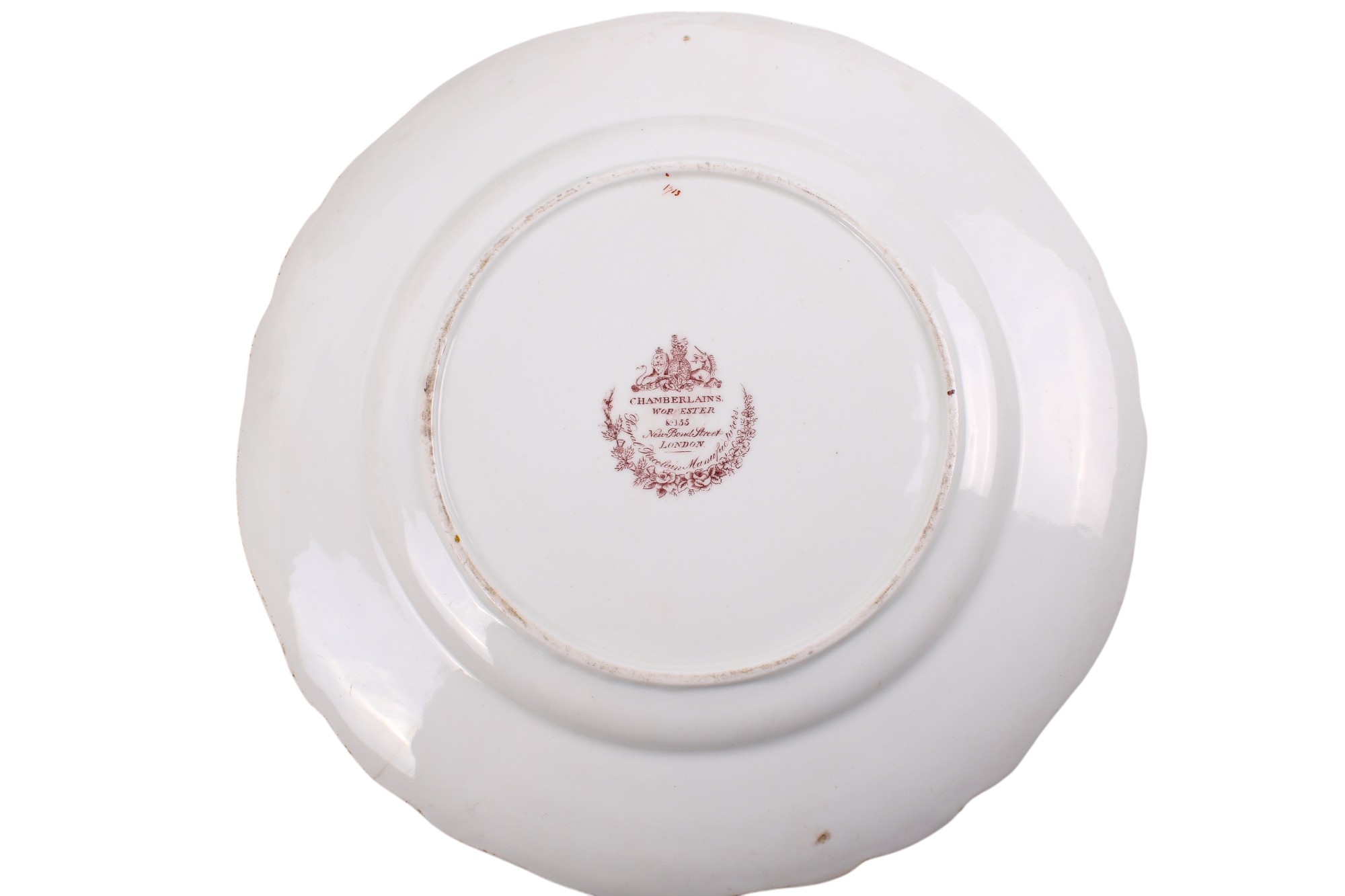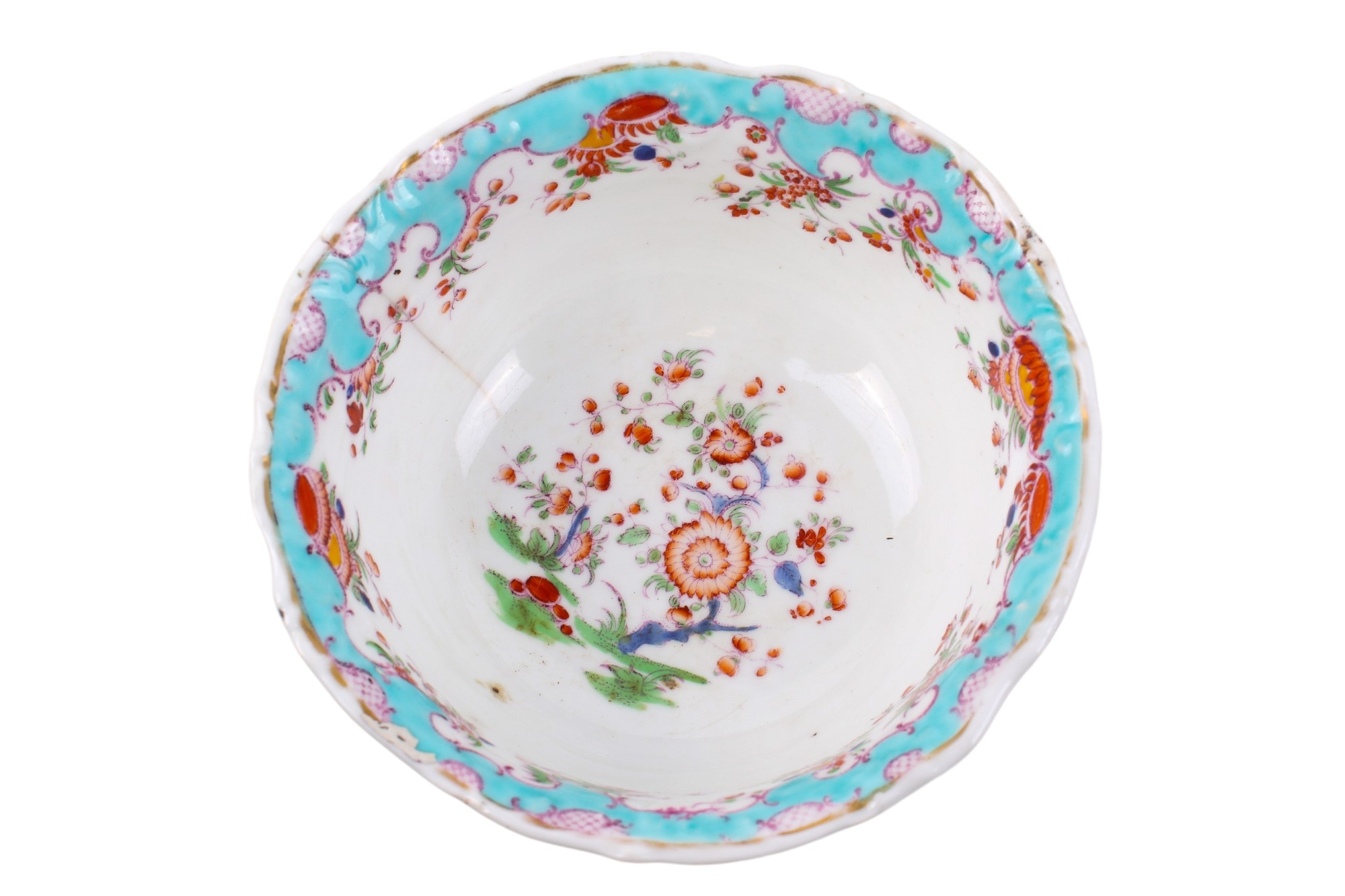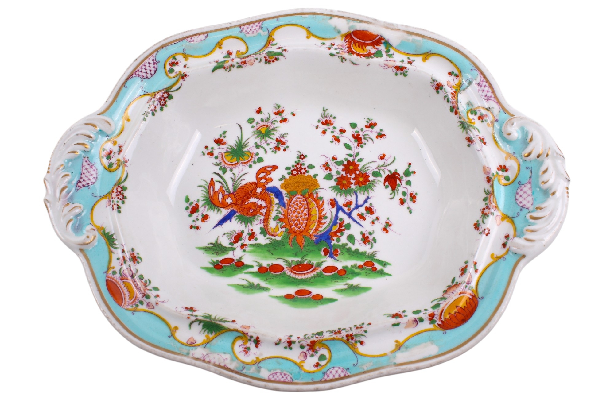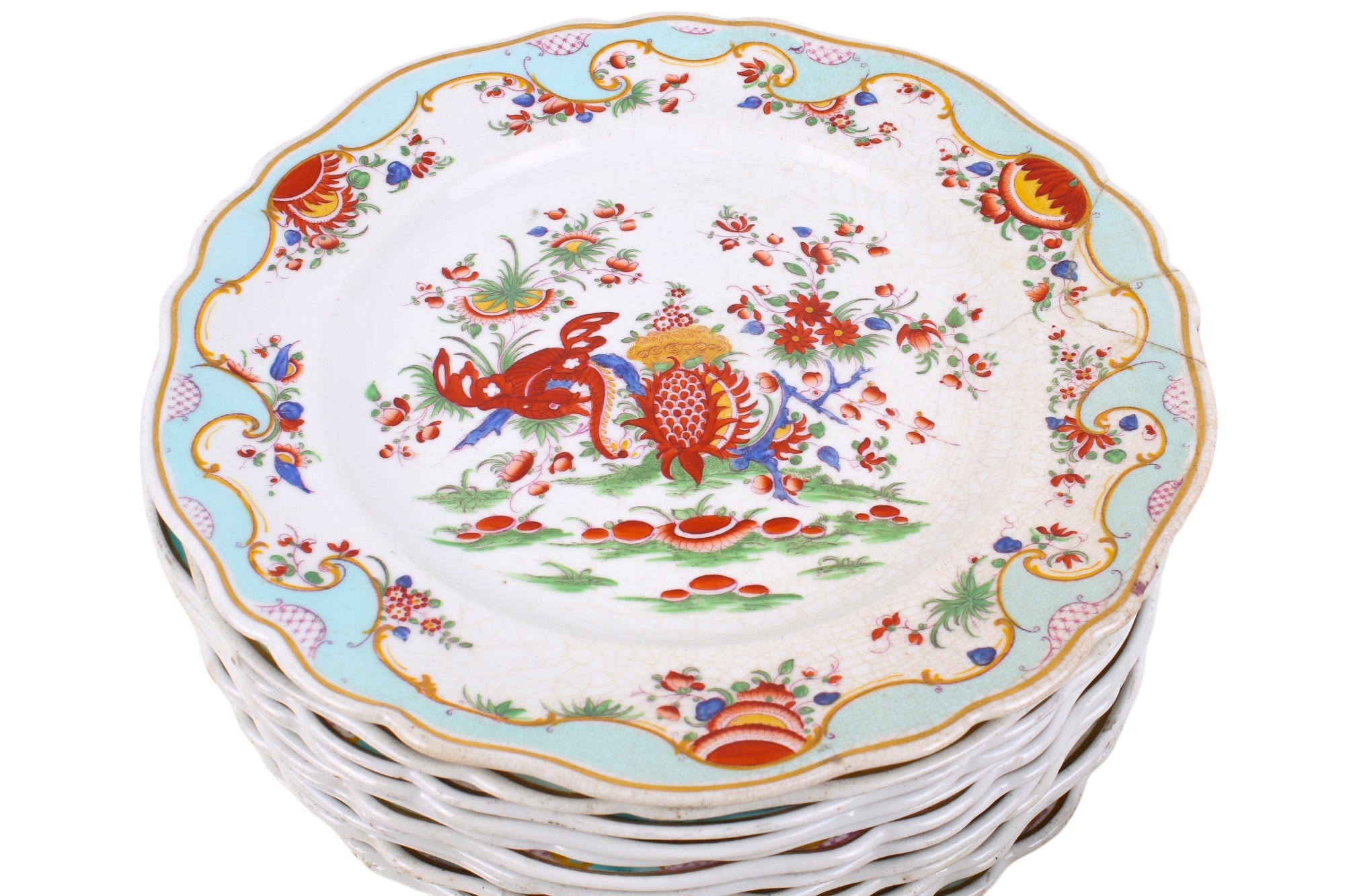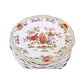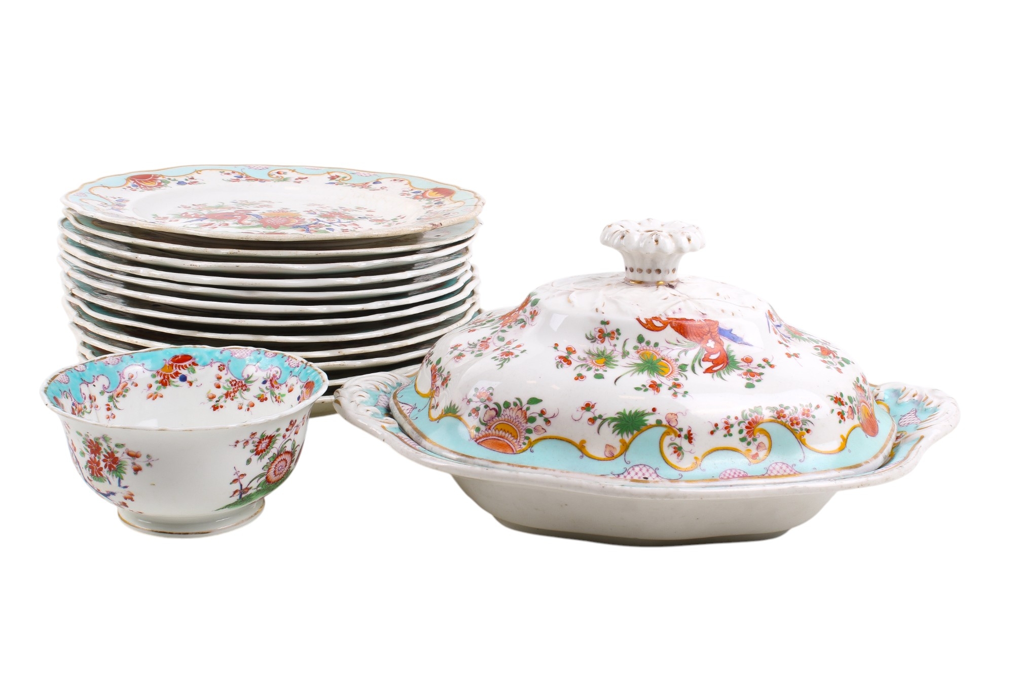 A 19th century or later Chamberlain's Worcester part dinner service in the 'Jabberwocky' pattern. Comprising a lidded tureen, twelve plates and a bowl, painted in the Kakiemon palette with polychrome enamels, depicting mythical beasts amongst flowers, within scrolling turquoise and gilt diaper pattern borders, the bases stamped with a brown mark topped with a royal crest, plates Diameter 26cm. With a partial original receipt dated 1953