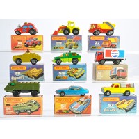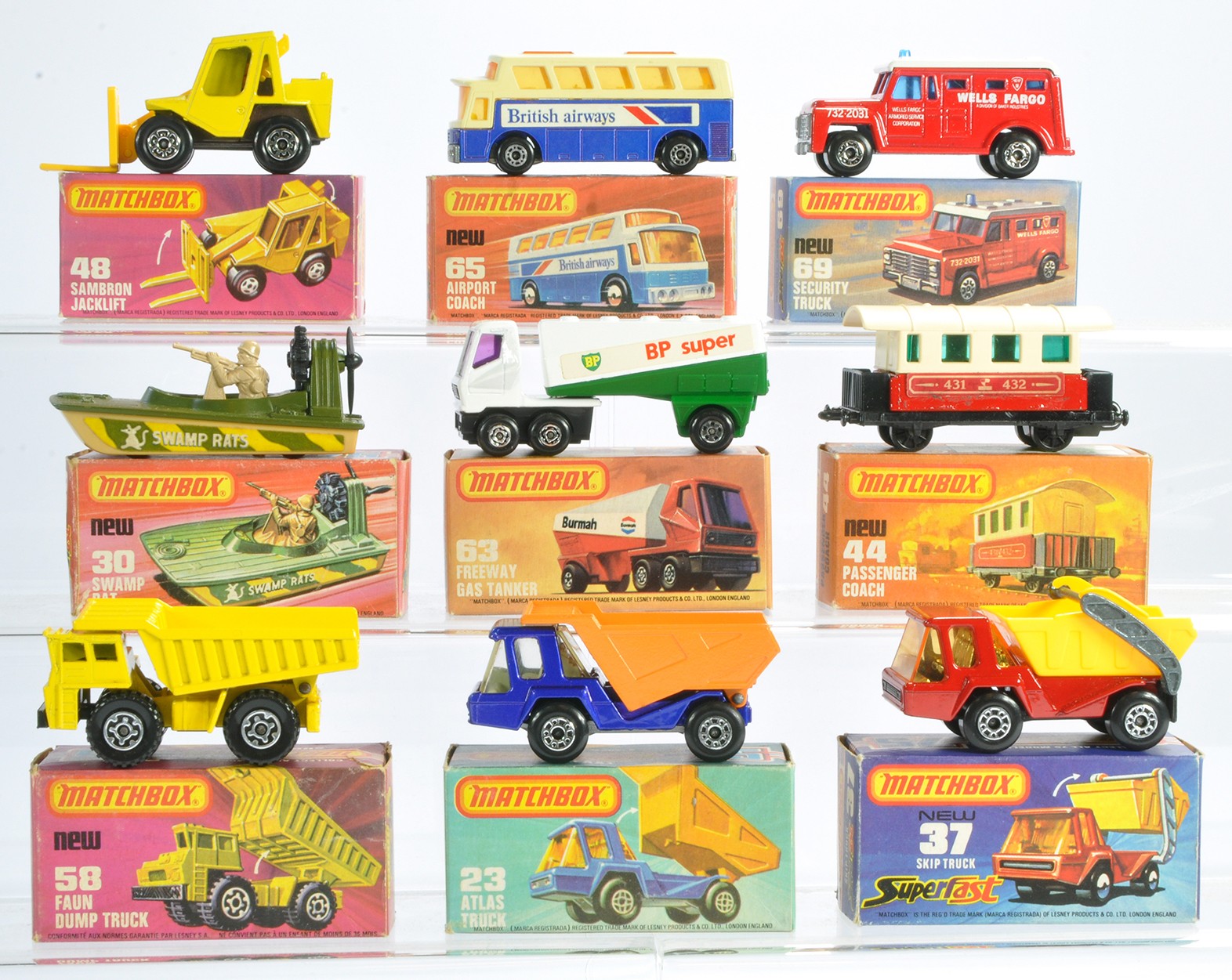 Matchbox Superfast comprising nine boxed issues as shown. Security Truck, Atlas truck, Skip Truck etc. Mostly very good or excellent in mostly very good/excellent boxes. Generally Ex-Shop Stock.