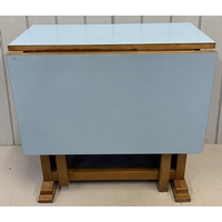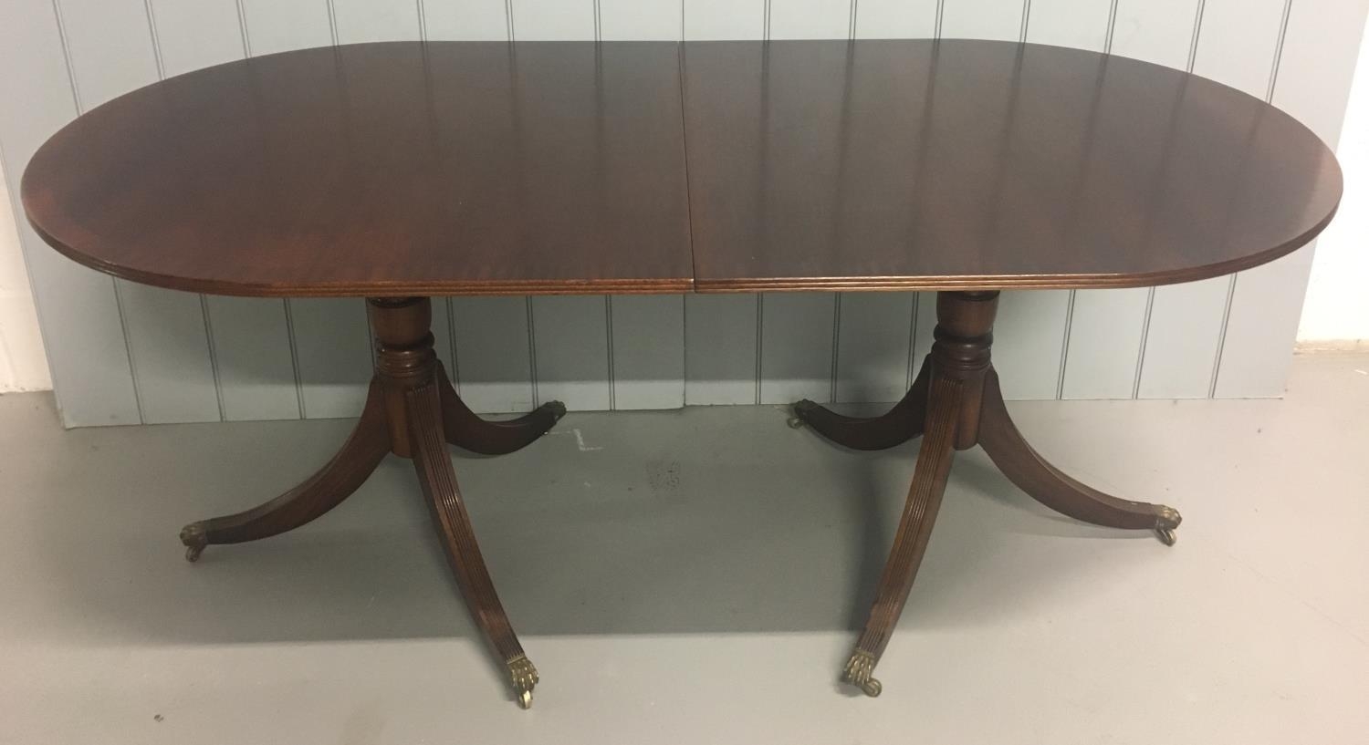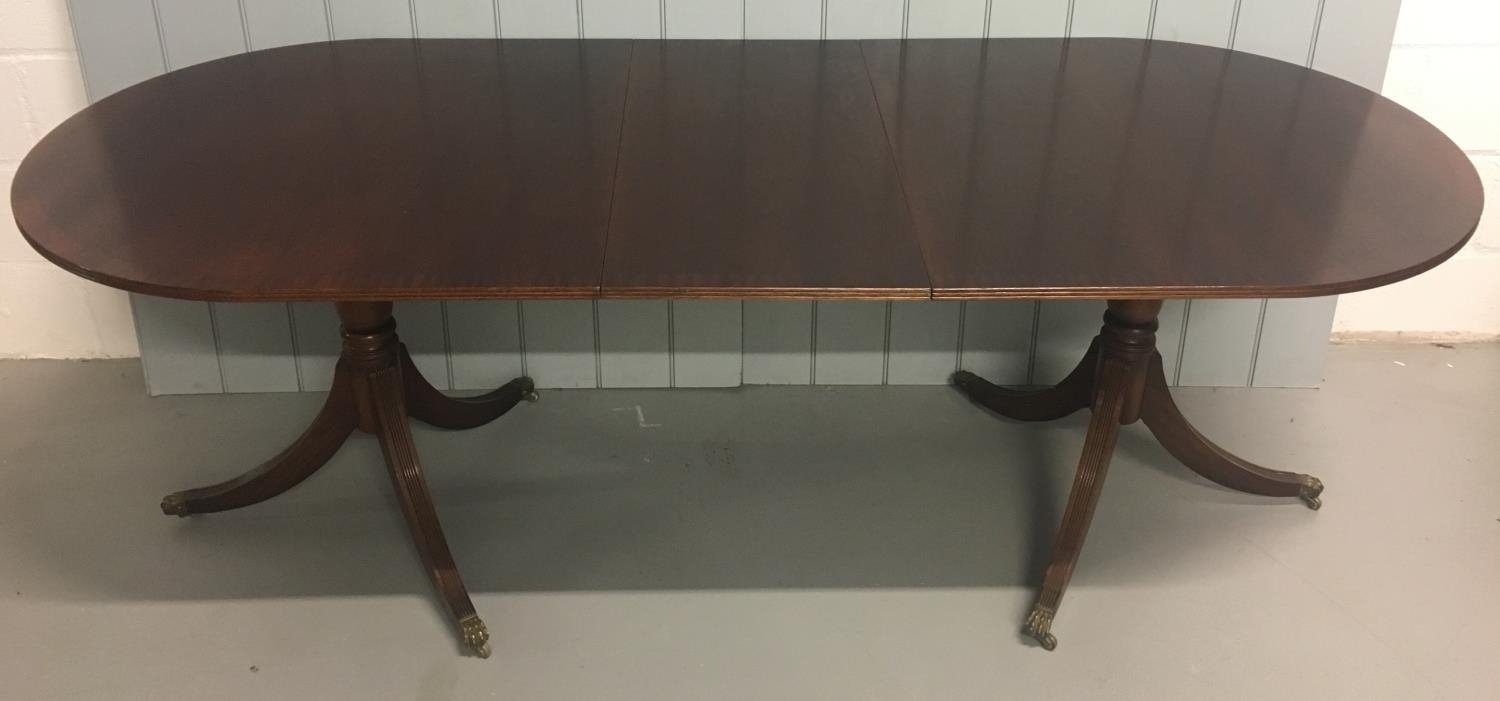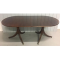 Oval shaped, on twin pedestal legs and brass castors. Extends from a 6 seater to an 8 seater.