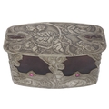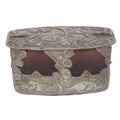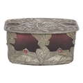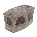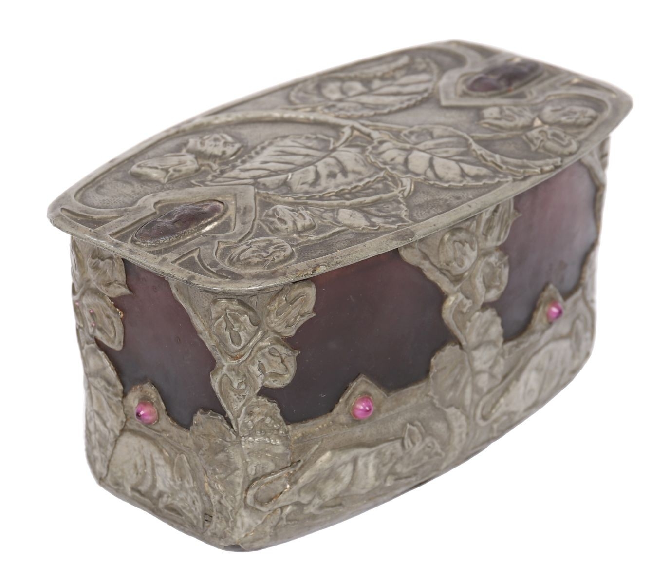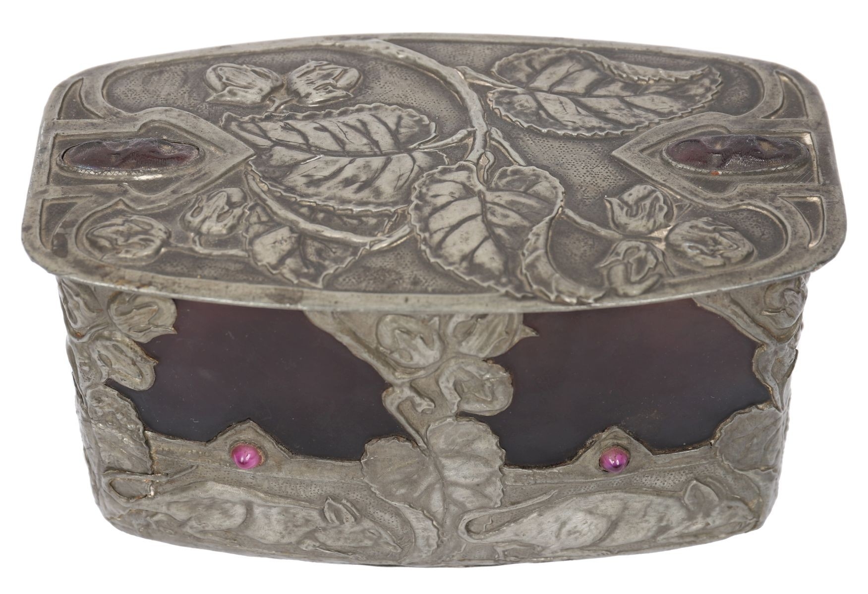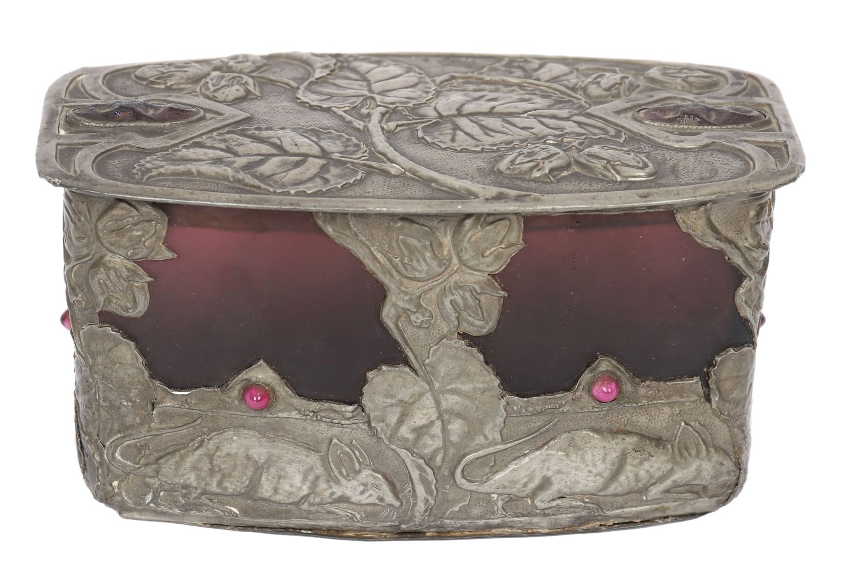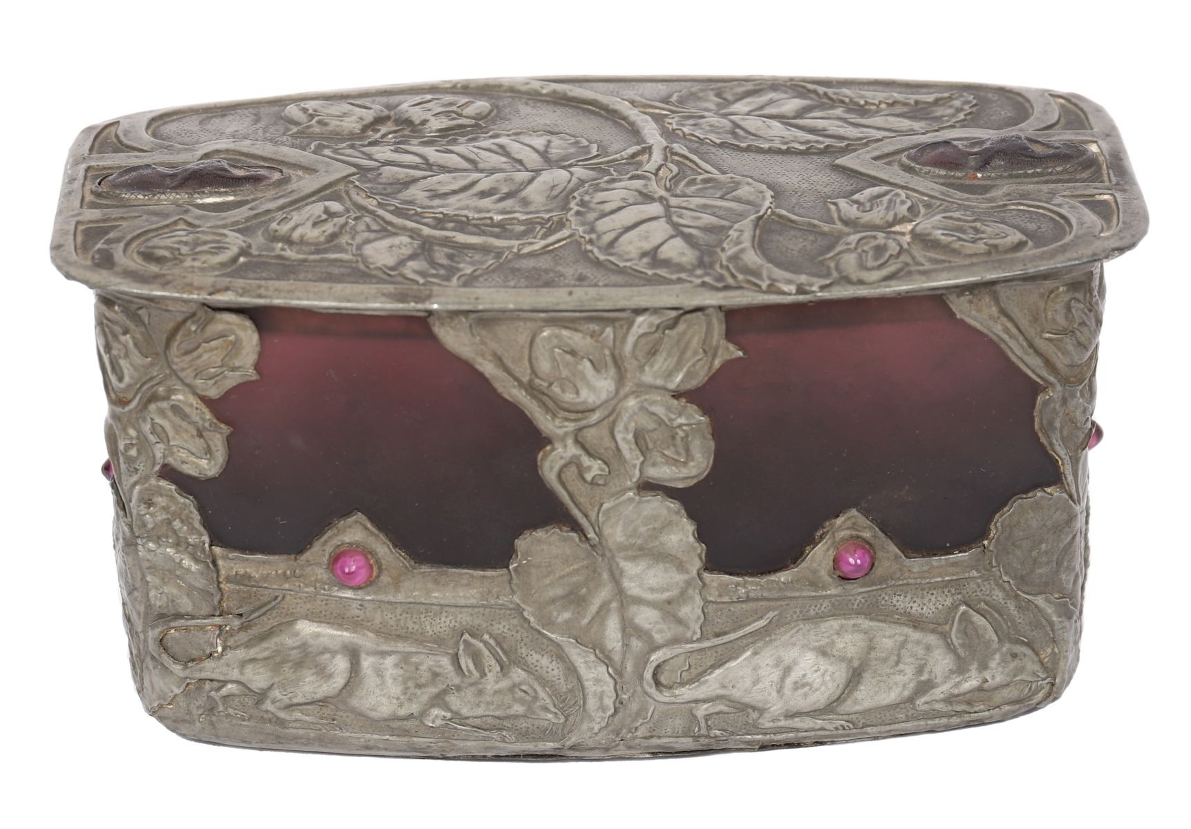 Rectangular glass box and cover, the glass moulded and shaded in amethyst-purple tones, mounted with patinated metal mounts applied with stylised foliage and set with inset cabochons. The decoration characteristic of the Art Nouveau period.