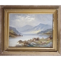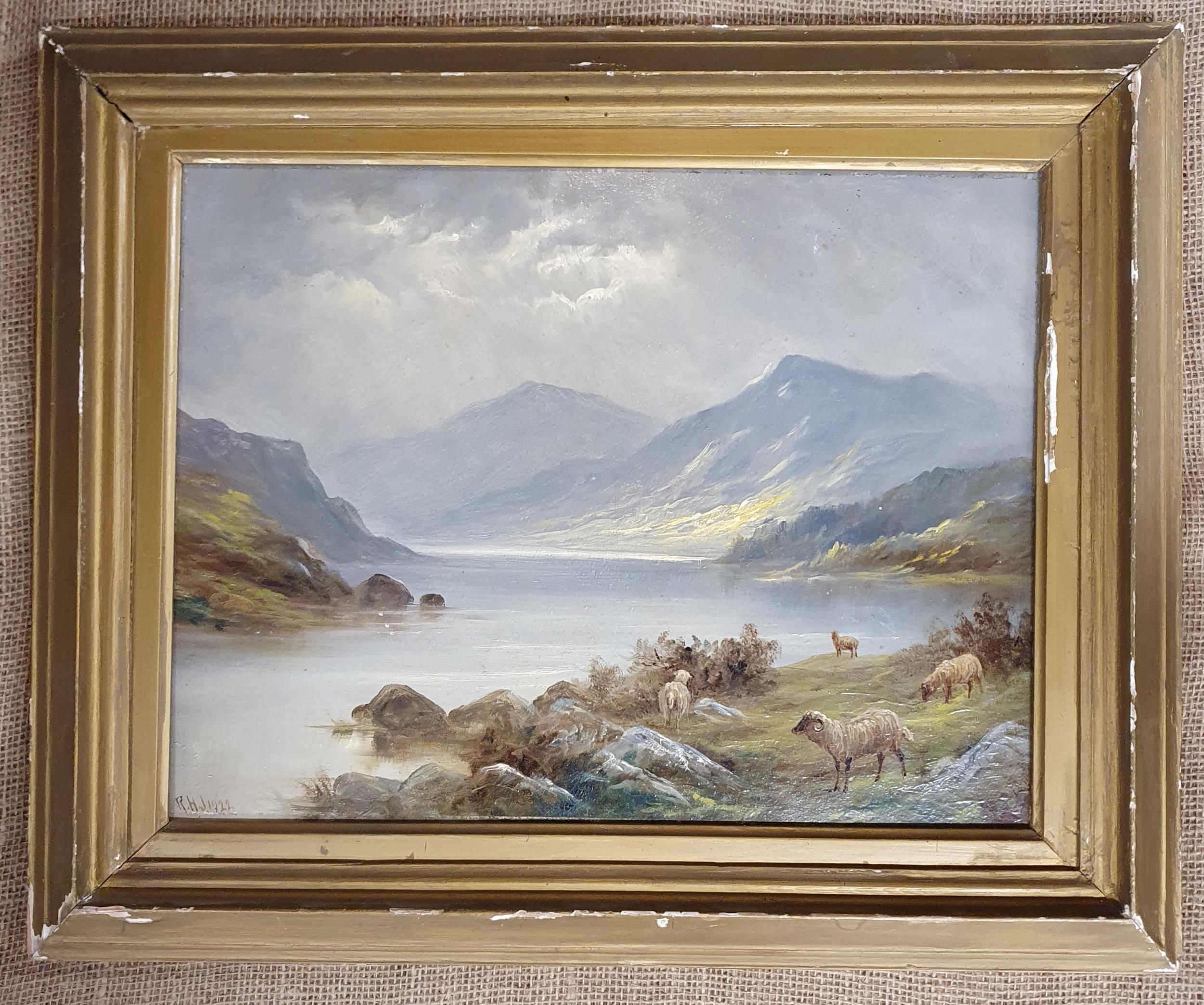 An early 20th Century Oil on Board of a highland scene with sheep. Monogrammed RHJ. LR. Dated 1922. 33 x 42 cm approx.