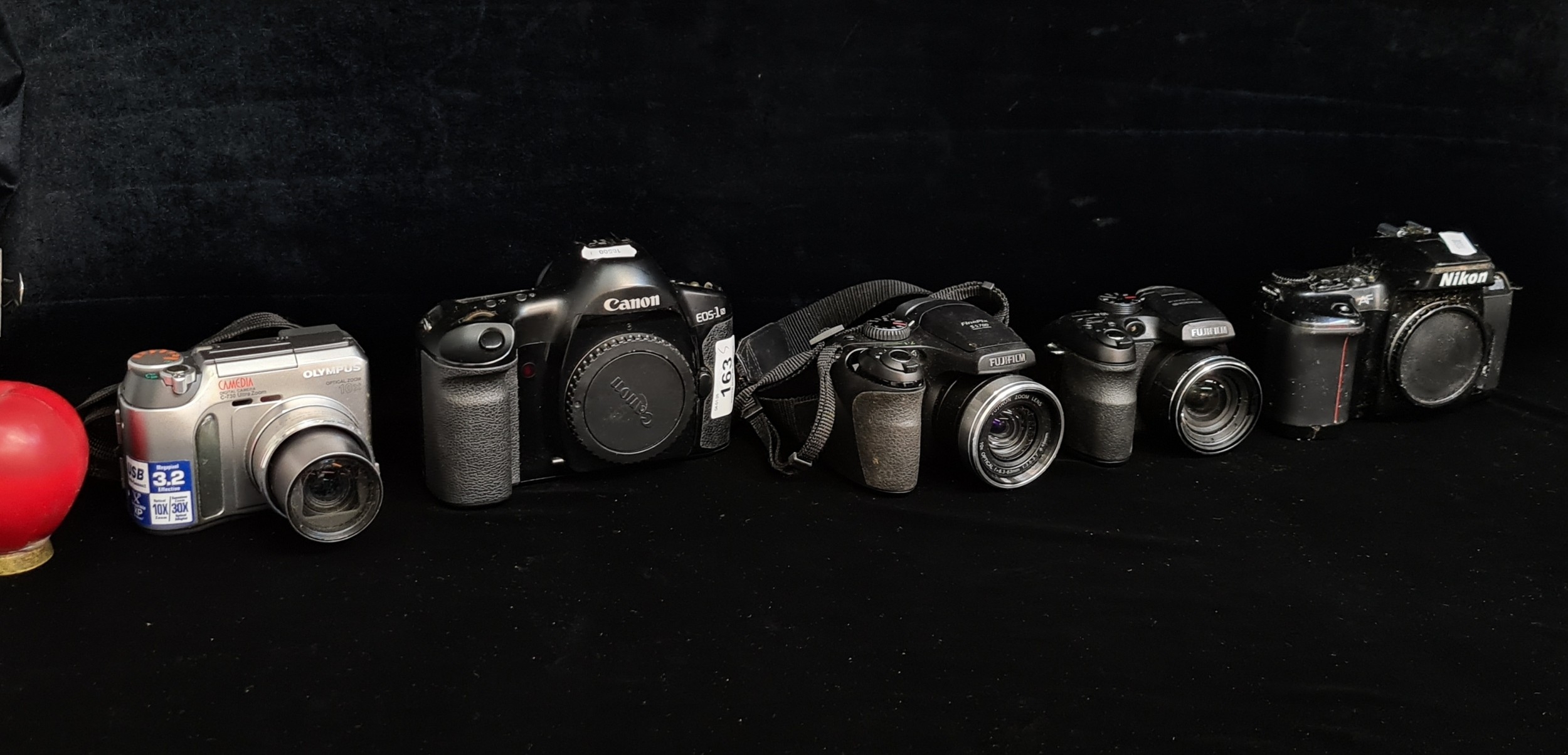 A selection of five cameras, includes a canon EOS-1N, a Nikon F-601 and a FujiFilm S100FD.