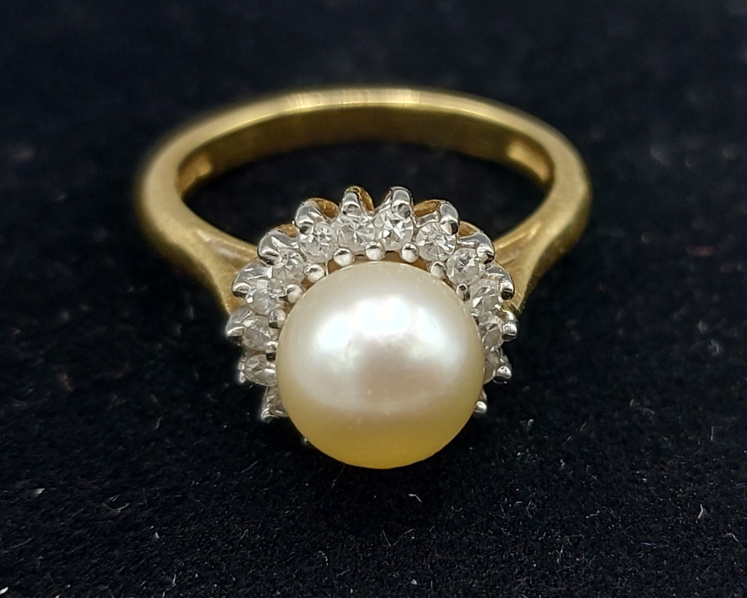 An 18ct gold ring set with a large central Pearl surrounded by Diamonds, 5.2gms, ring size M