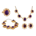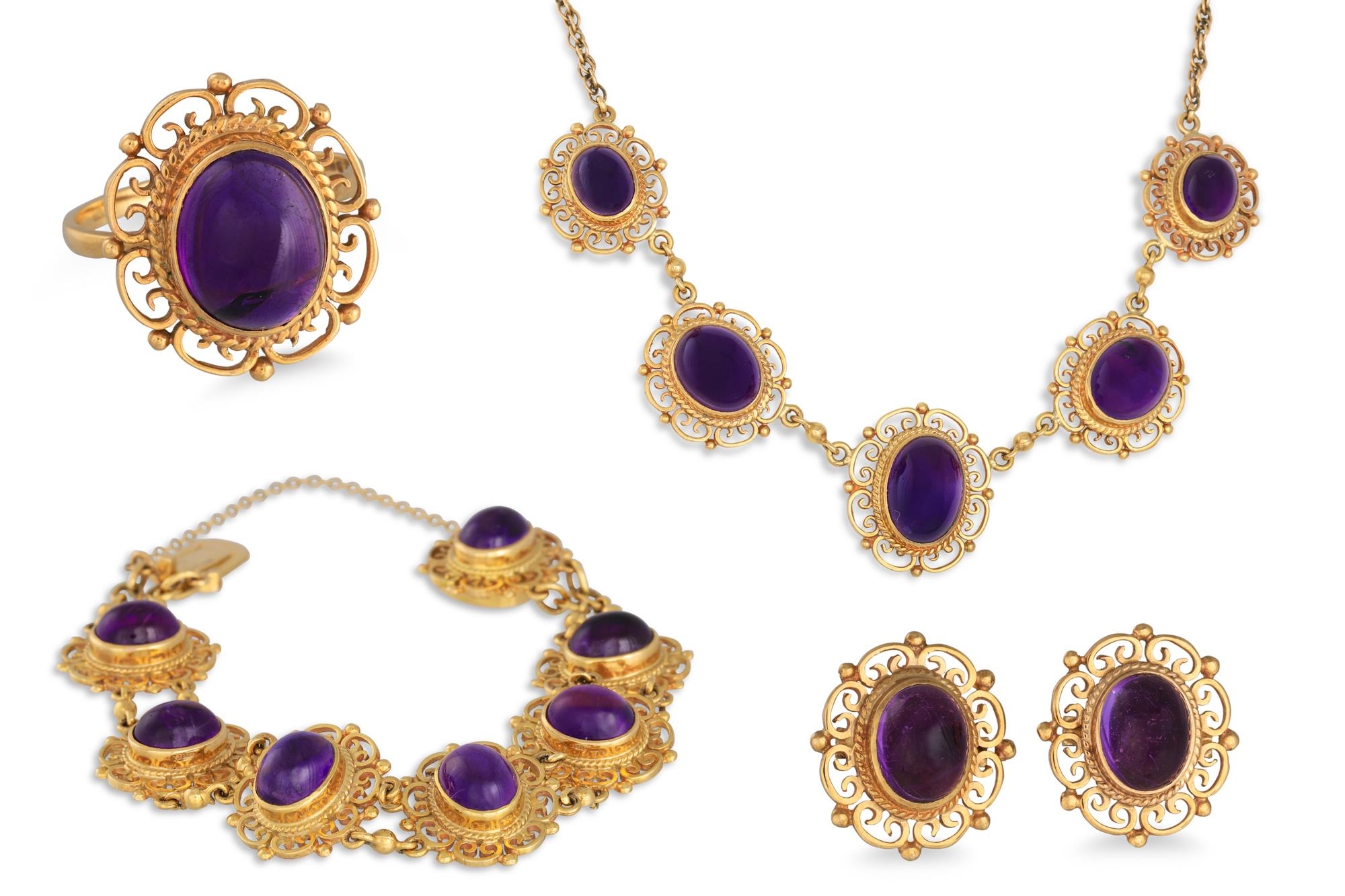 A SUITE OF AMETHYST CABOCHON JEWELLERY, mounted in 9ct yellow gold. Comprising a necklace, bracelet, ring and matching earrings, canetille work to surrounds (Gross weight 57.3 g)