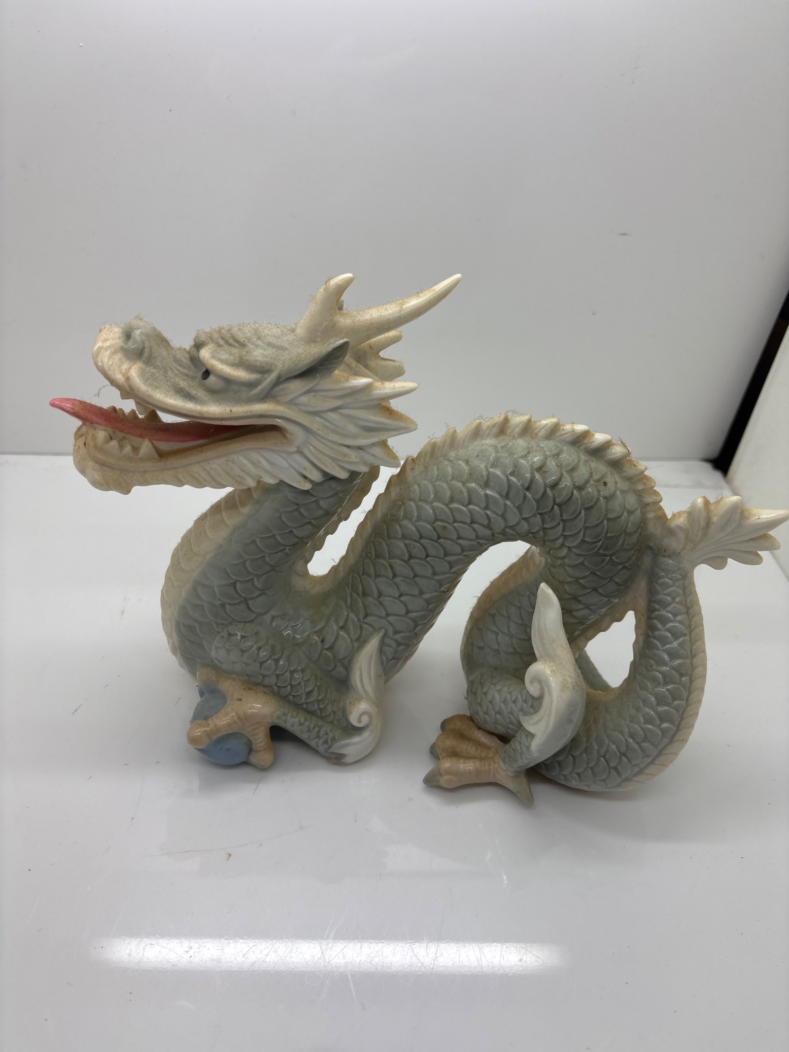 Ceramic dragon figurine with detailed scales and a curved body.