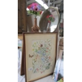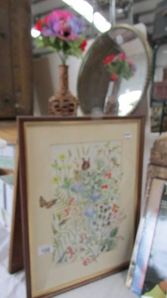 A framed and glazed floral print, a metal framed circular flower and a vase of silk anemone's.