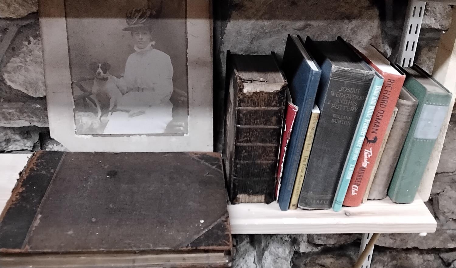 An early 19th century leather bound Bible with Society for Promoting Christian Knowledge embossed to the front cover, an album containing a quantity of sepia photographs, a large portrait of an Edwardian lady and her dog, etc (10)