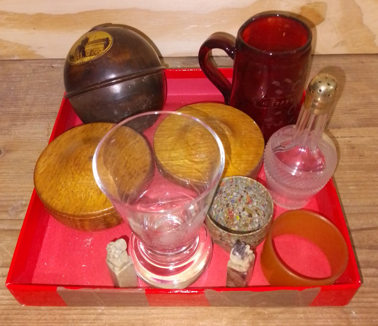A tray of assorted glass and treen.
