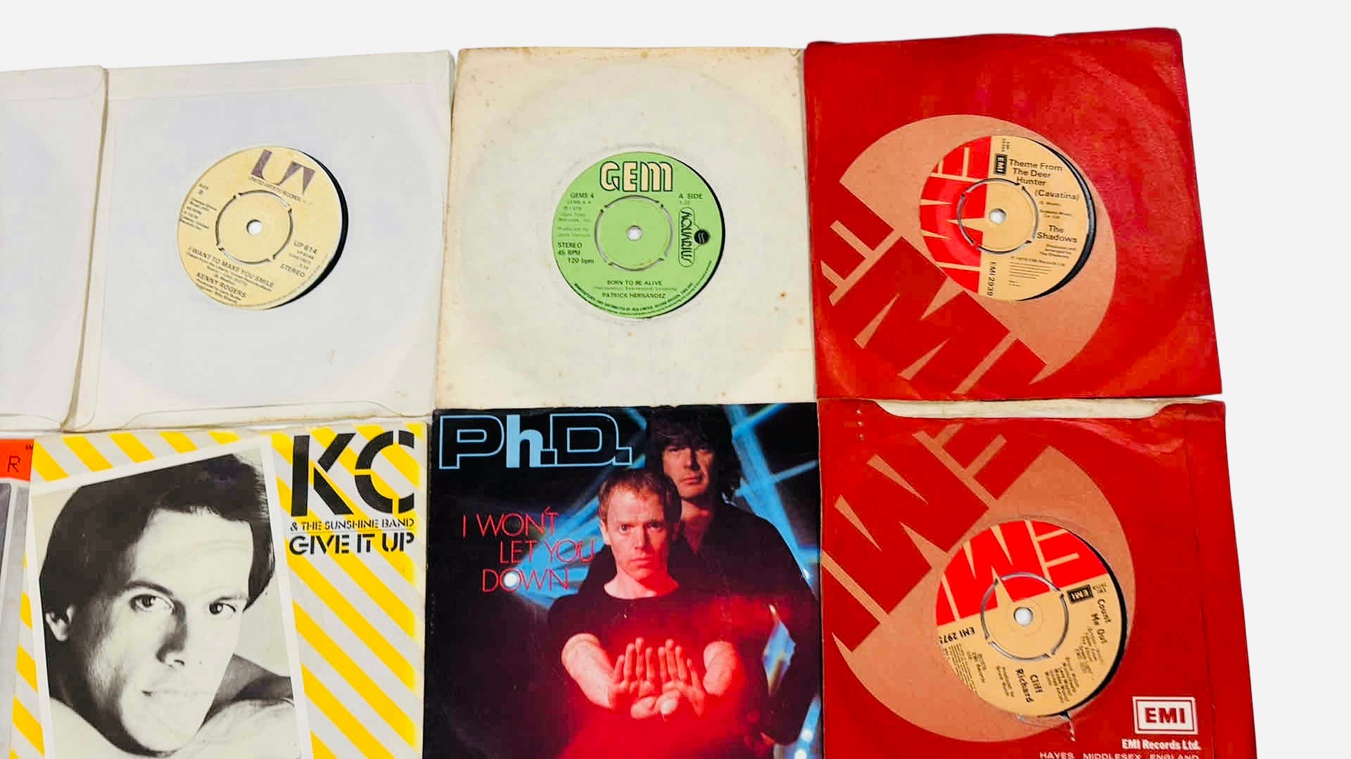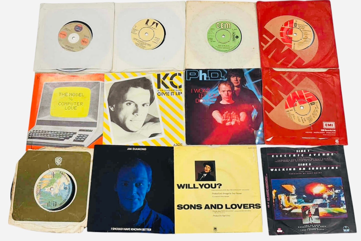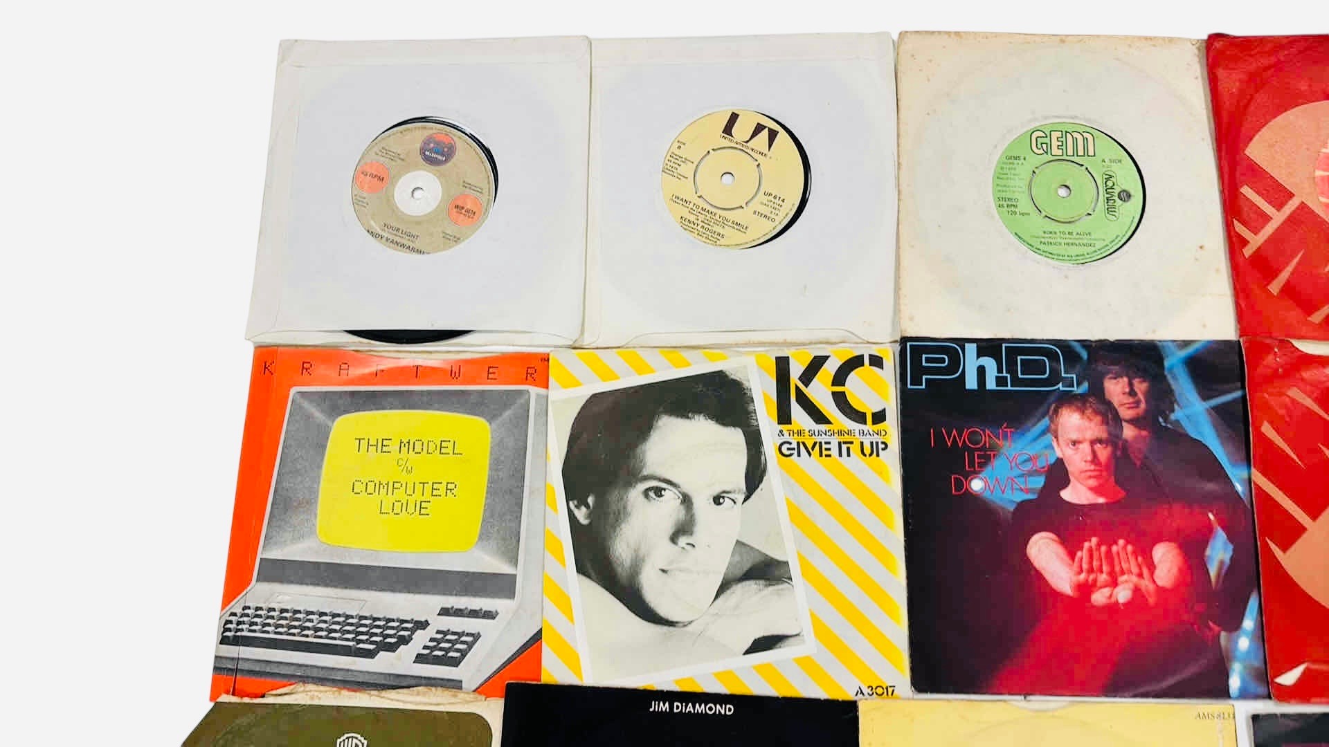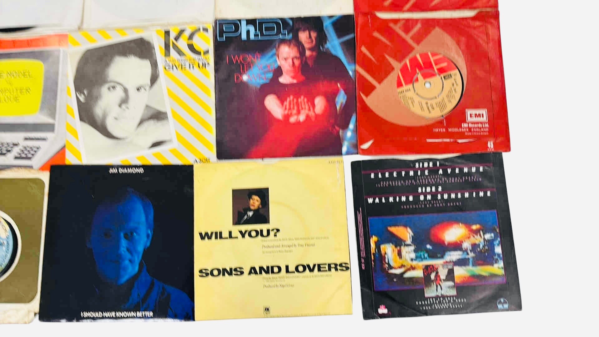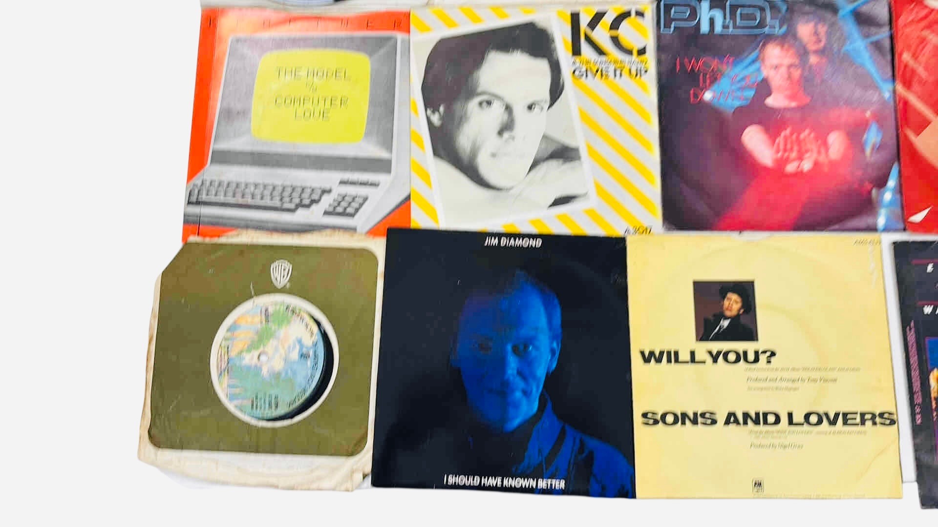 A group of pop and electronic 7-inch vinyl singles, in original picture sleeves and company bags, including titles by Kraftwerk, KC & The Sunshine Band, PhD, and Sons and Lovers.