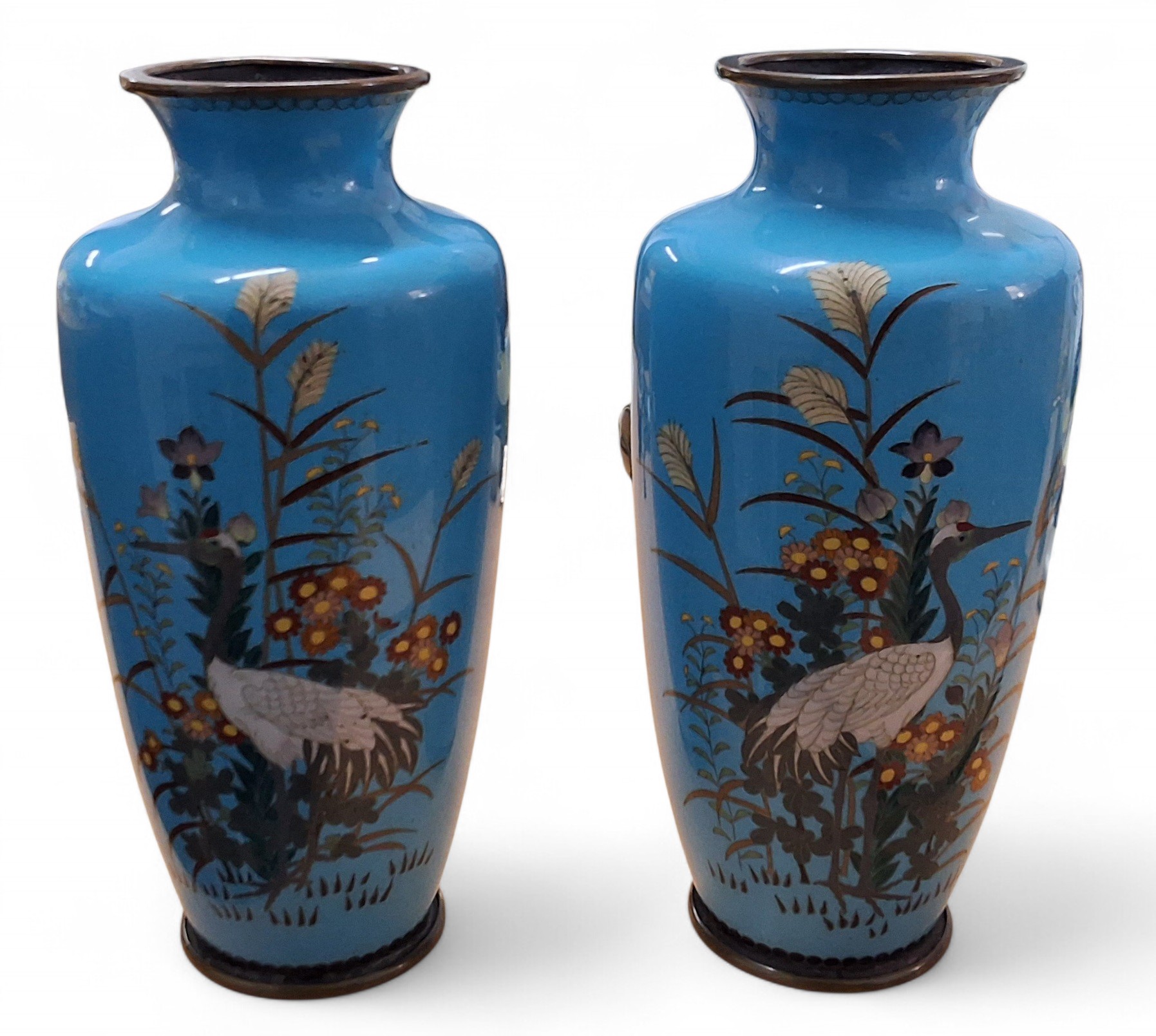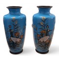 A pair of Japanese cloisonne ovoid vases, enamelled with storks and foliage, on a turquoise ground, 15.5cm high, Meiji period
