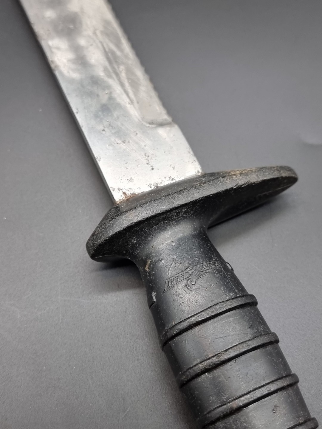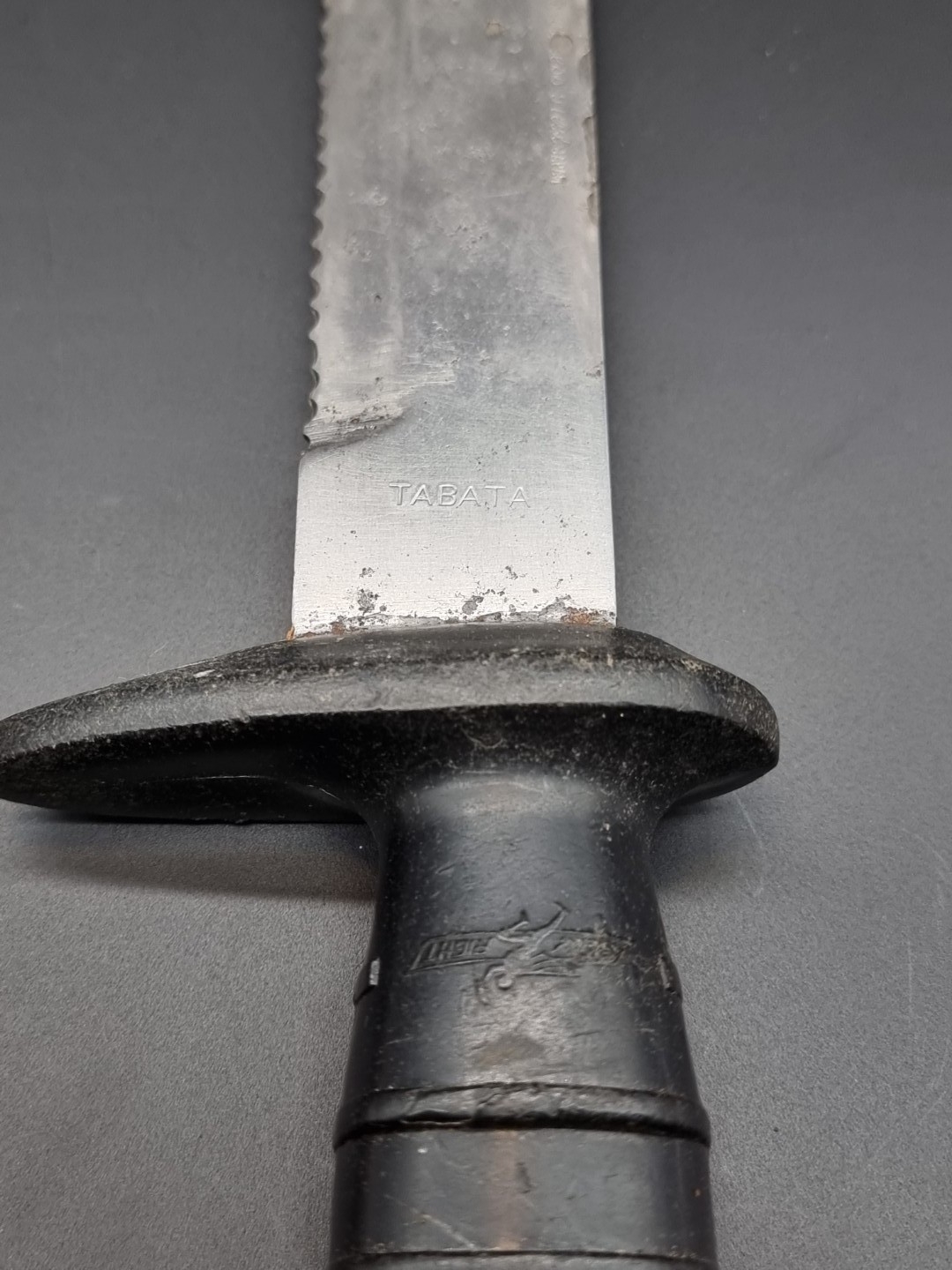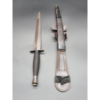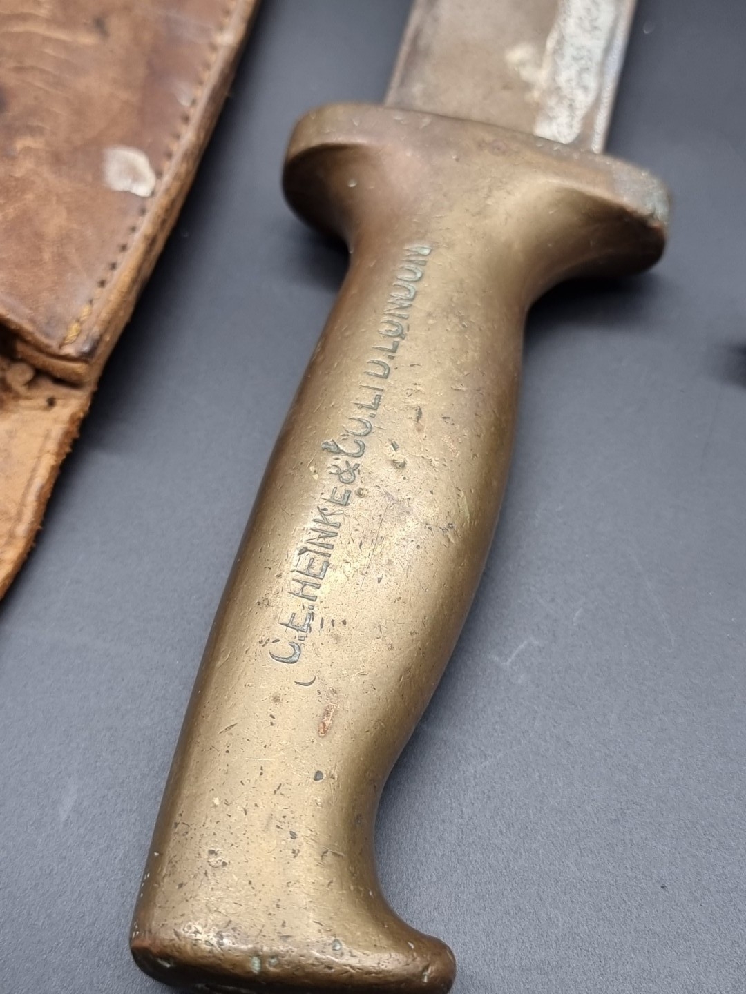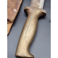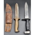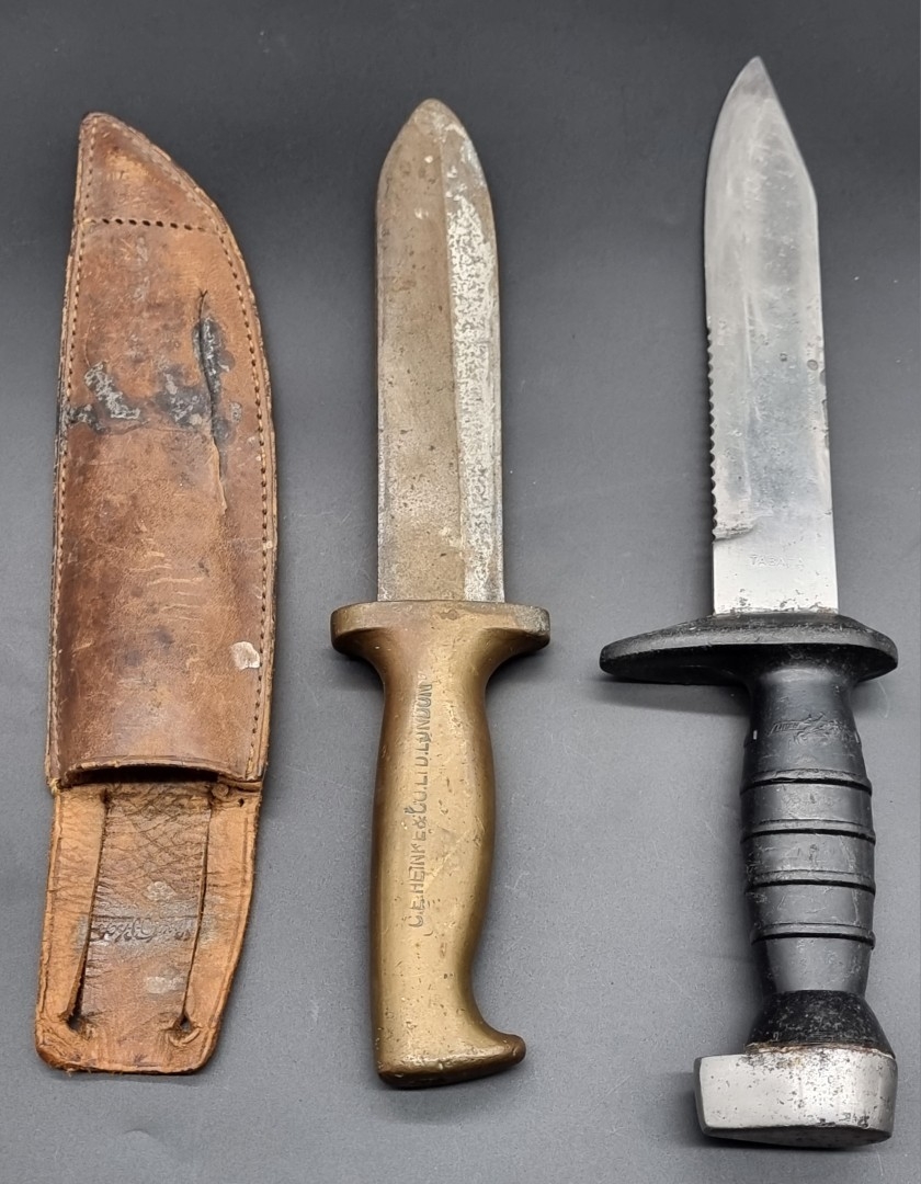 A cast bronze and steel diver's knife, by C.E. Heinke & Co Ltd, London, blade length 15.8cm, total length 27.7cm, in leather sheath; together with a Tabata plastic hilted knife. (2)