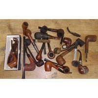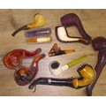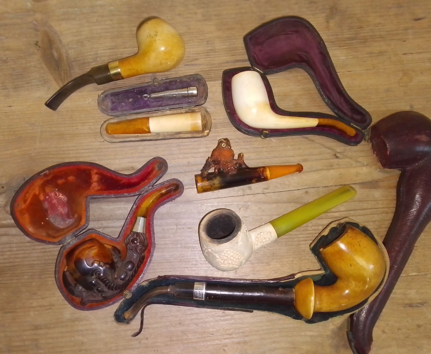 A box of assorted vintage pipes including meerschaum and amber etc.