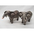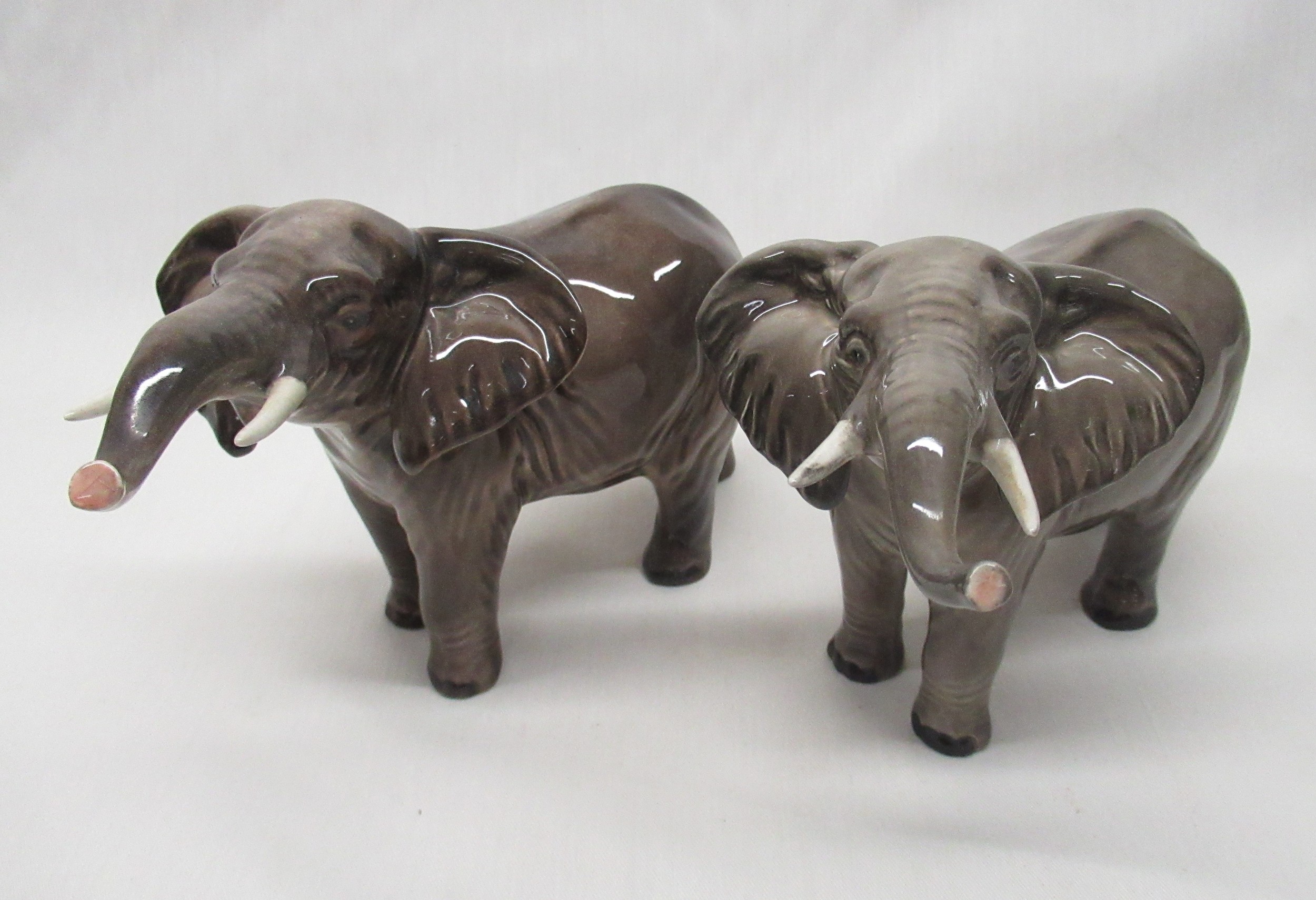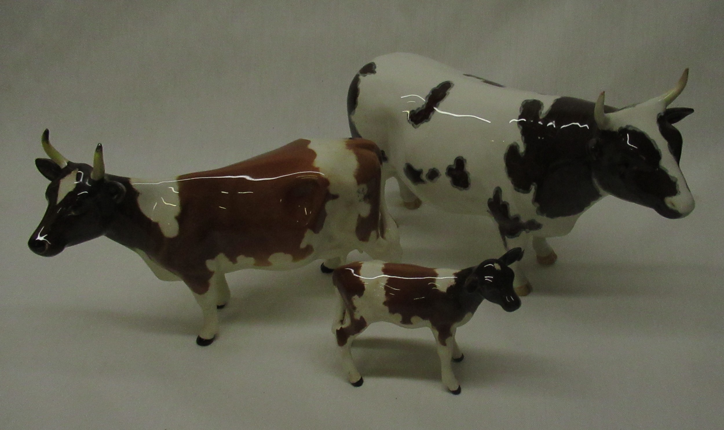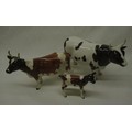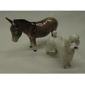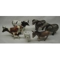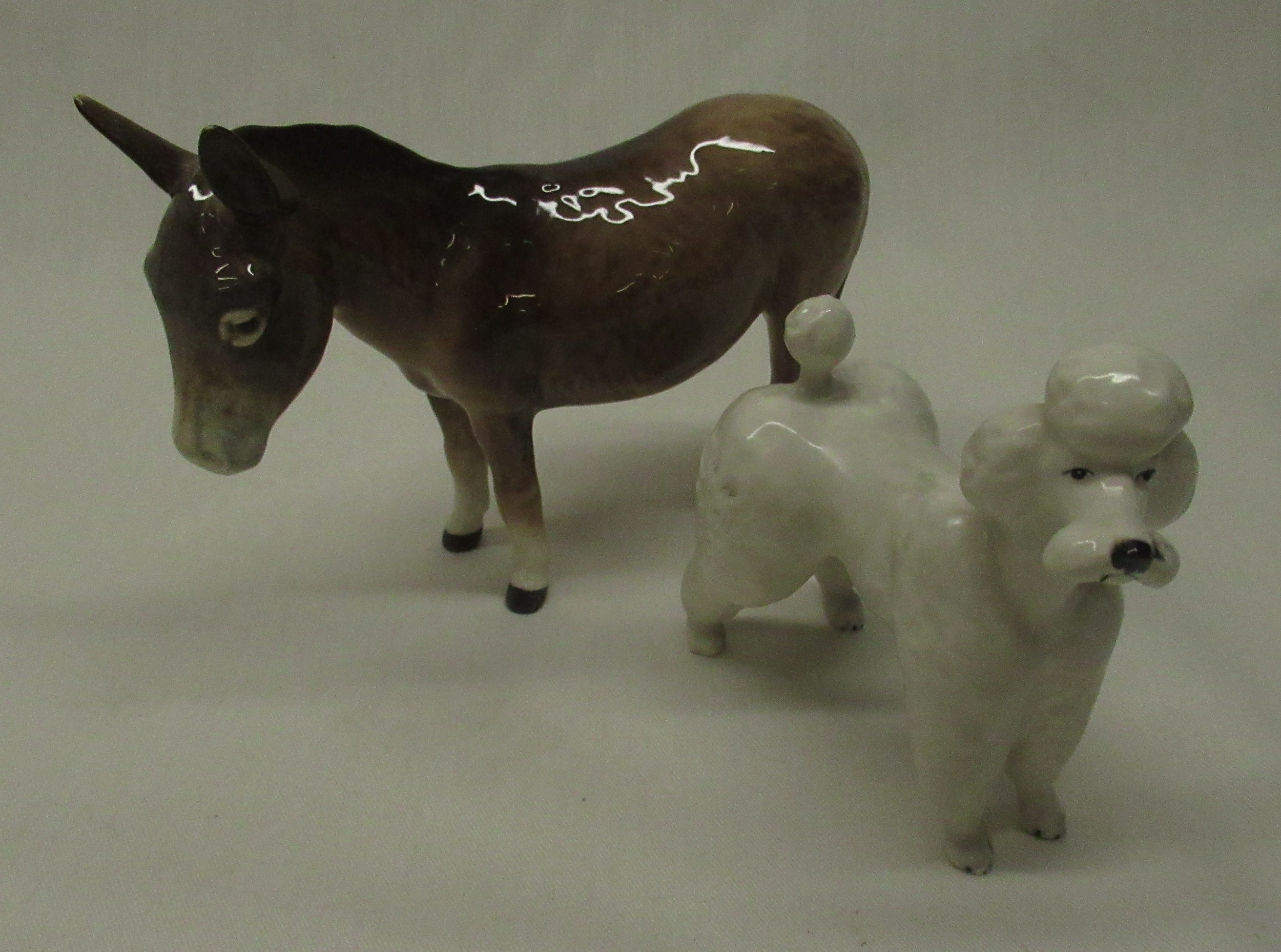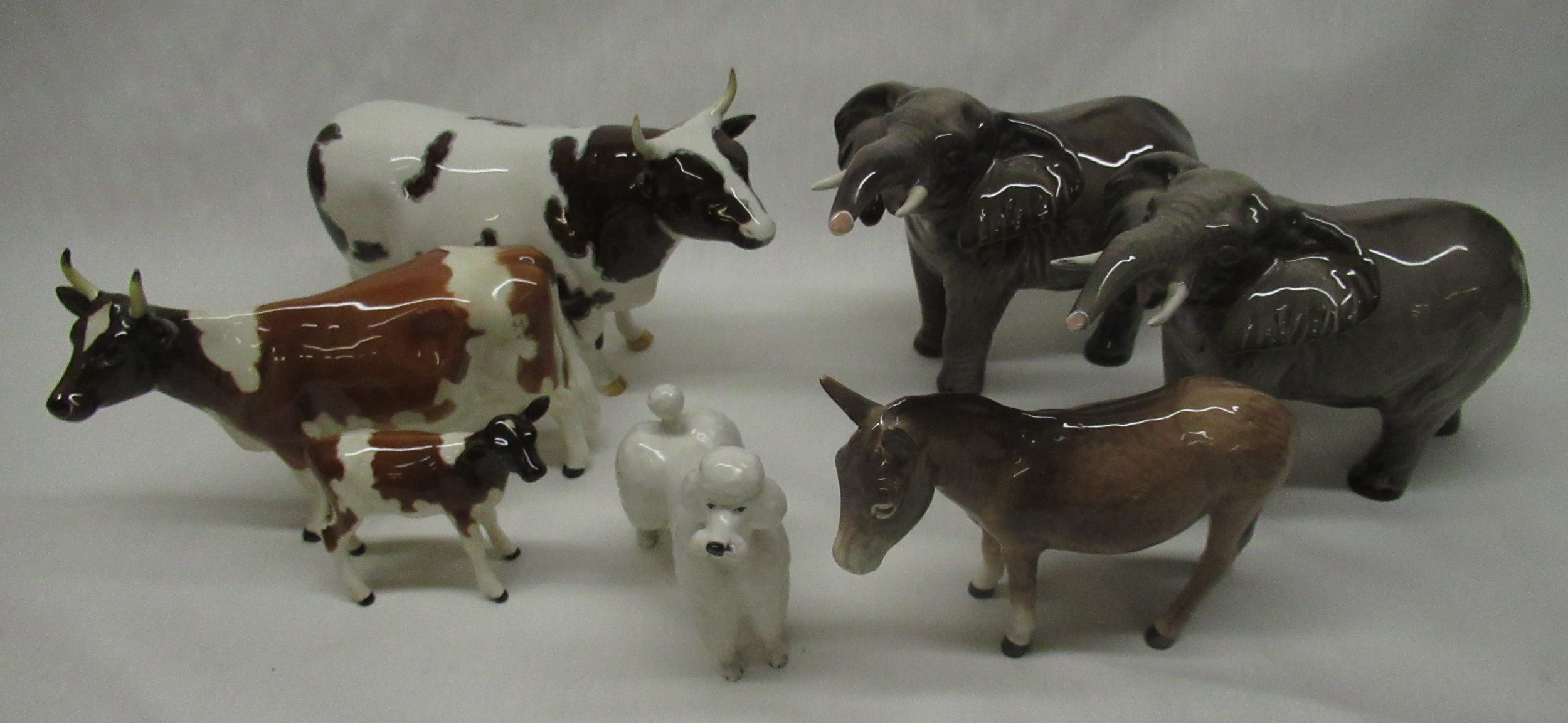 Beswick animals - Berwickshire Ayrshire Bull CH Whitehall Mandate, cow Ickham Bessie and calf, two stretching trunk elephants H12cm, donkey and white standard poodle, (7)
