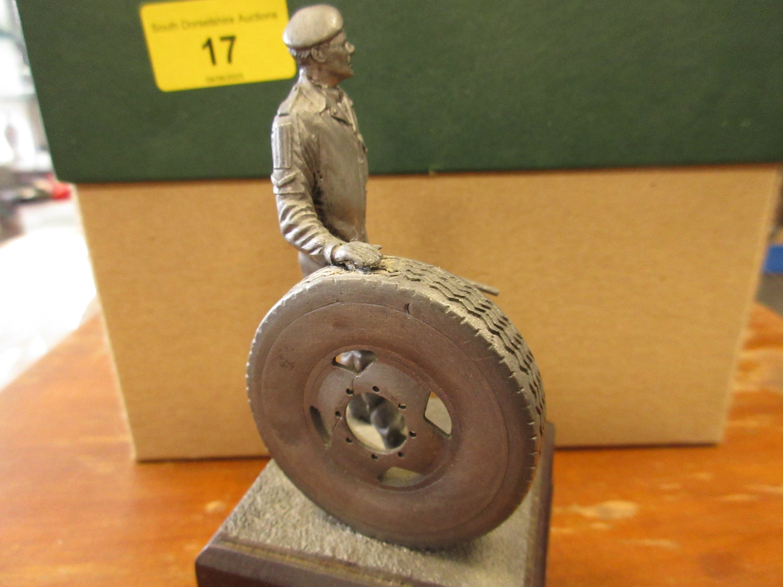 A vintage figure of a military mechanic holding a wheel and tools mounted on a black presentation plinth with blank white metal plaque to front, in extremely good order