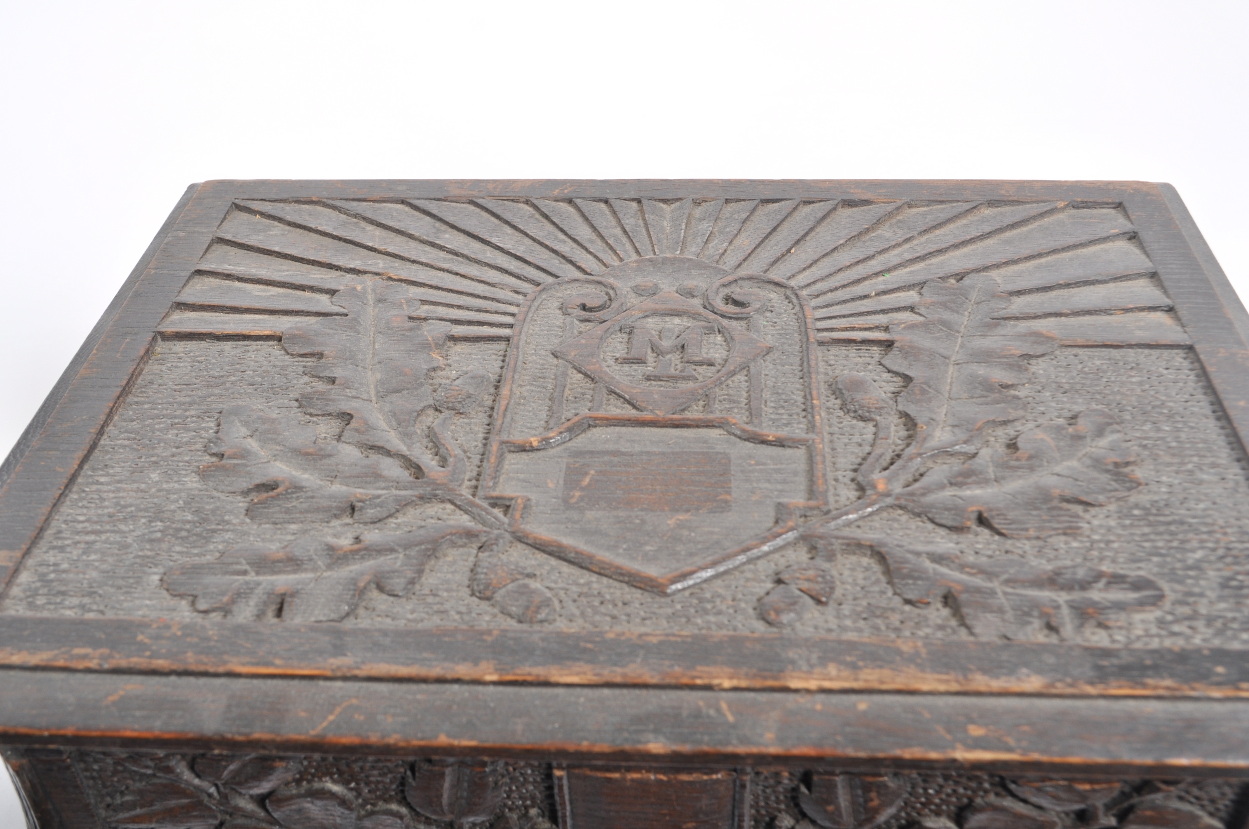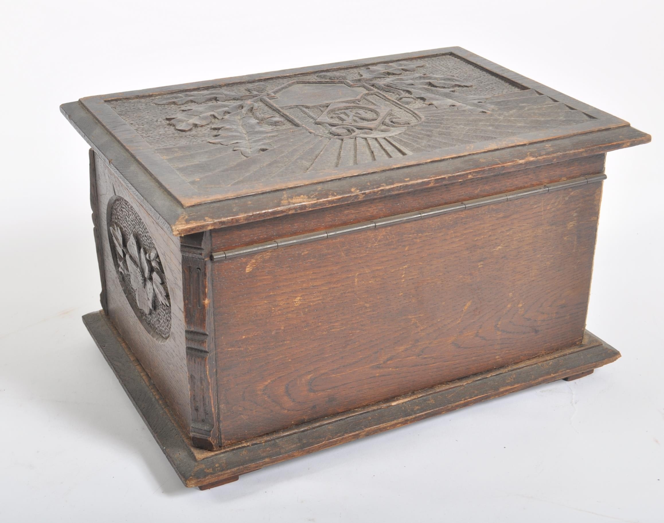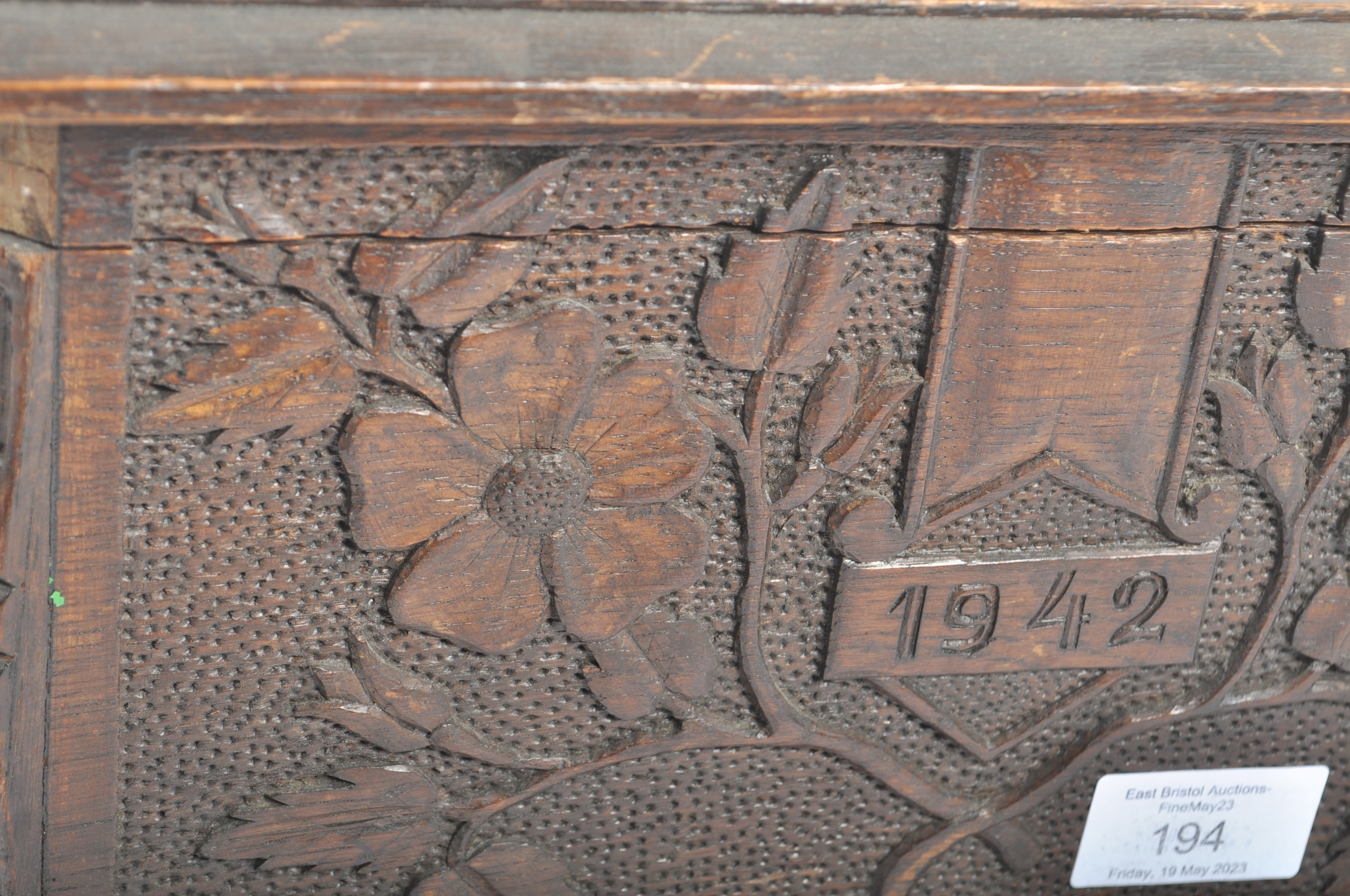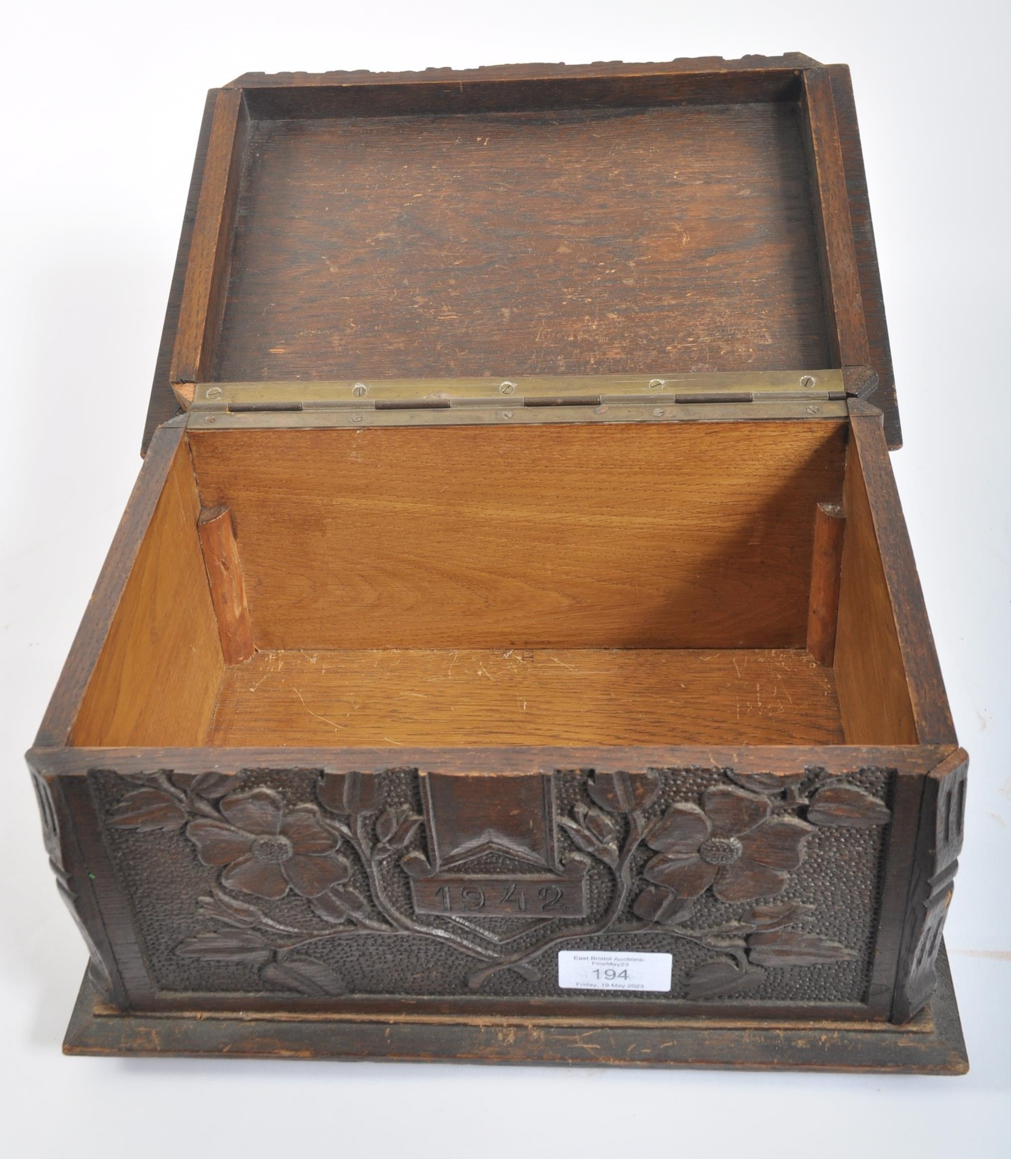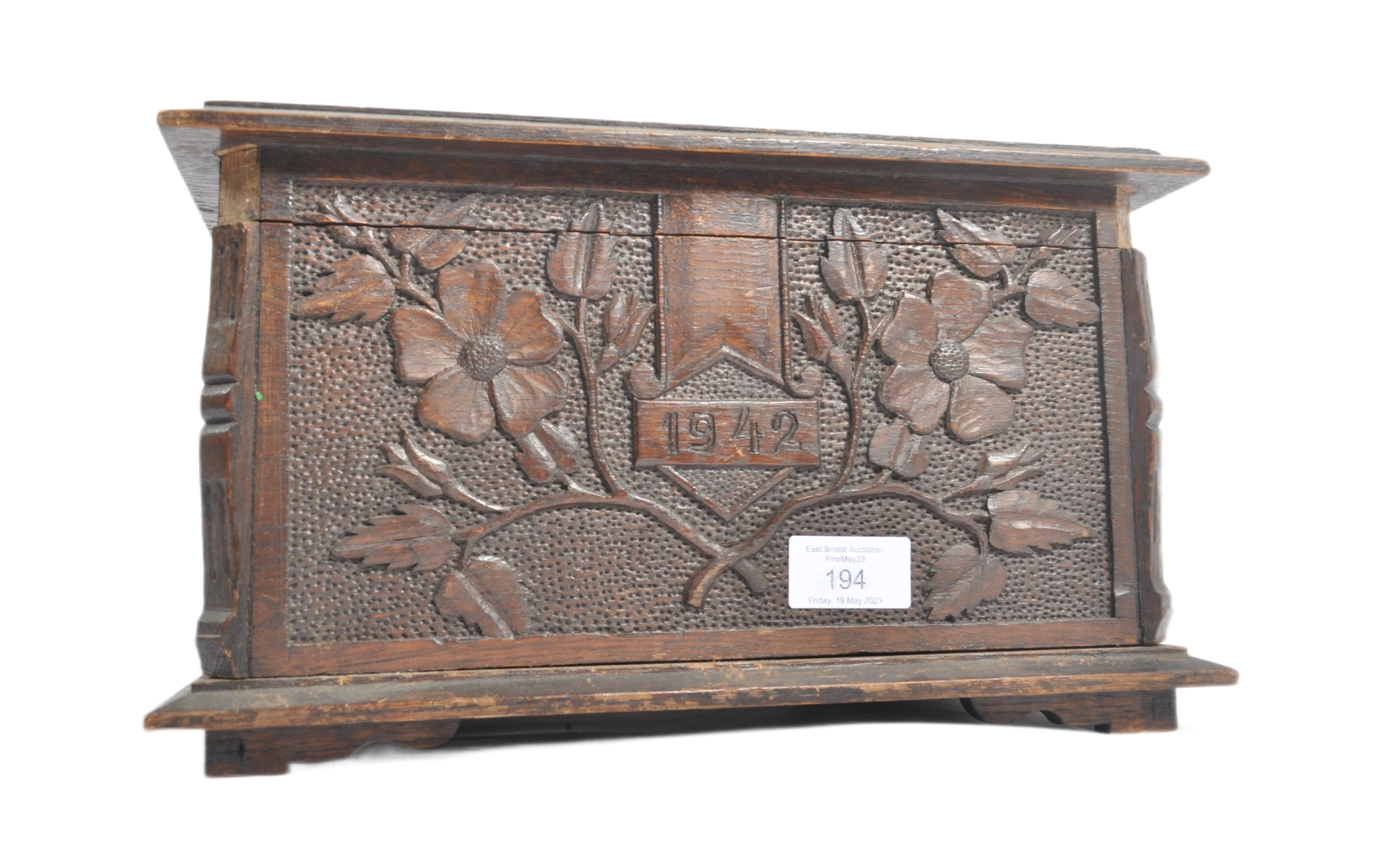 An unusual WWII Second World War 'trench art' type carved folk-art wooden box. Well carved with Oak Leaves to all three sides and the lid, monogrammed to top ' ML ' and dated 1942. Hinged lid to top. Measures approx. 18cm tall x 32cm long.