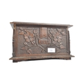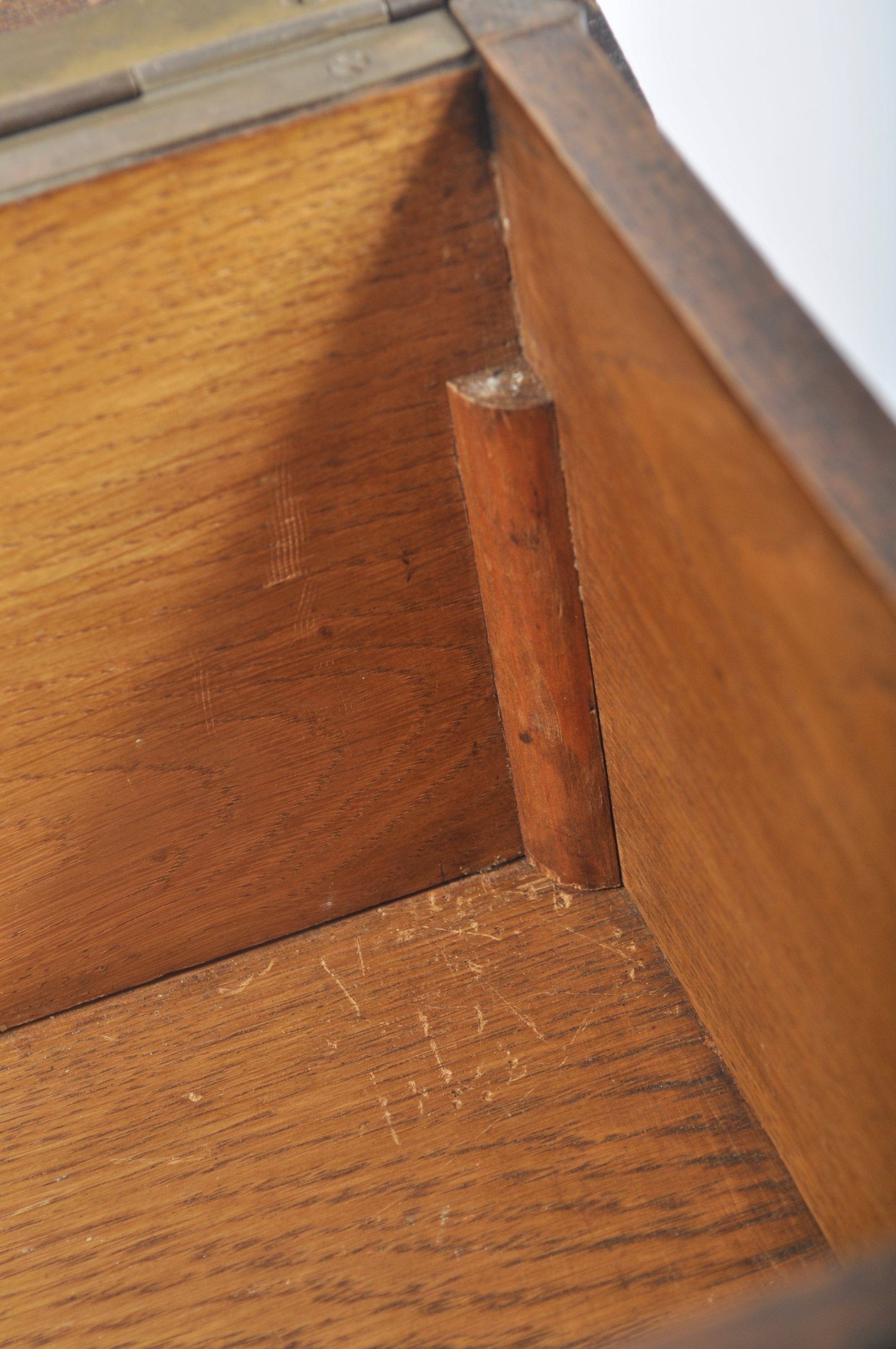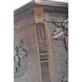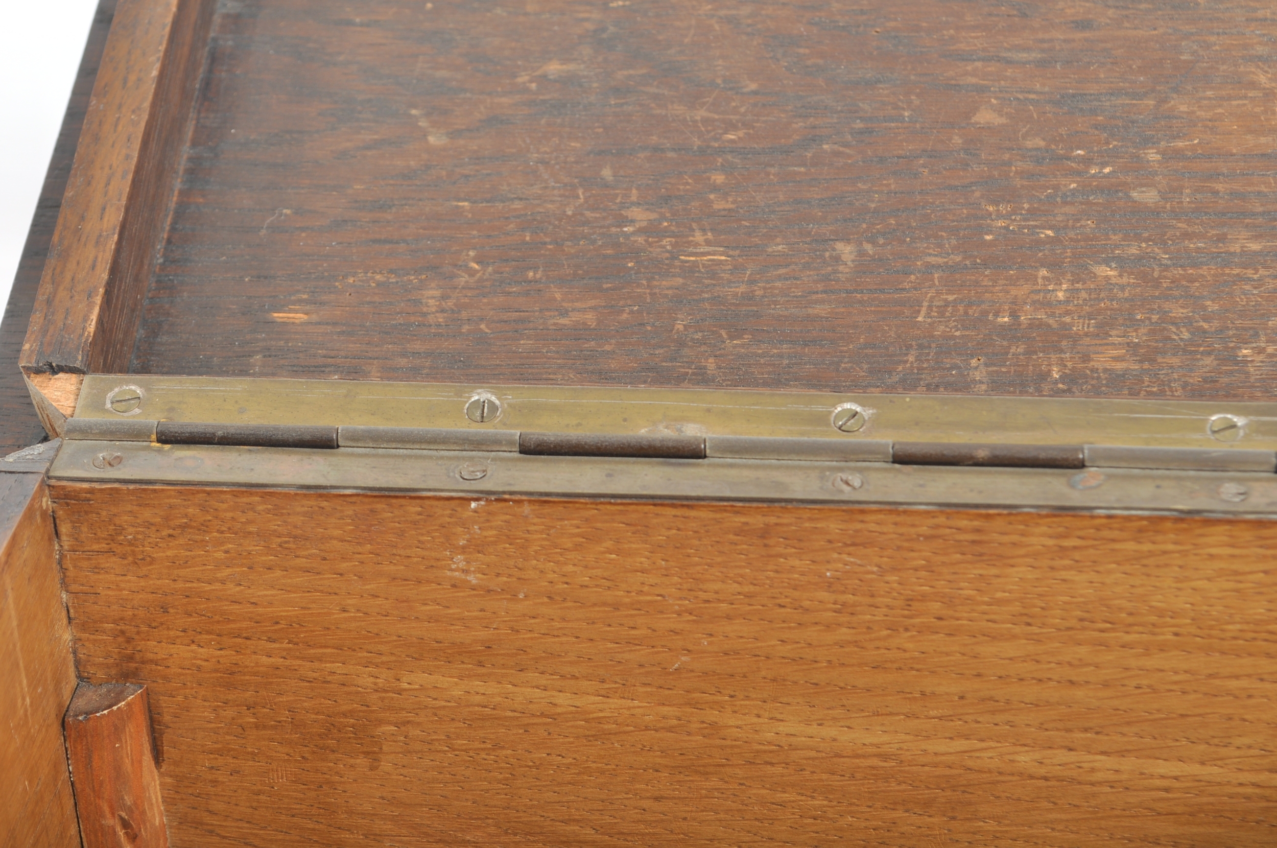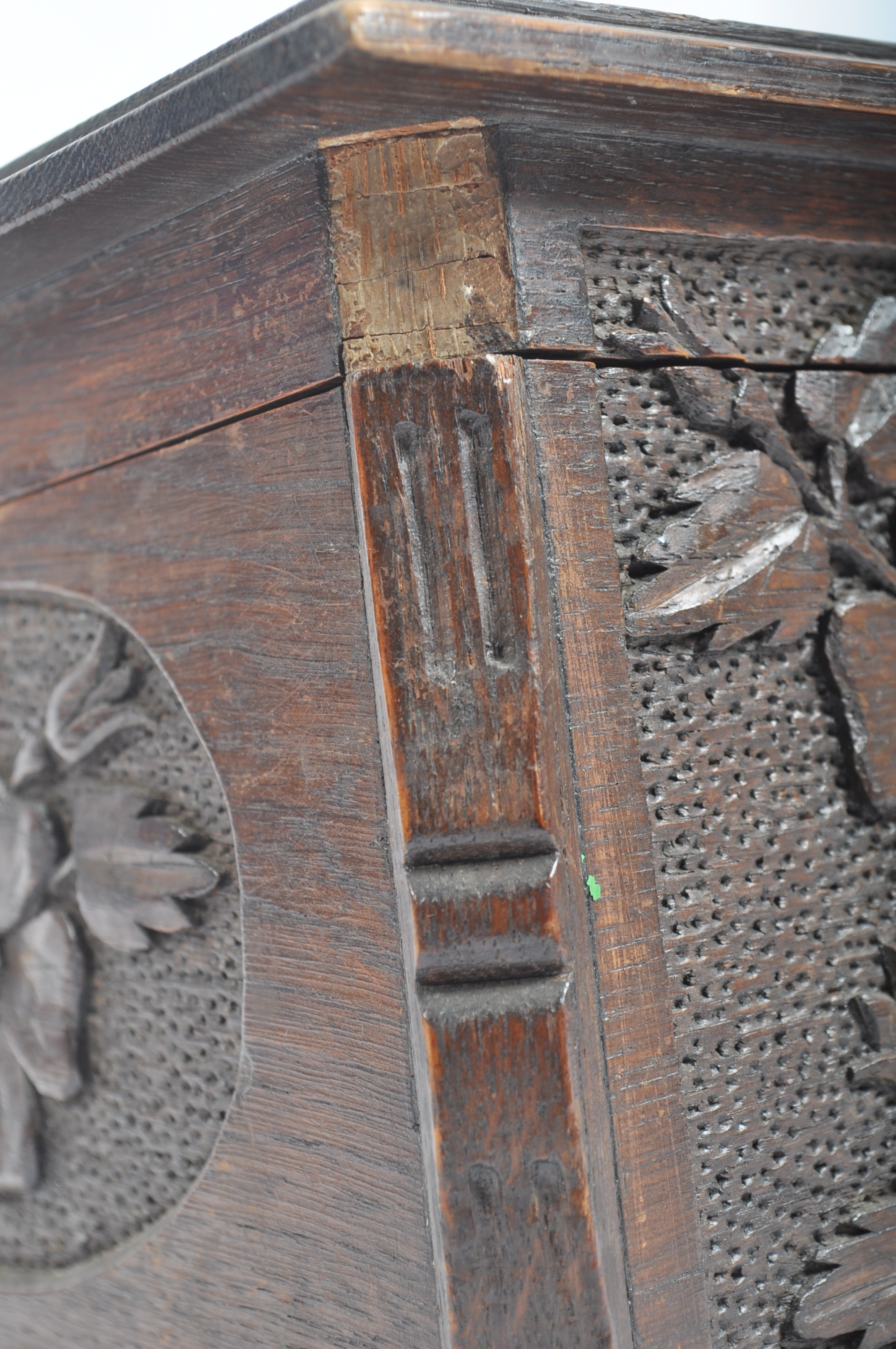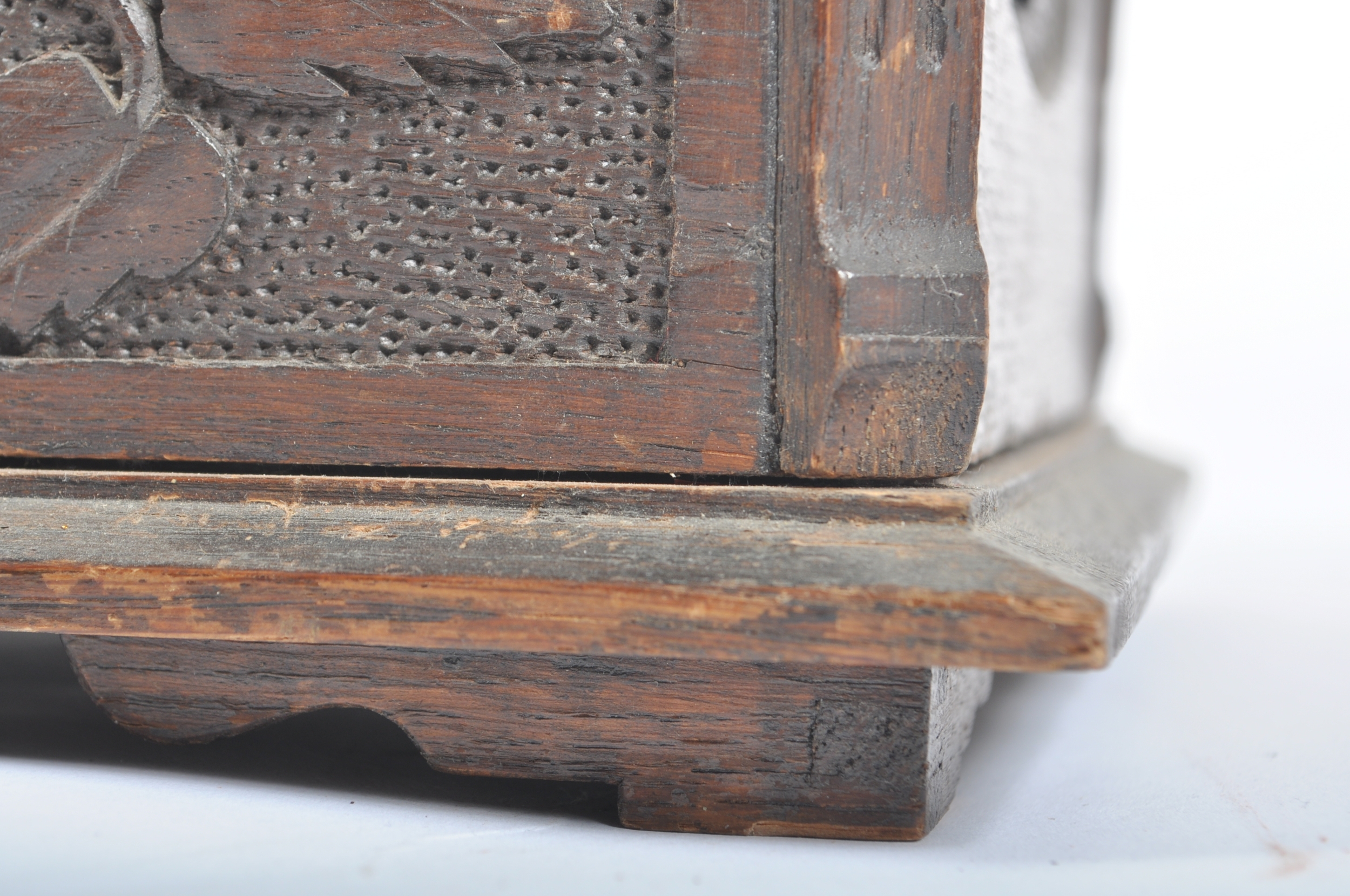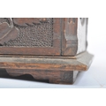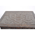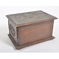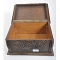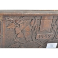 An unusual WWII Second World War 'trench art' type carved folk-art wooden box. Well carved with Oak Leaves to all three sides and the lid, monogrammed to top ' ML ' and dated 1942. Hinged lid to top. Measures approx. 18cm tall x 32cm long.