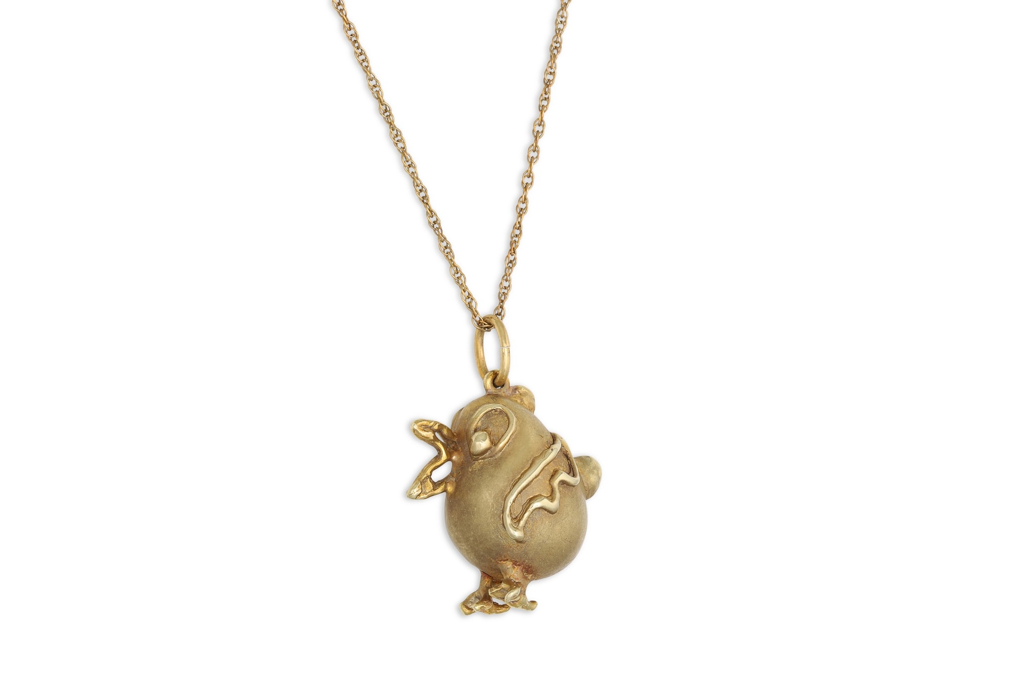 A 14CT YELLOW GOLD 1970'S PENDANT, depicting an abstract chicken, on a 9ct chain