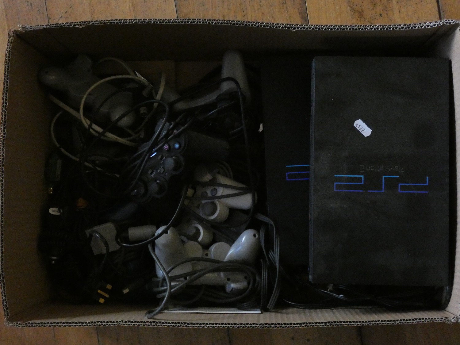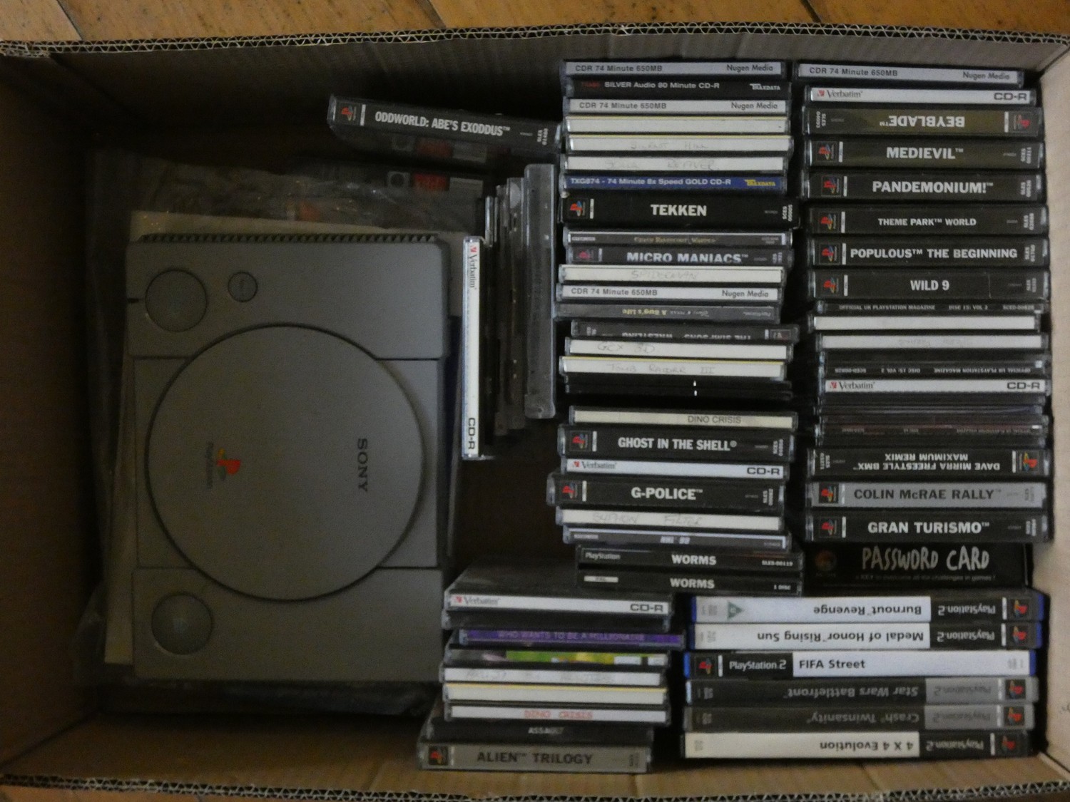 A Sony Playstation console together with two Sony Playstation 2 complete with a selection of games, controllers and leads. (2)