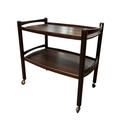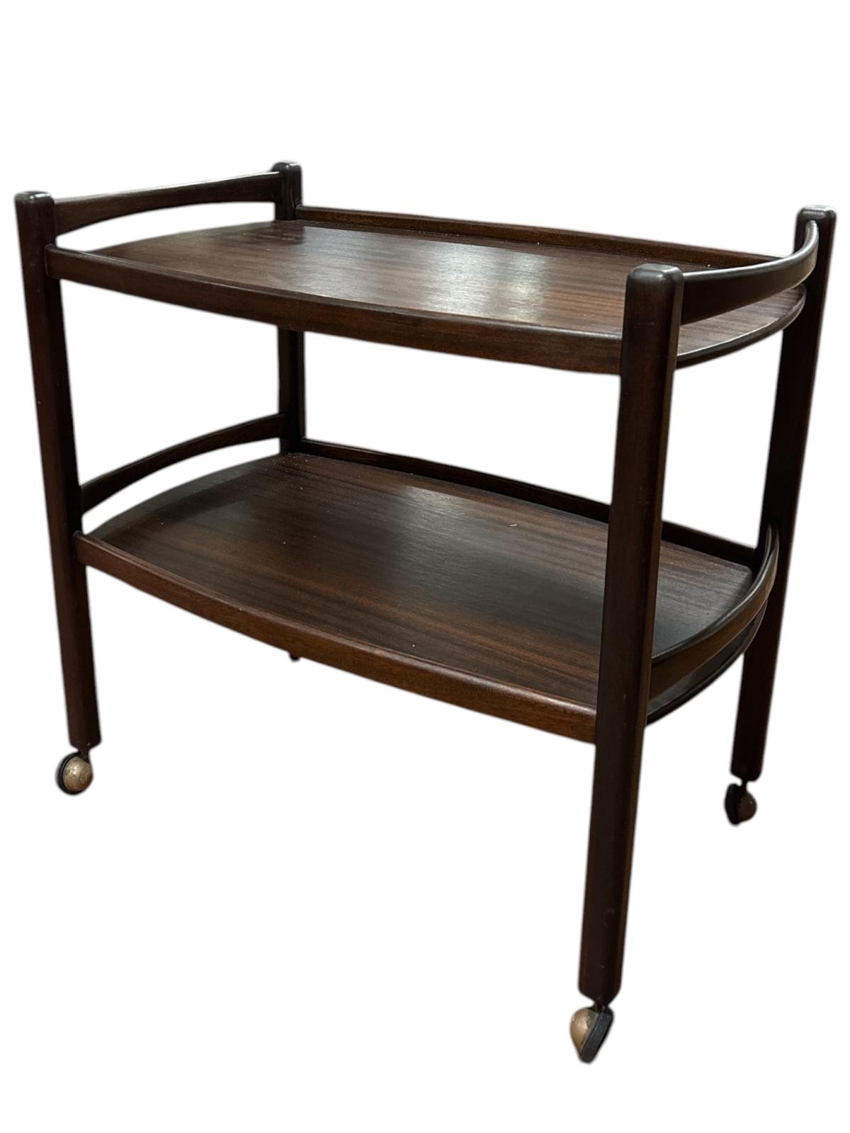 A VINTAGE TEAK TWO TIER SERVING TROLLEY the moulded gallery raised on square moulded supports with castors 75cm (h) x 75cm (w) x 46cm (d)
