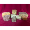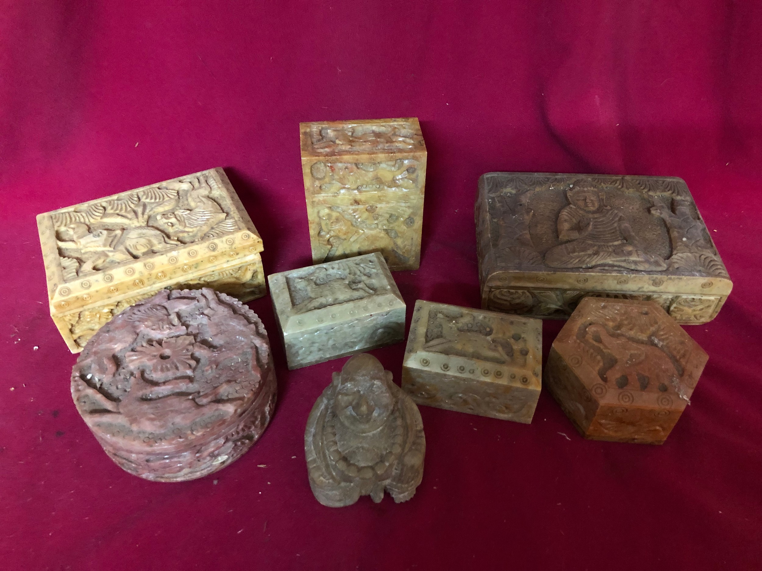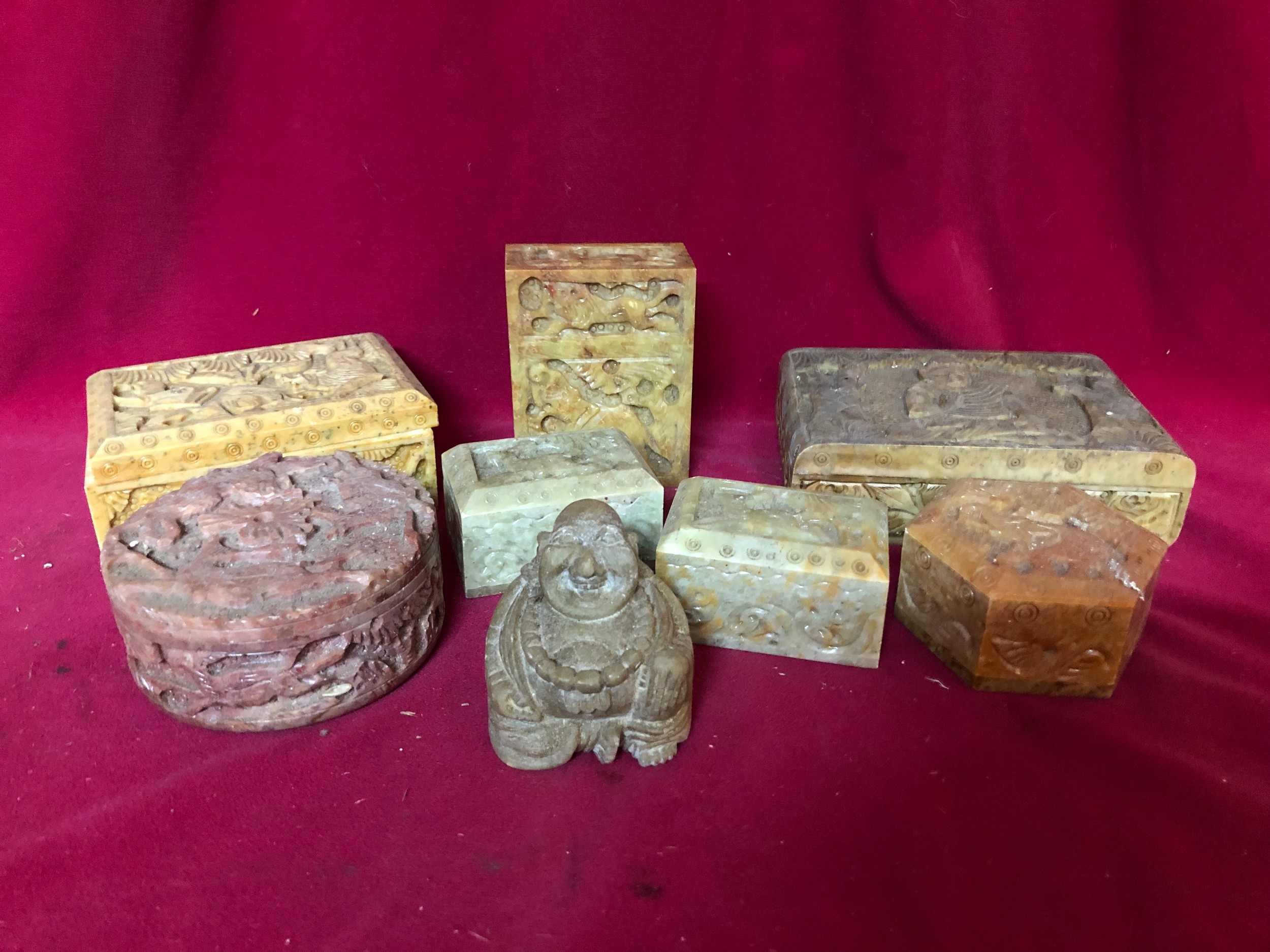 Selection of 7 carved soapstone trinket boxes and a Buddha