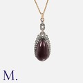 A French Antique Diamond And Garnet Pendant in 18k yellow gold and silver, comprising a series of interlocking rose cut diamond set links, suspending a large carbuncle cabochon garnet, accented by rose cut diamonds. Makers mark indistinct, French marked.