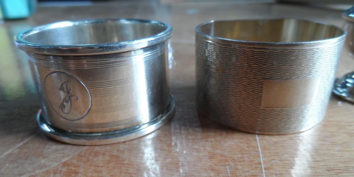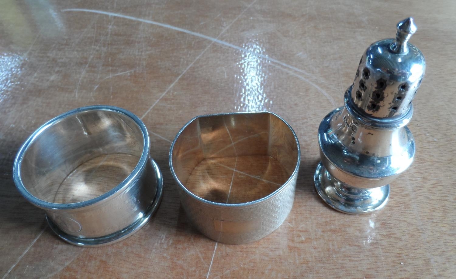 Two silver napkin rings & a silver pepperette (3),84.5 grams