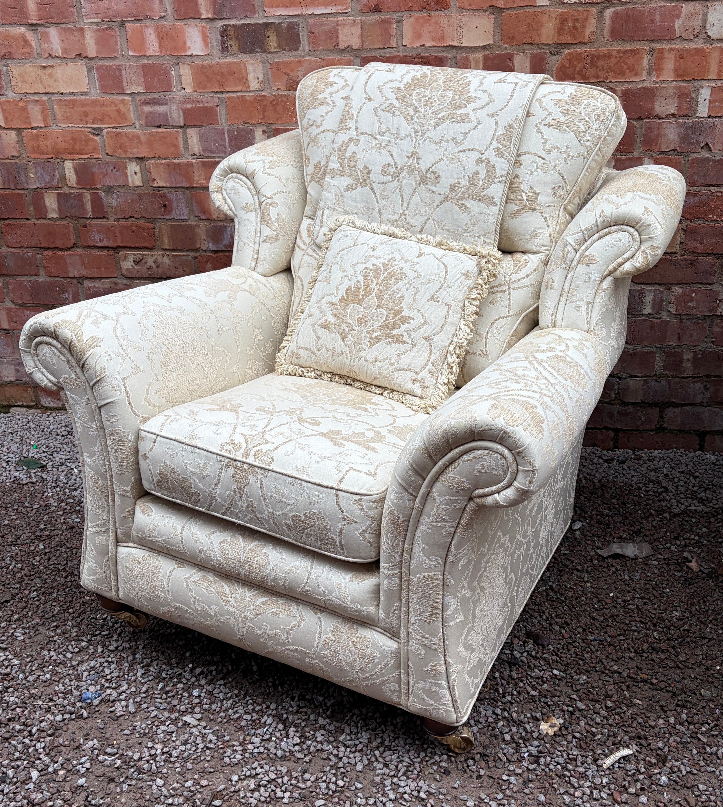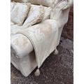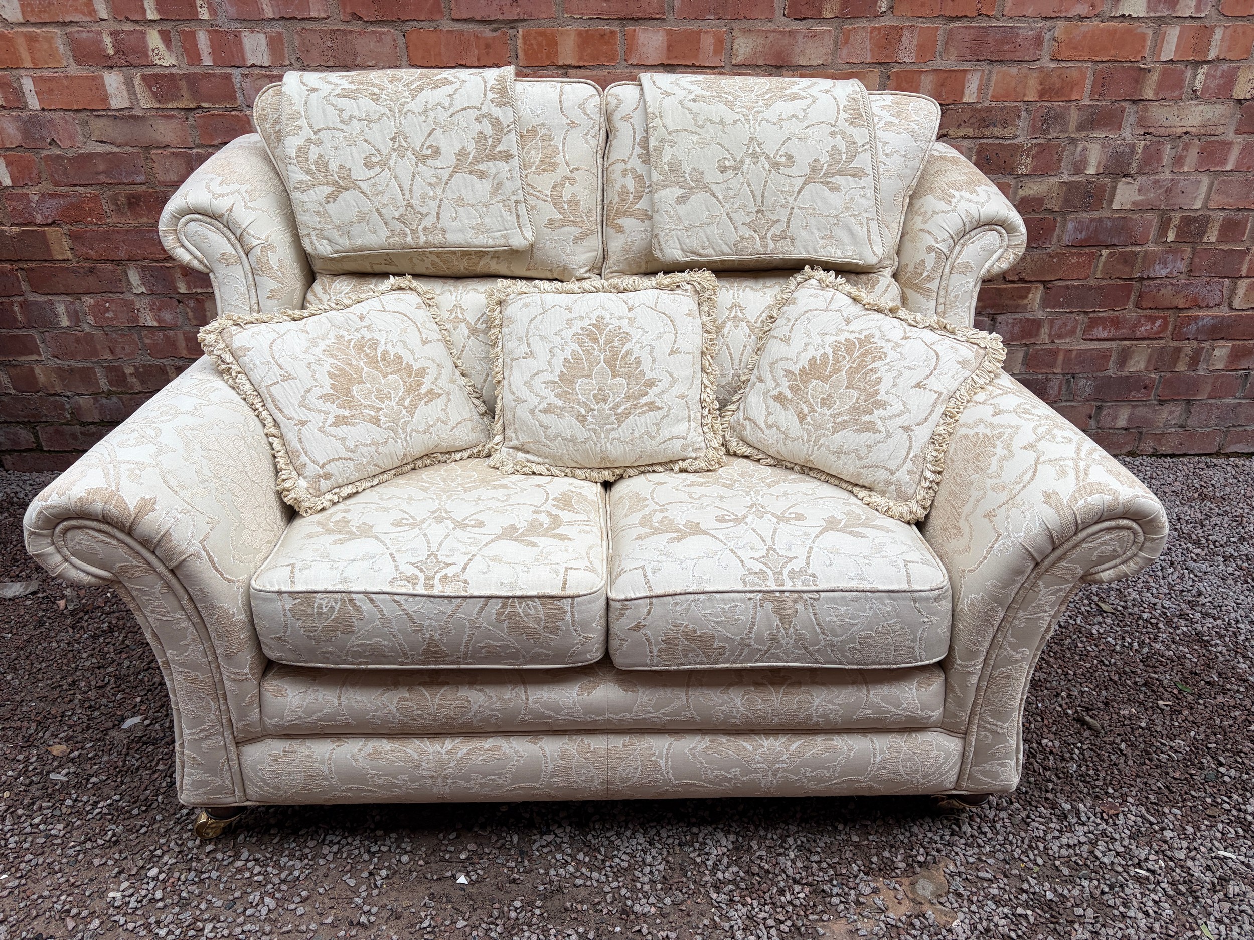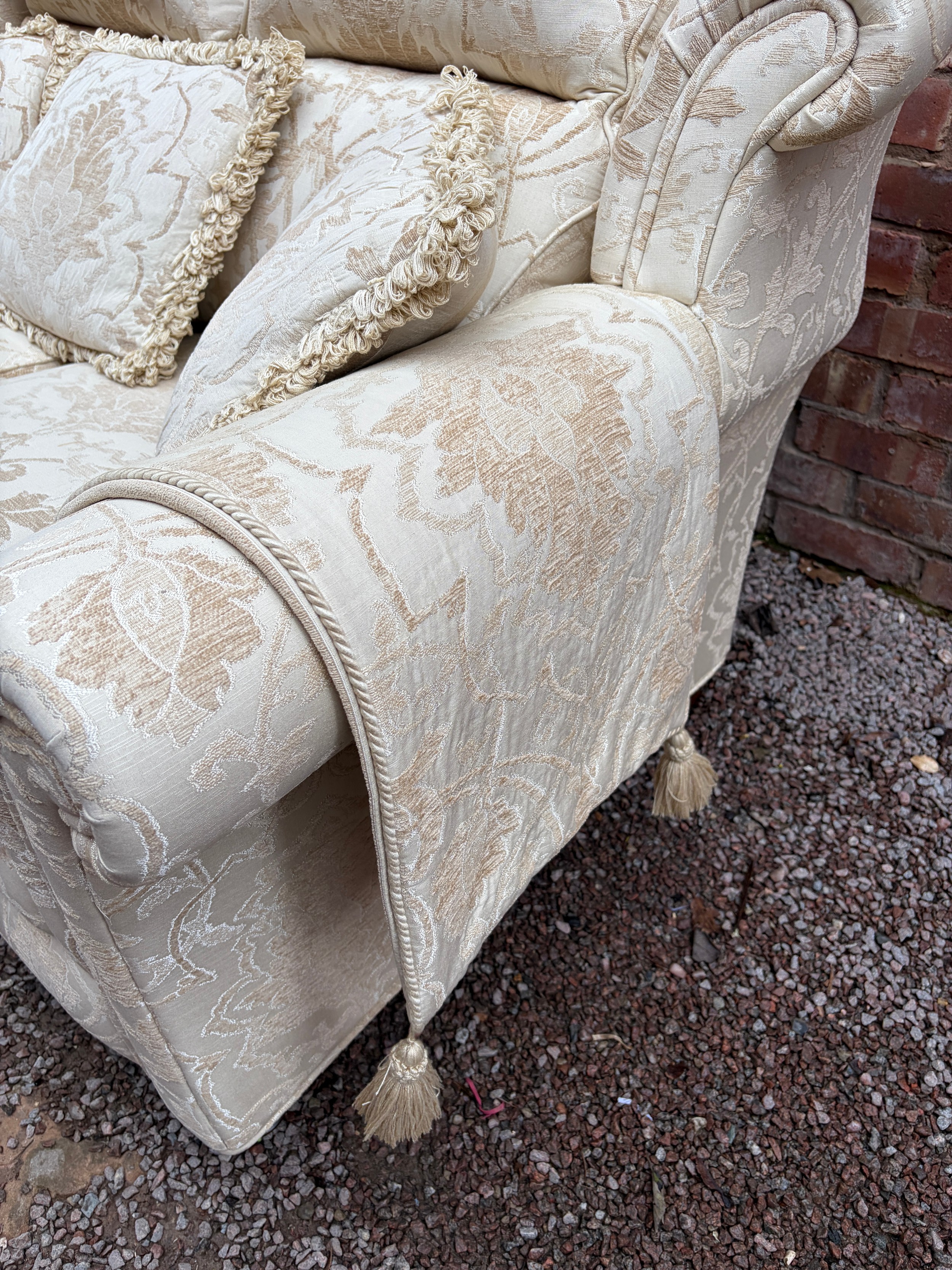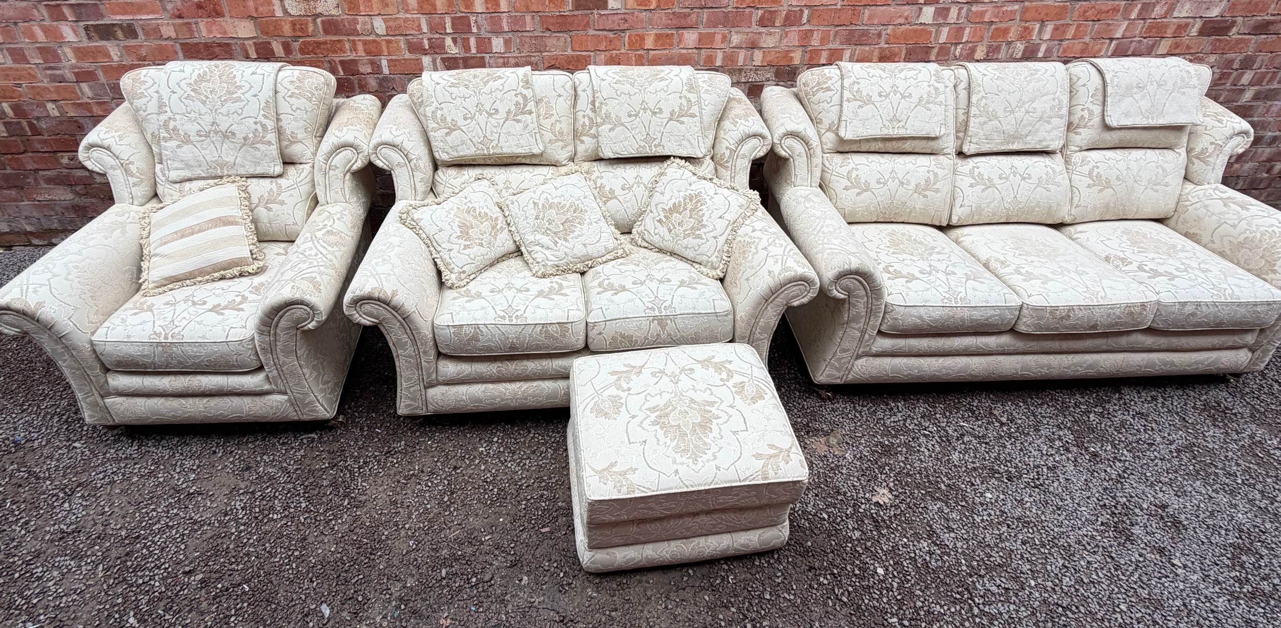 QUALITY CREAM FLORAL BROCADE THREE SEATER AND TWO SEATER SOFAS, WITH MATCHING ARMCHAIR AND BOX STORAGE POUFFEE