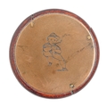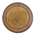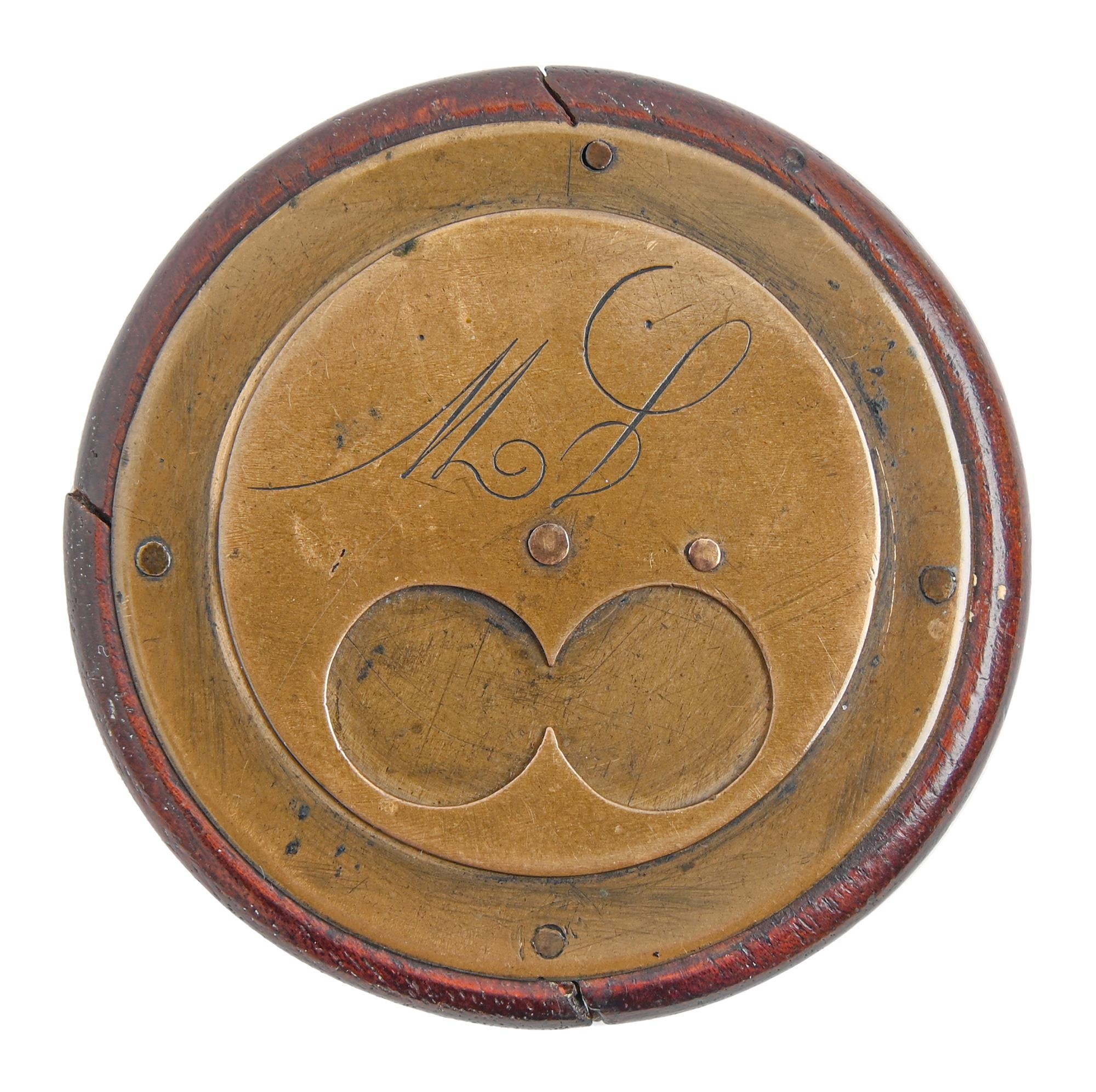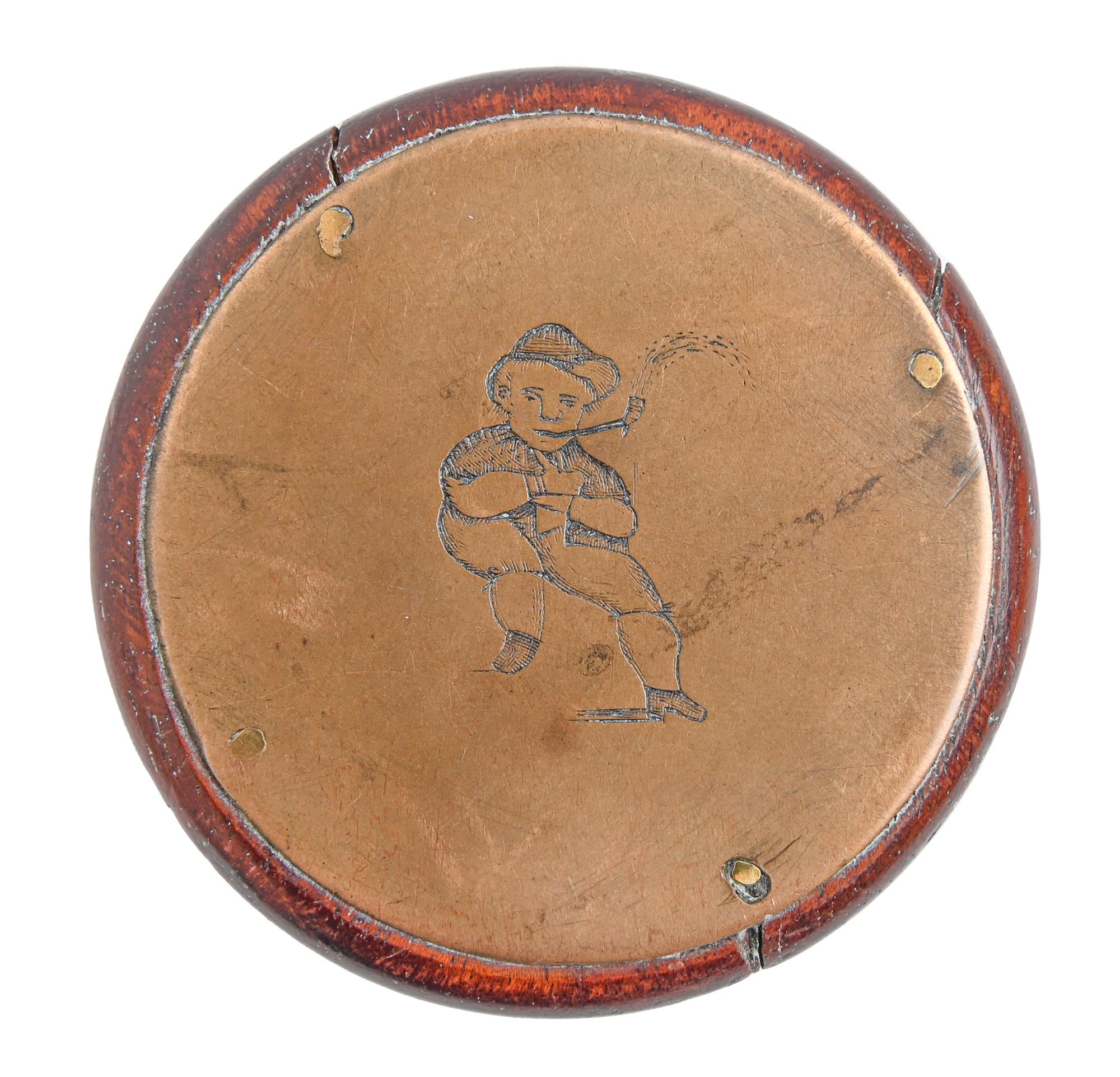 A Victorian round brass faced and backed two finger snuff box, engraved with initials, the back with the figure of a pipe smoker, 67mm diam