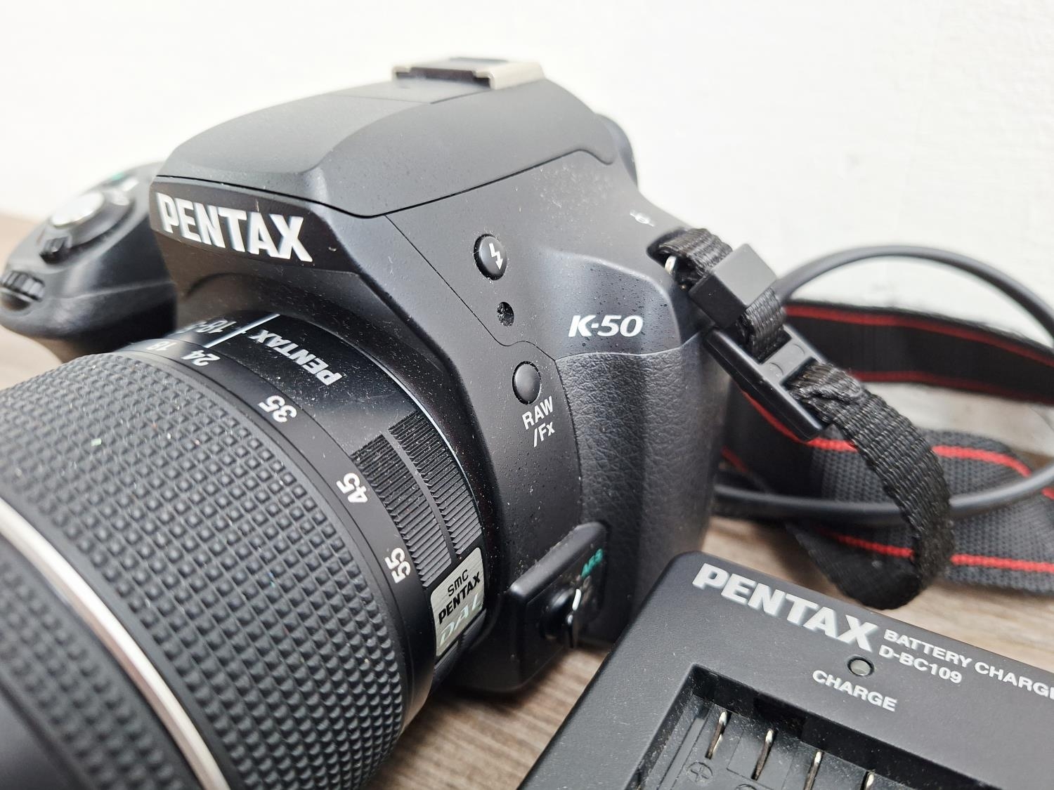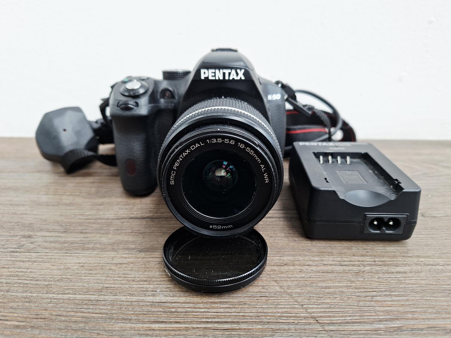 A Pentax K-50 16mp APS-C CMOS sensor DSLR camera fitted with smc Pentax-DA L 1:3.5-5.6 18-55mm AL WR lens with battery and charger