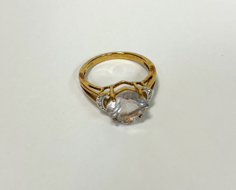 A modern kunzite and diamond cluster dropper pendant, 44mm long, together with a matching dress ring on hallmarked 9ct gold band, ring size N