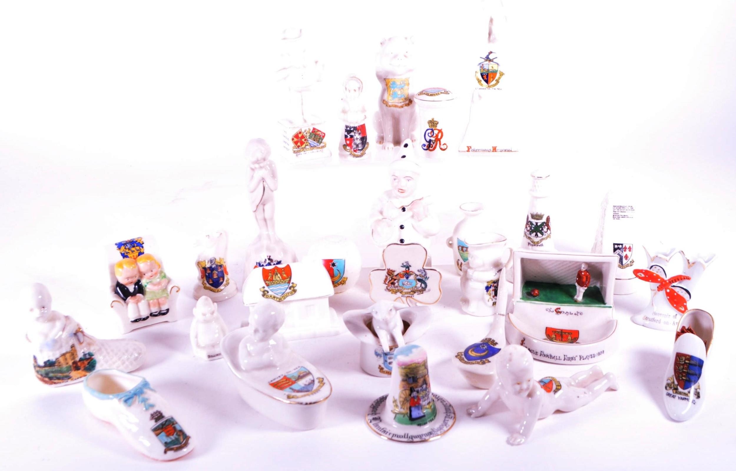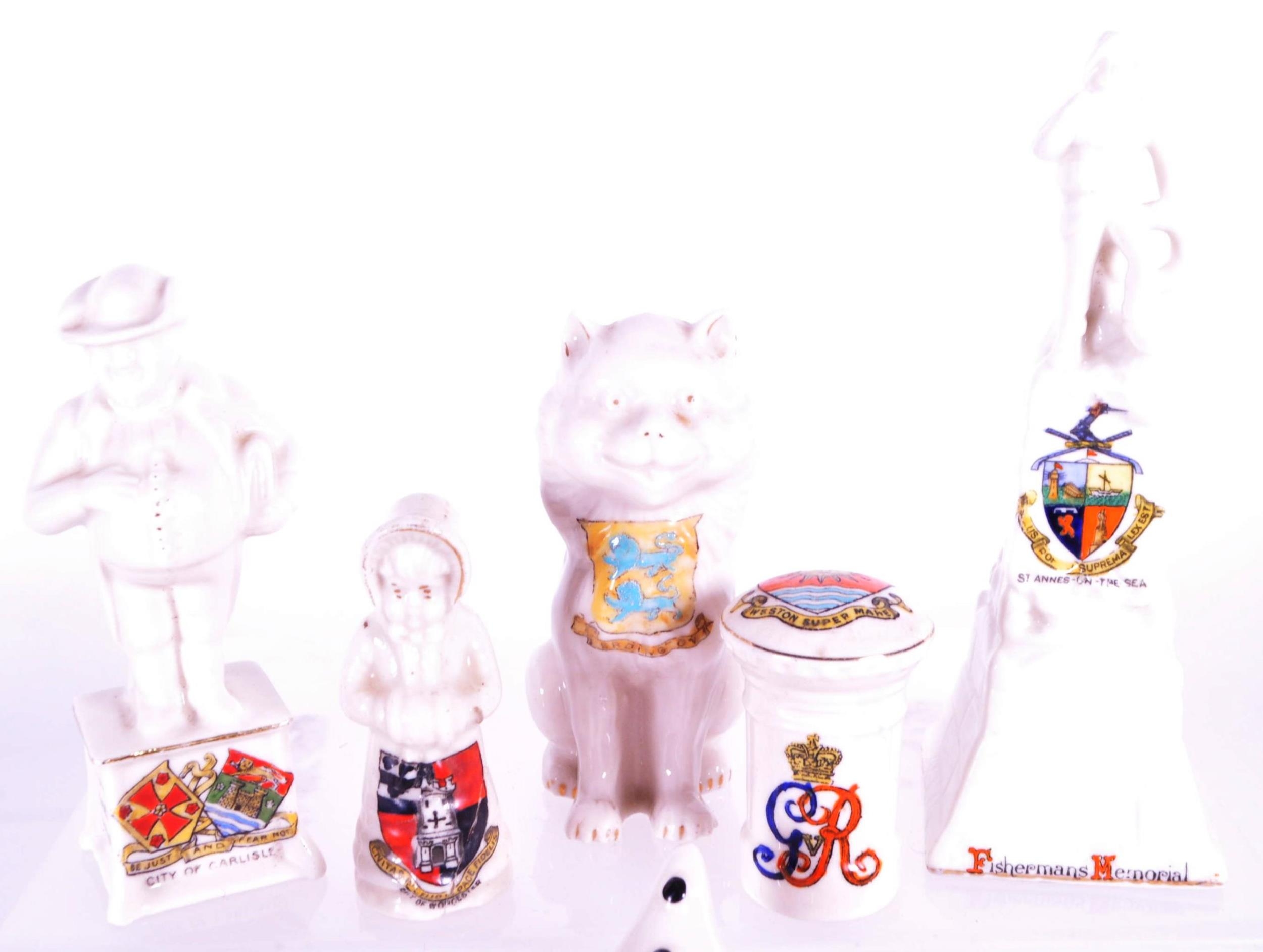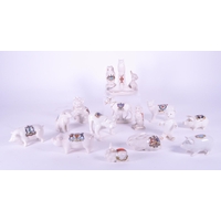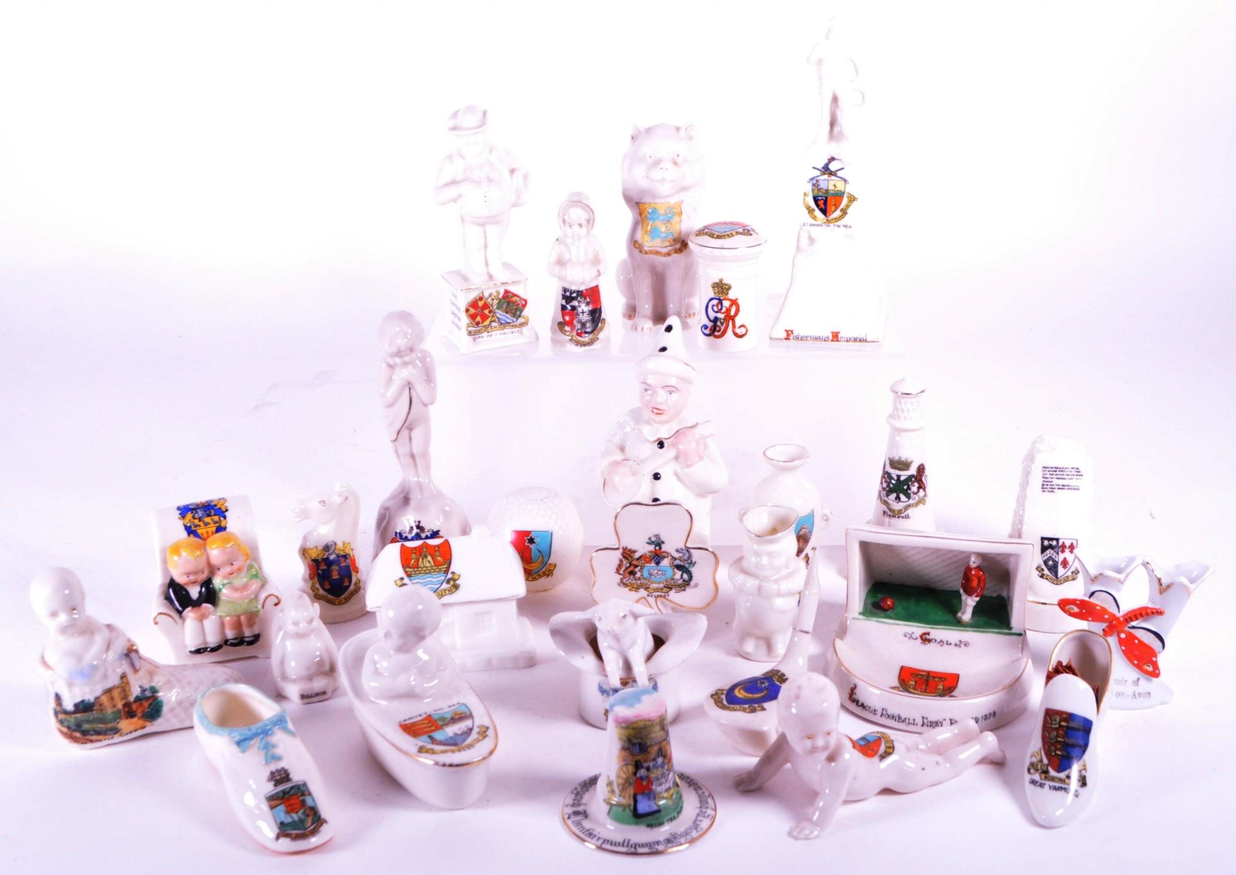 Collection of early 20th century crested china porcelain figures. Makers including Tuscan China, Gemma, Shelley, Carlton, Arcadian, Jones, W. H. Goss, and more. Figures including animals, buildings, shoes, human figures, clown, and more. Makers marks to the underside of each piece. Largest measuring approx. 15.5cm tall.