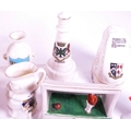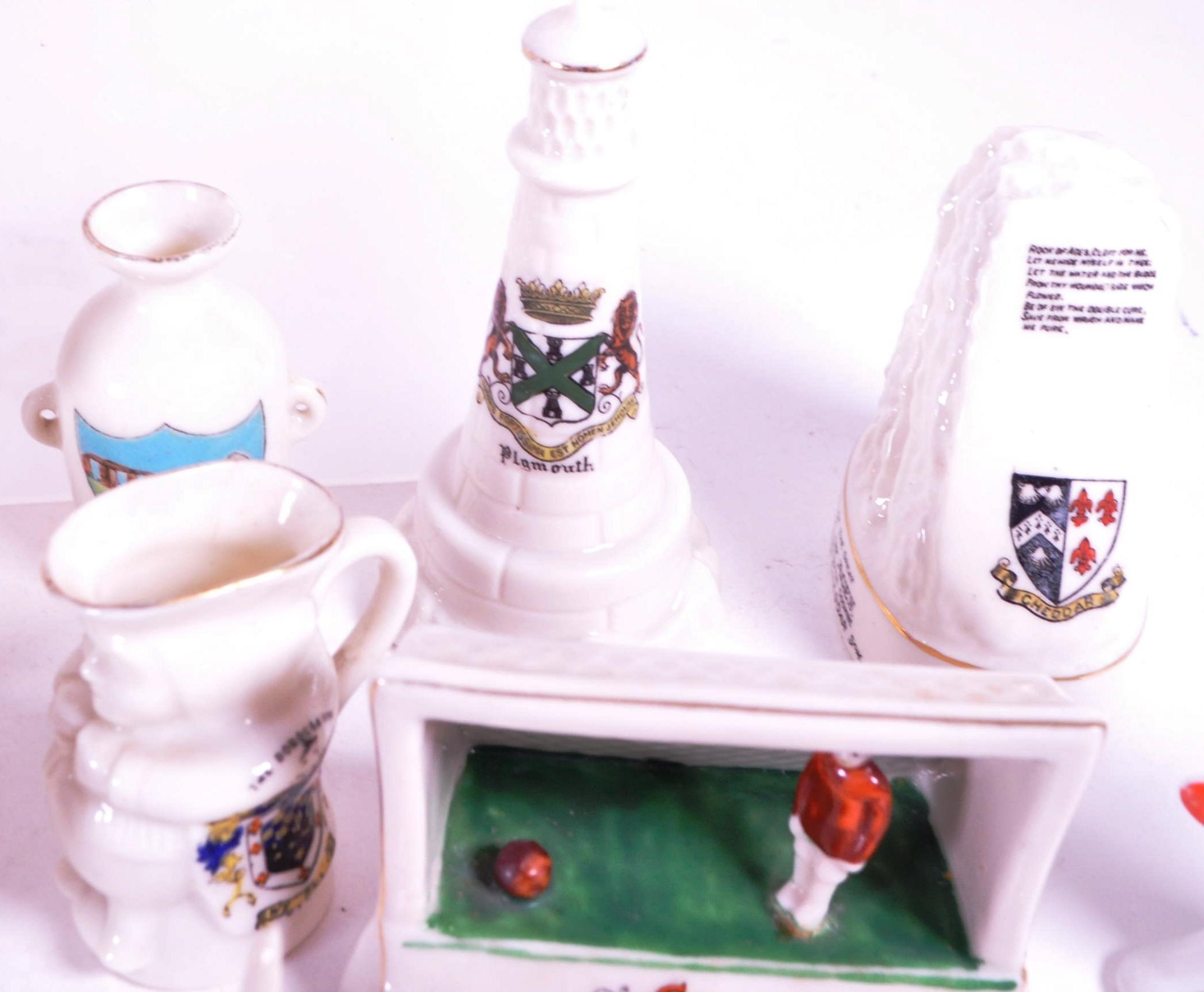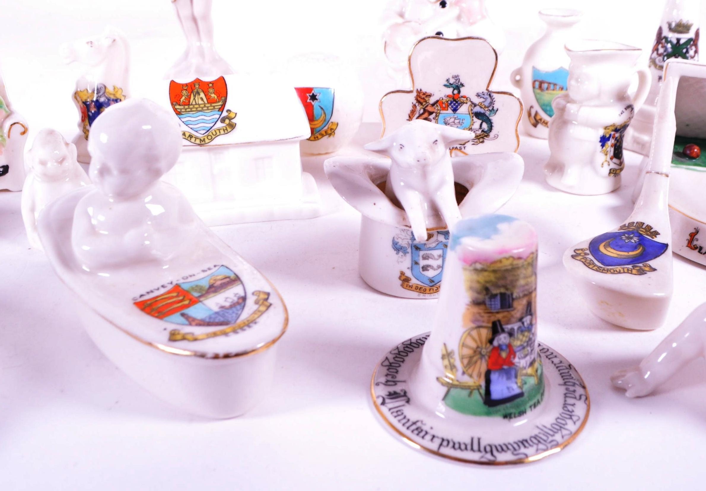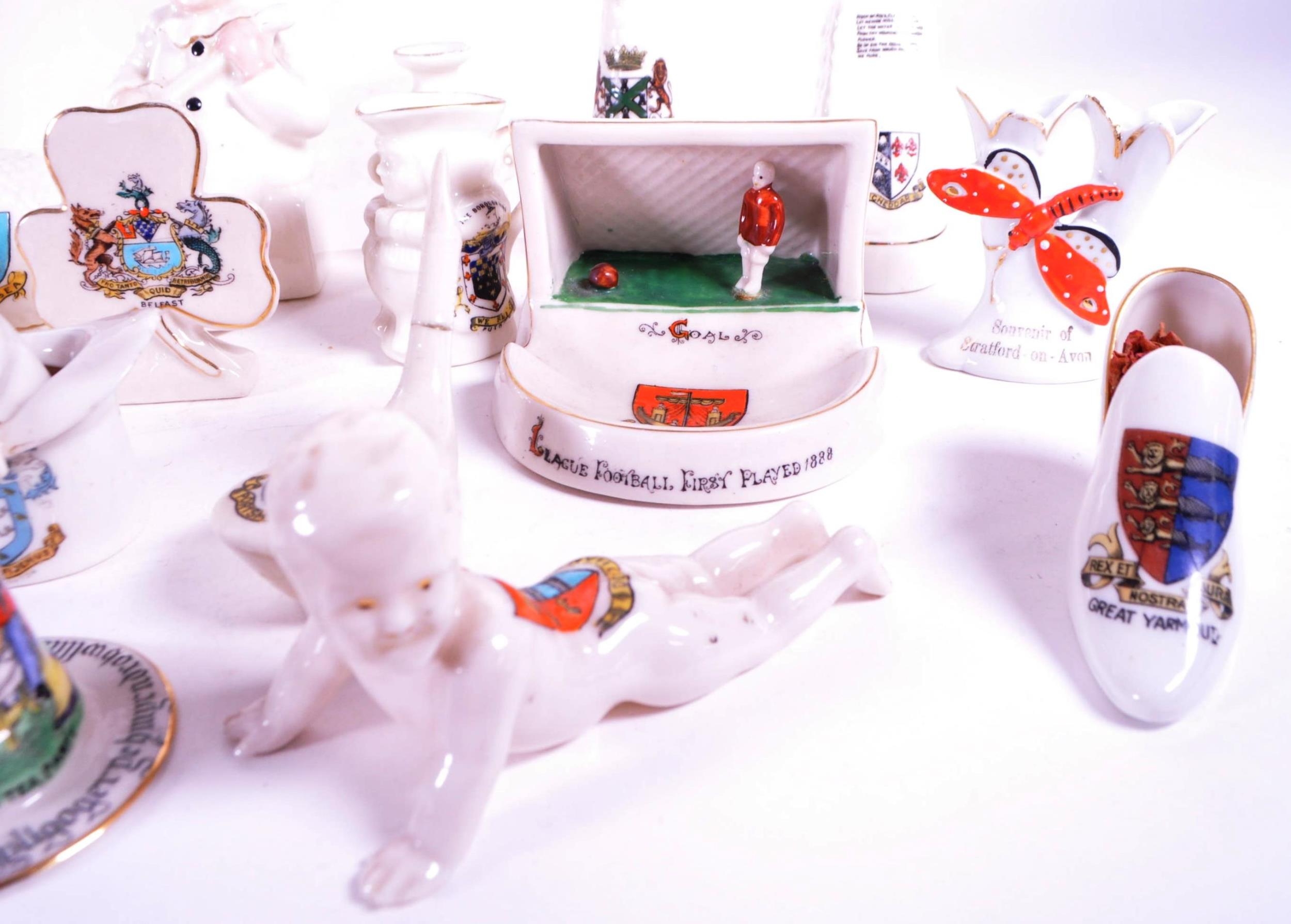 Collection of early 20th century crested china porcelain figures. Makers including Tuscan China, Gemma, Shelley, Carlton, Arcadian, Jones, W. H. Goss, and more. Figures including animals, buildings, shoes, human figures, clown, and more. Makers marks to the underside of each piece. Largest measuring approx. 15.5cm tall.