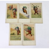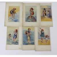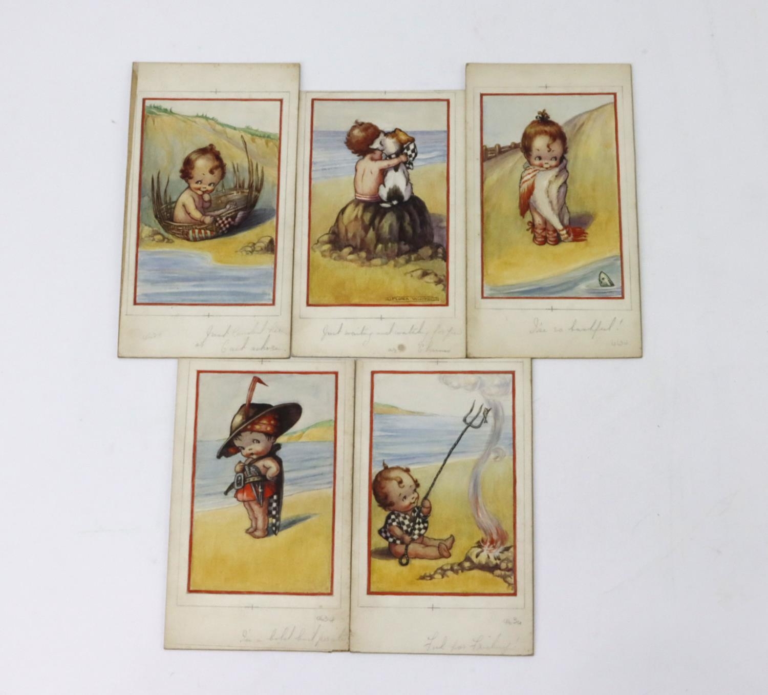 Flora White (20th century) original artwork for postcards, on board, SEASIDE - Just waiting, I'se so bashful, I'se a bold bad pirate, Fish for Friday & Just landed here, approx, 12cm x 17cm. (5)