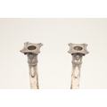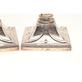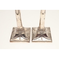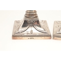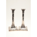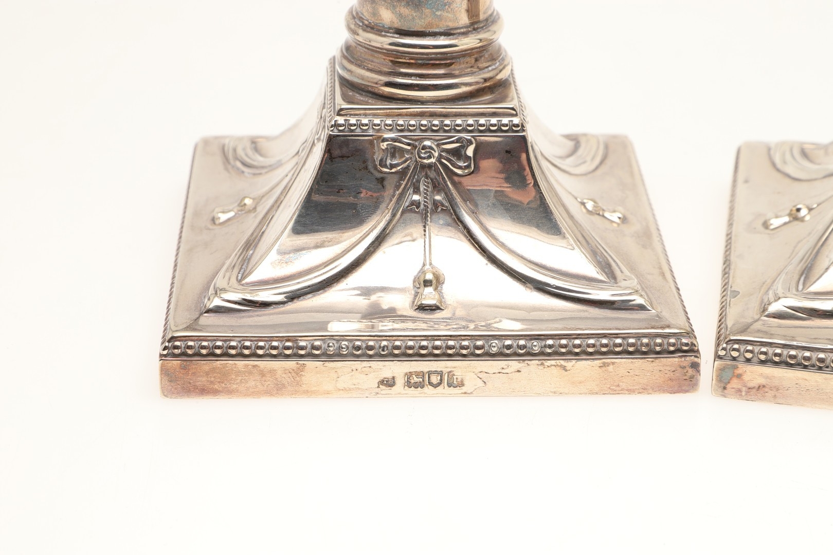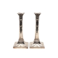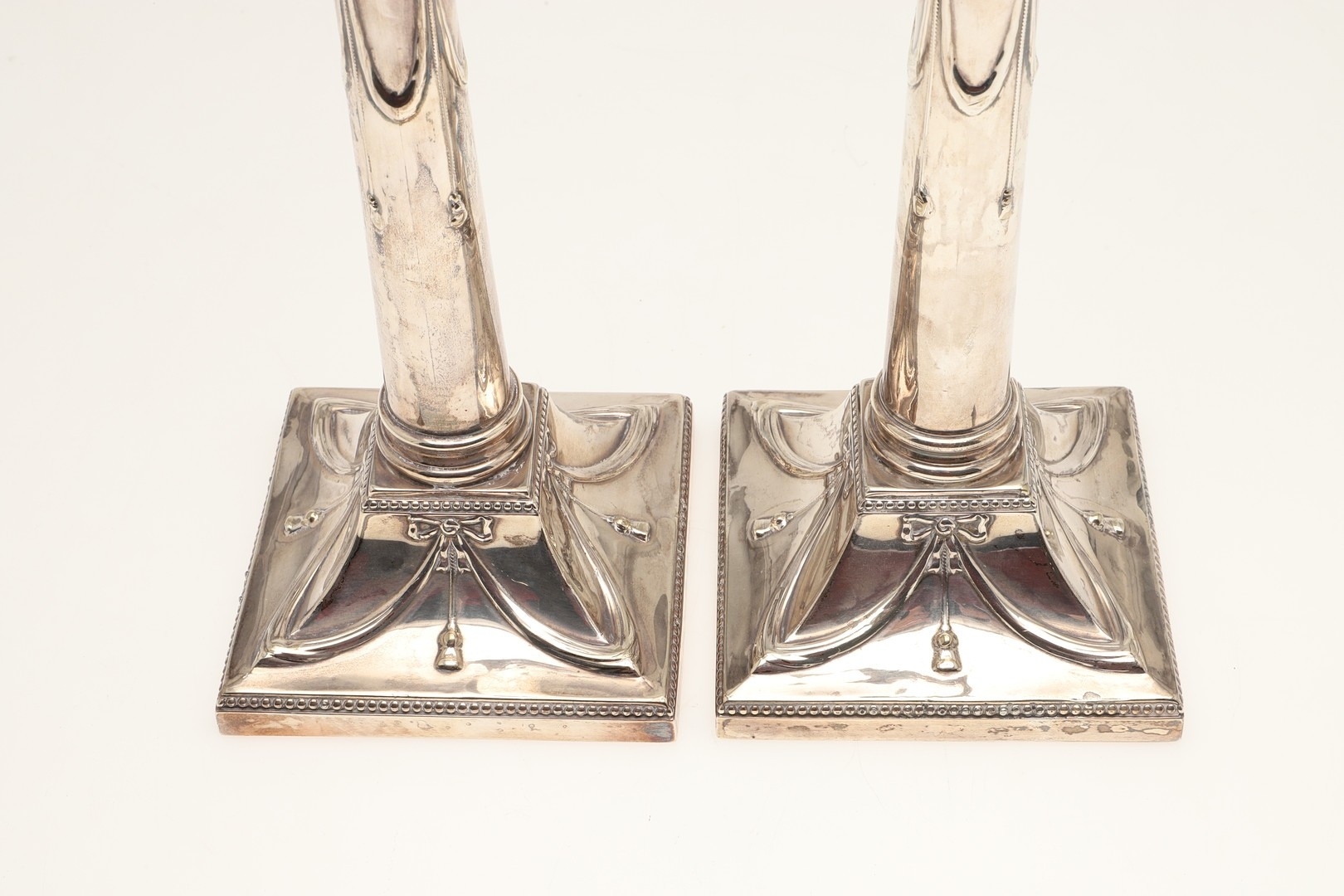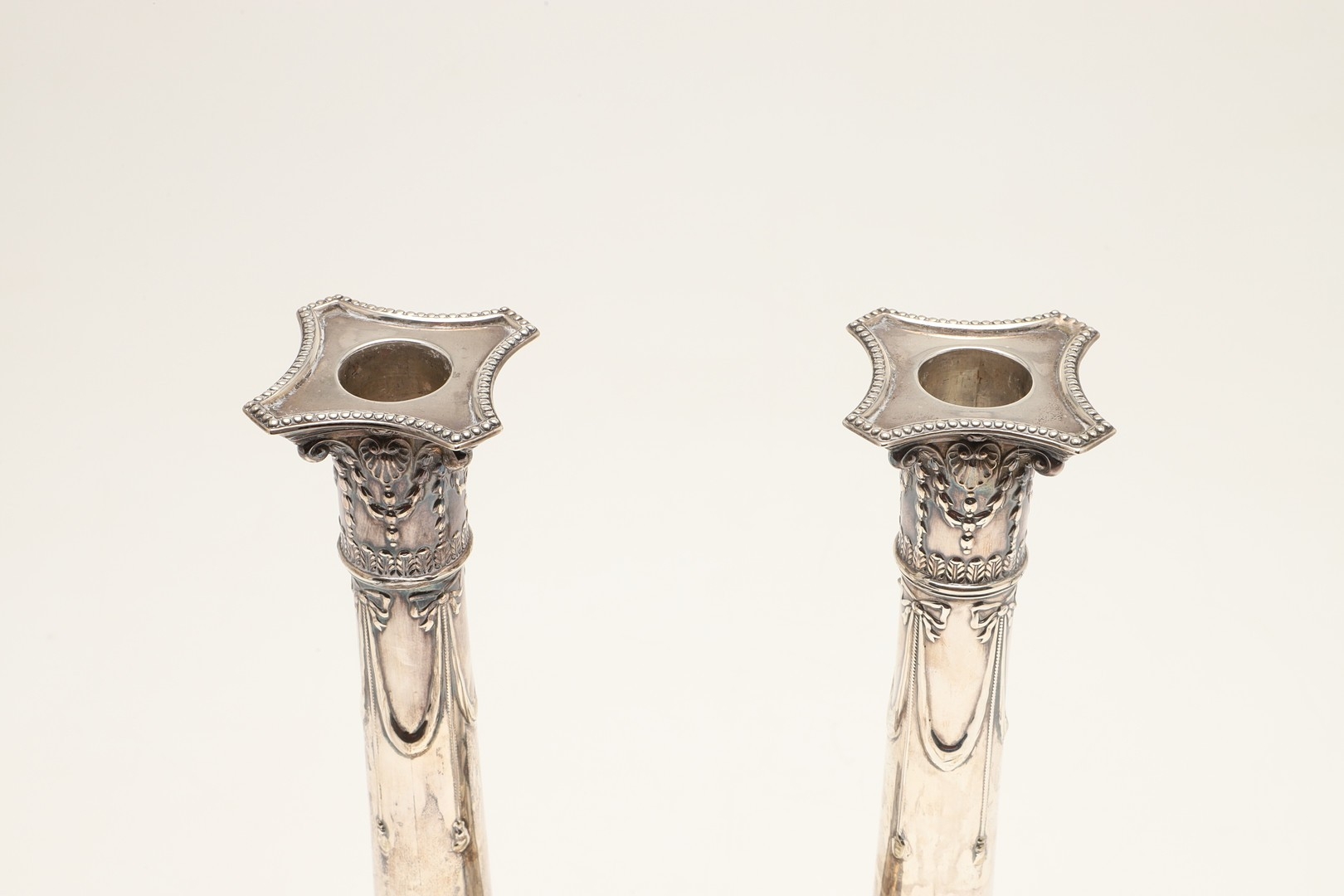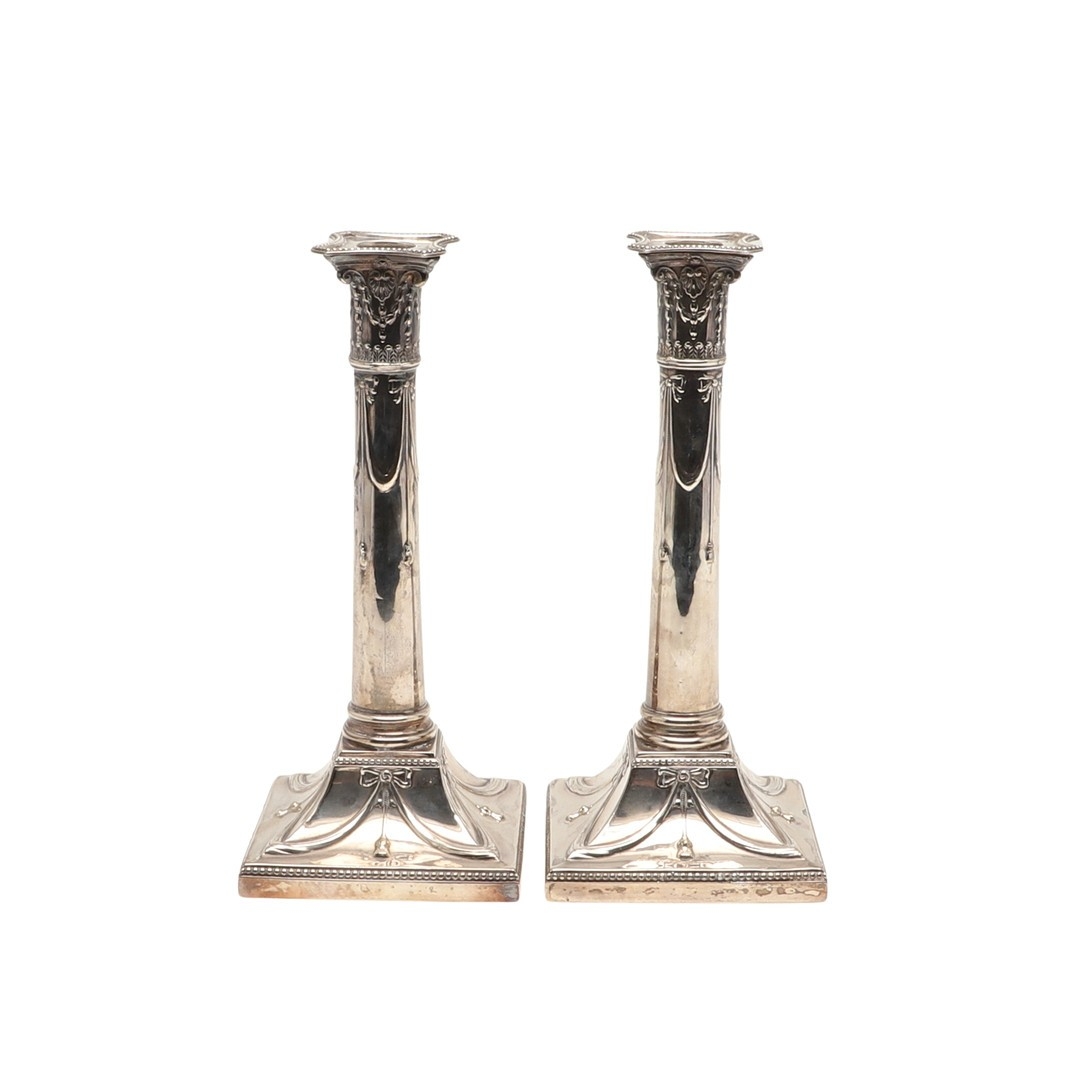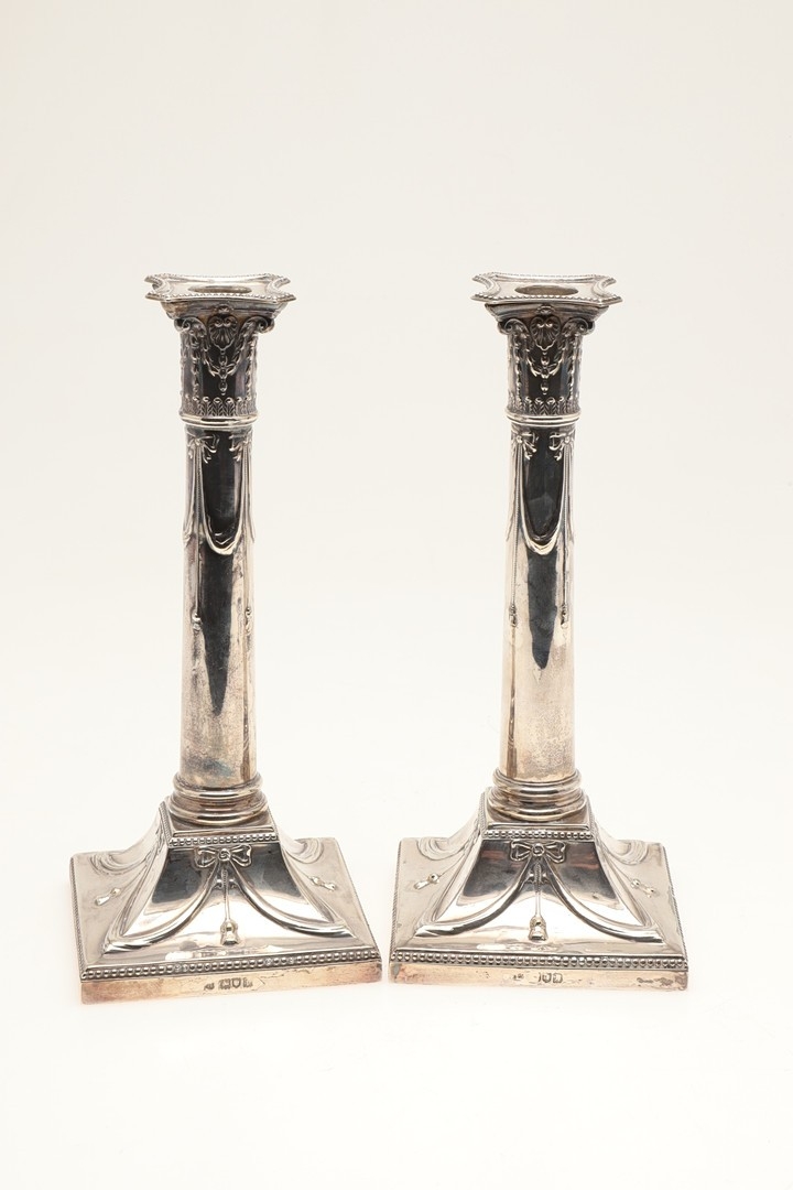 A PAIR OF EDWARDIAN SILVER CANDLESTICKS OF CORINTHIAN COLUMN FORM. Hung swags & ribbons on gadrooned square section weighted bases.