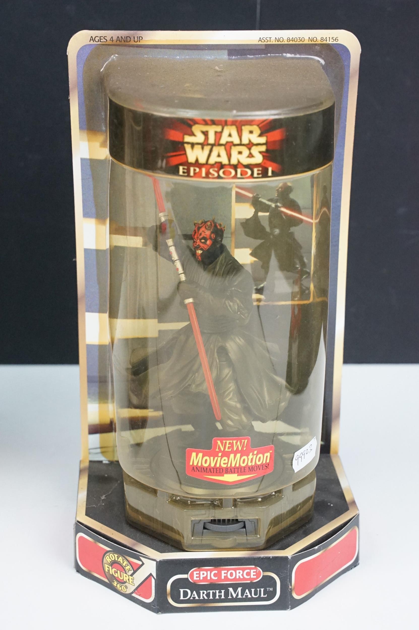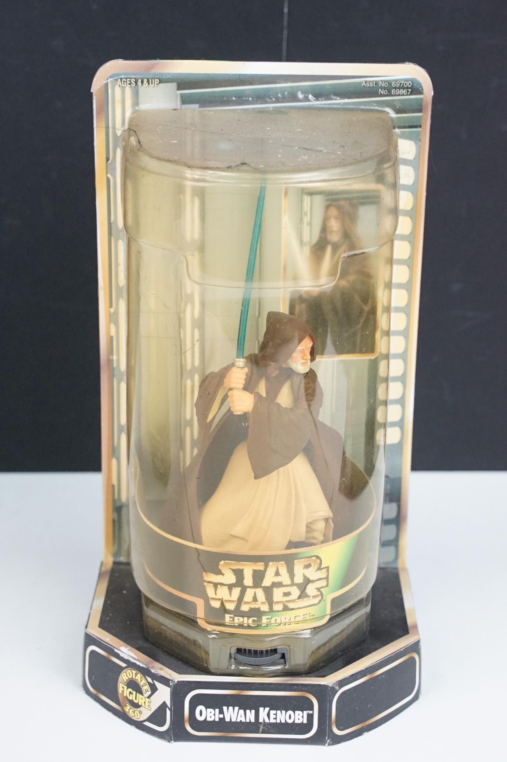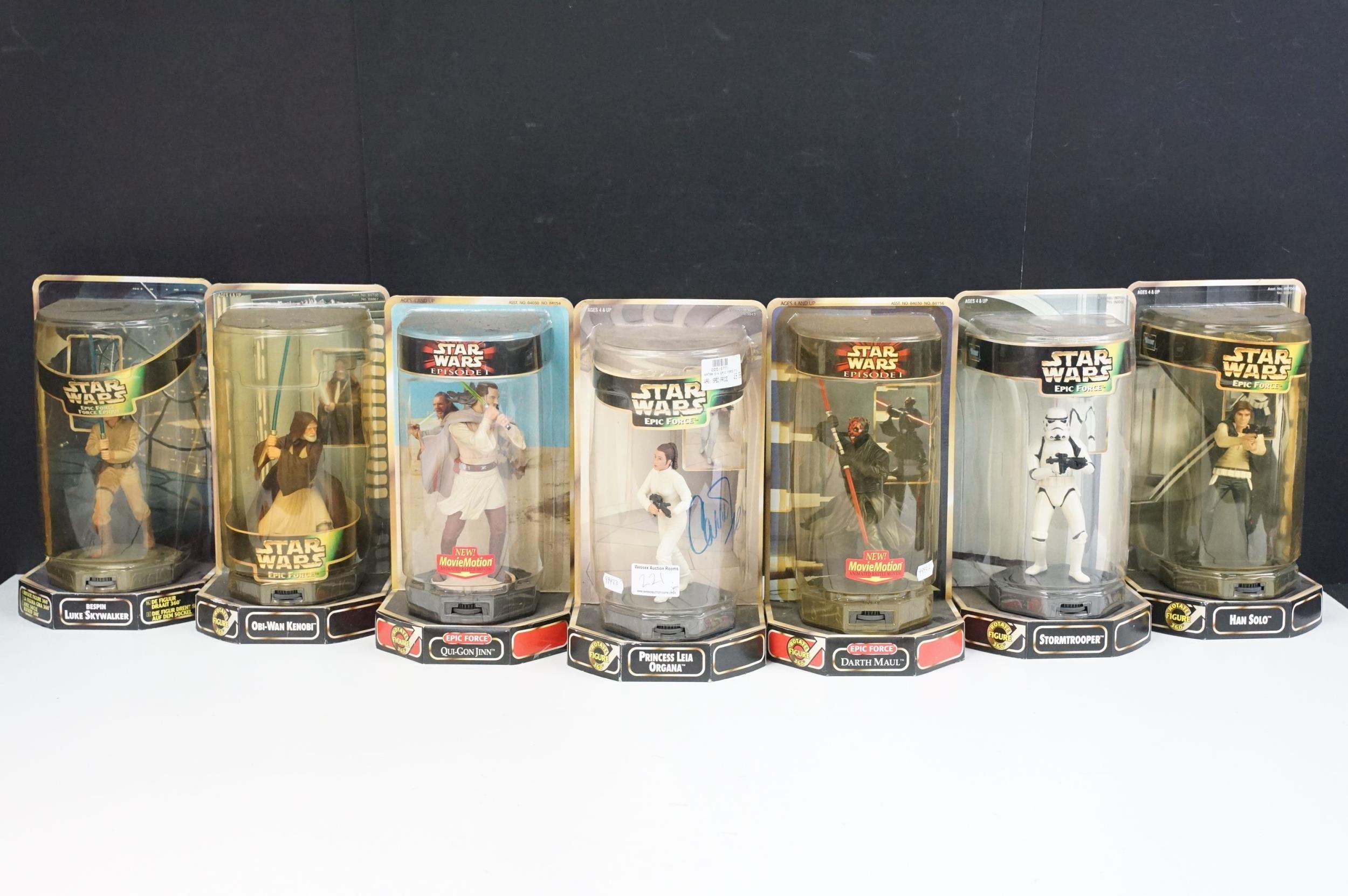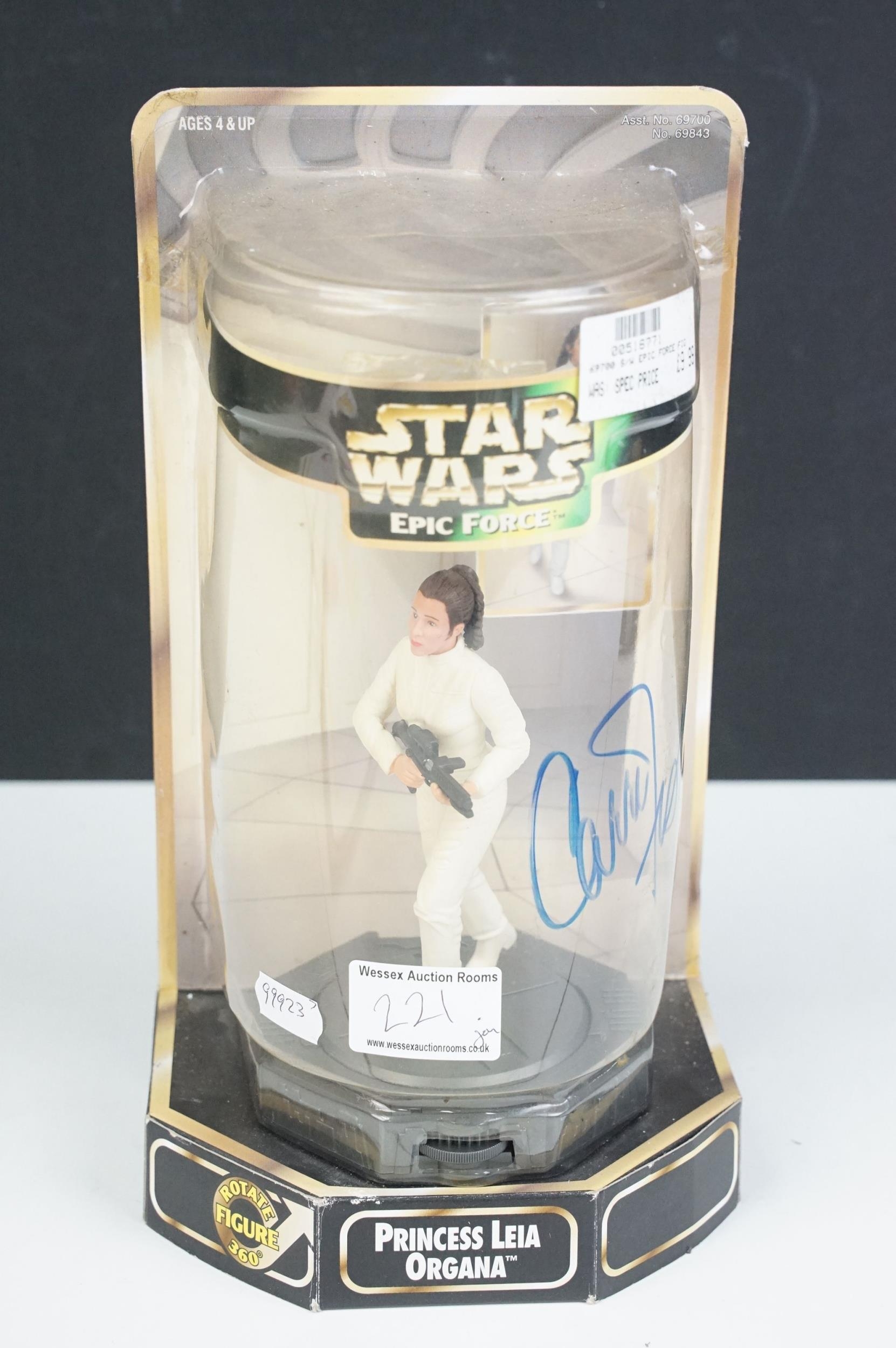 Star Wars - Seven cased Hasbro Star Wars Epic Force 360° action figures featuring Princess Leia Organa signed by Carrie Fisher, Qui-Gin Jinn, Darth Maul, Luke Skywalker (Bespin), Han Solo, Obi-wan Kenobi & Stormtrooper, cases showing wear