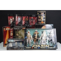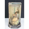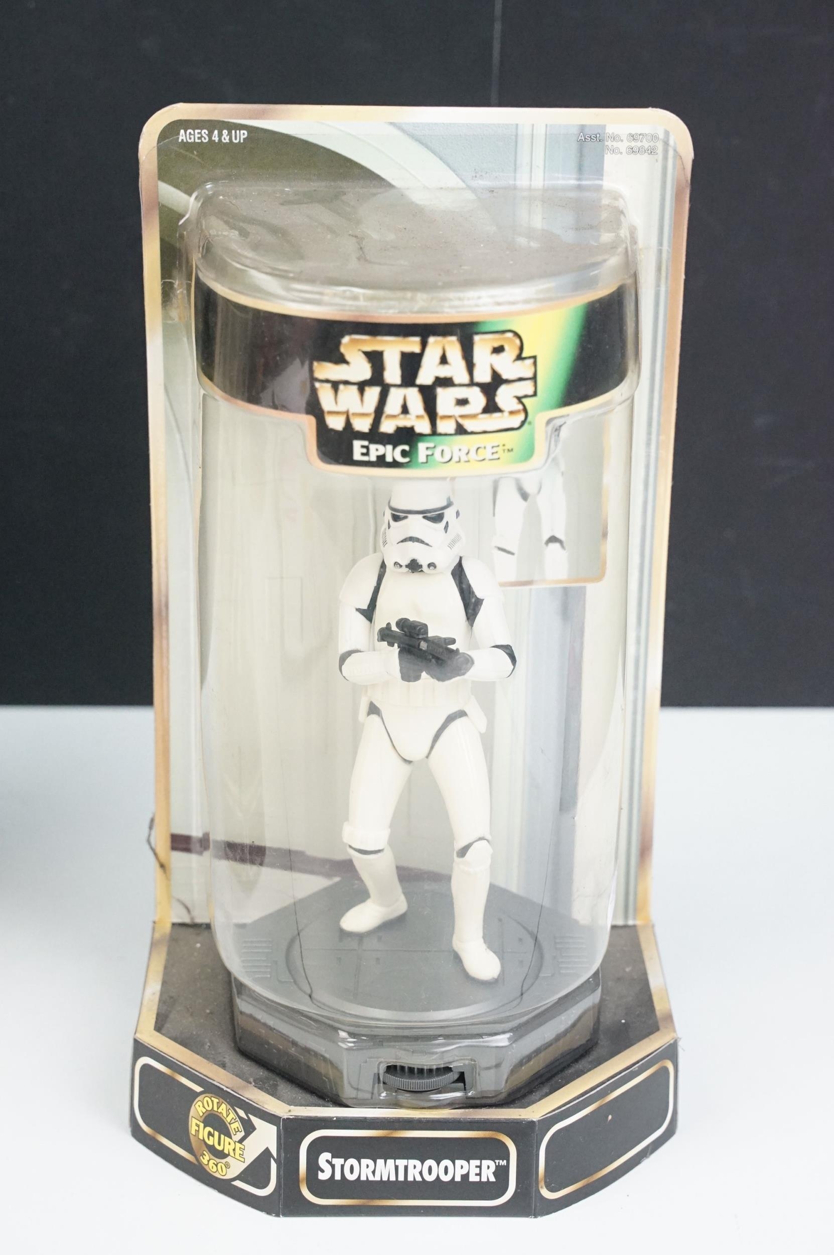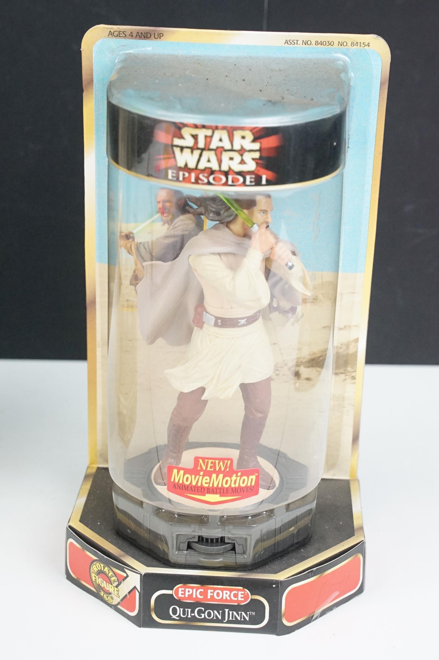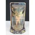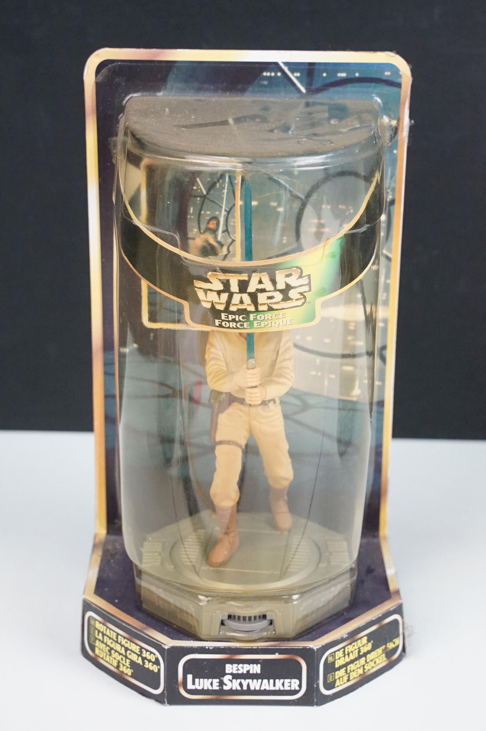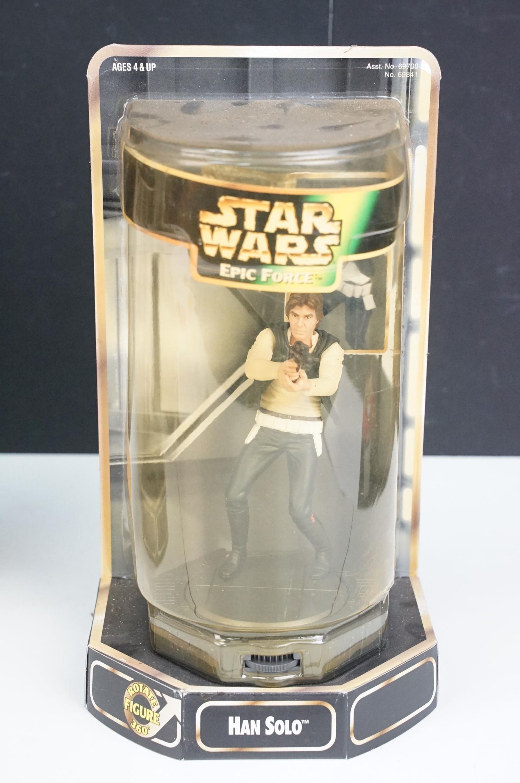 Star Wars - Seven cased Hasbro Star Wars Epic Force 360° action figures featuring Princess Leia Organa signed by Carrie Fisher, Qui-Gin Jinn, Darth Maul, Luke Skywalker (Bespin), Han Solo, Obi-wan Kenobi & Stormtrooper, cases showing wear