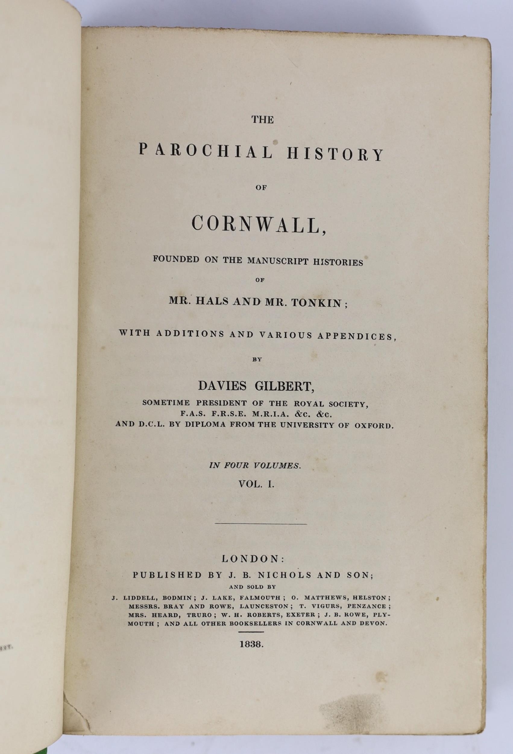 ° ° CORNWALL: Gibert, Davies - The Parochial History of Cornwall, founded on the manuscript histories of Mr. Hals and Mr. Tonkin; with additions ... 4 vols. half titles; rebound gilt-lettered cloth, uncut. 1838 (4)