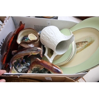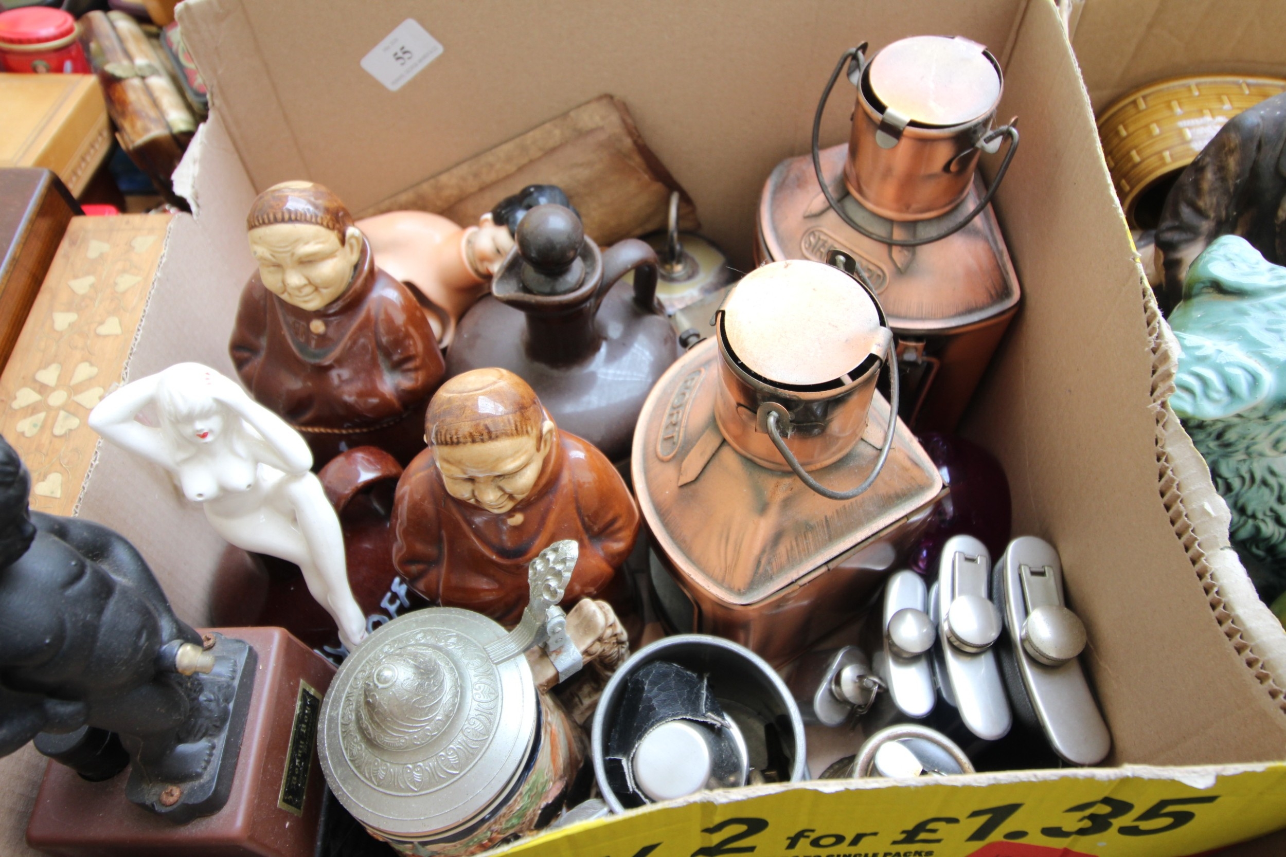 Collection of drink ware including comical mugs with stoppers, hip flasks, cigarette lighter and other items