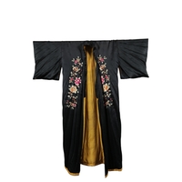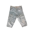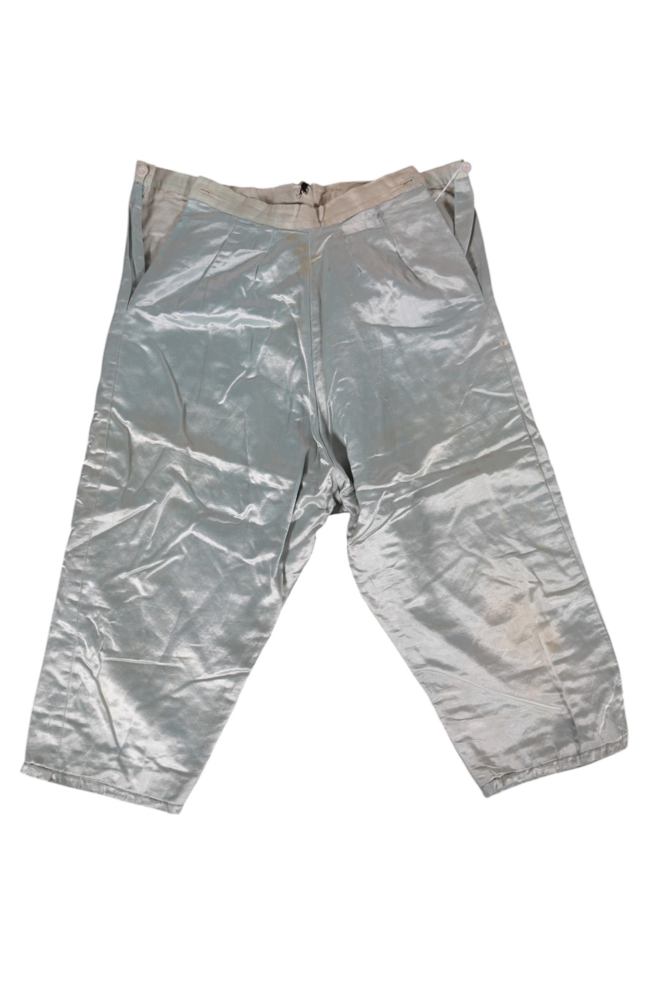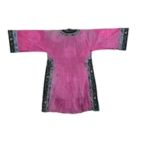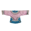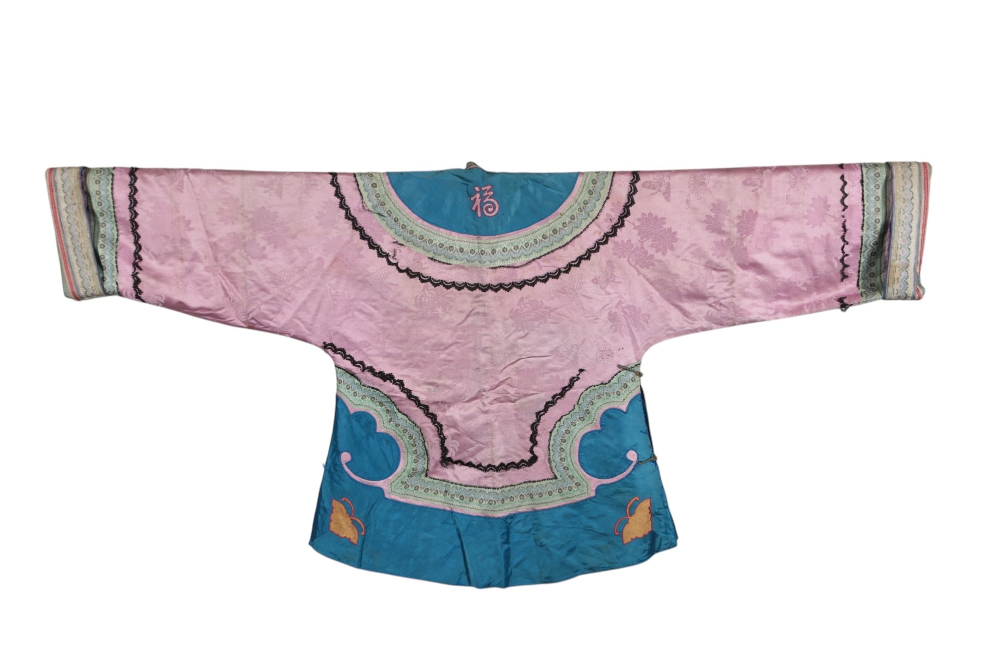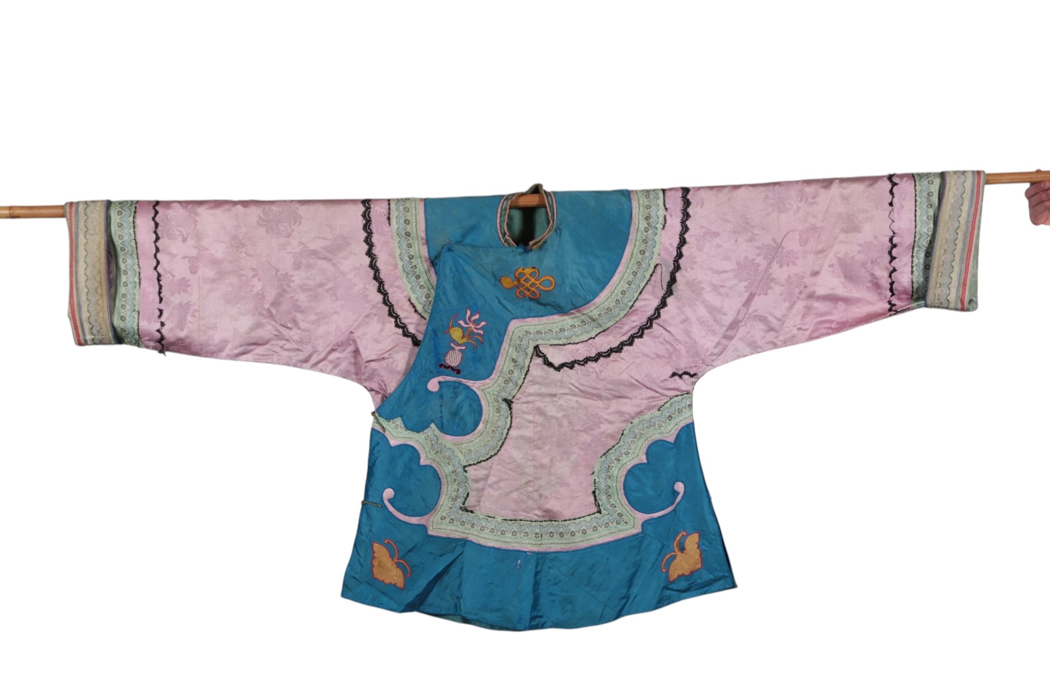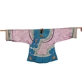 An early 20th century Chinese lilac and turquoise silk damask jacket with a pair of pale turquoise satin pantaloons, the wide turquoise borders decorated with 'cut out' auspicious symbols, the pink damask edged with a wide silk woven border and finer black border, jacket 87cm long.