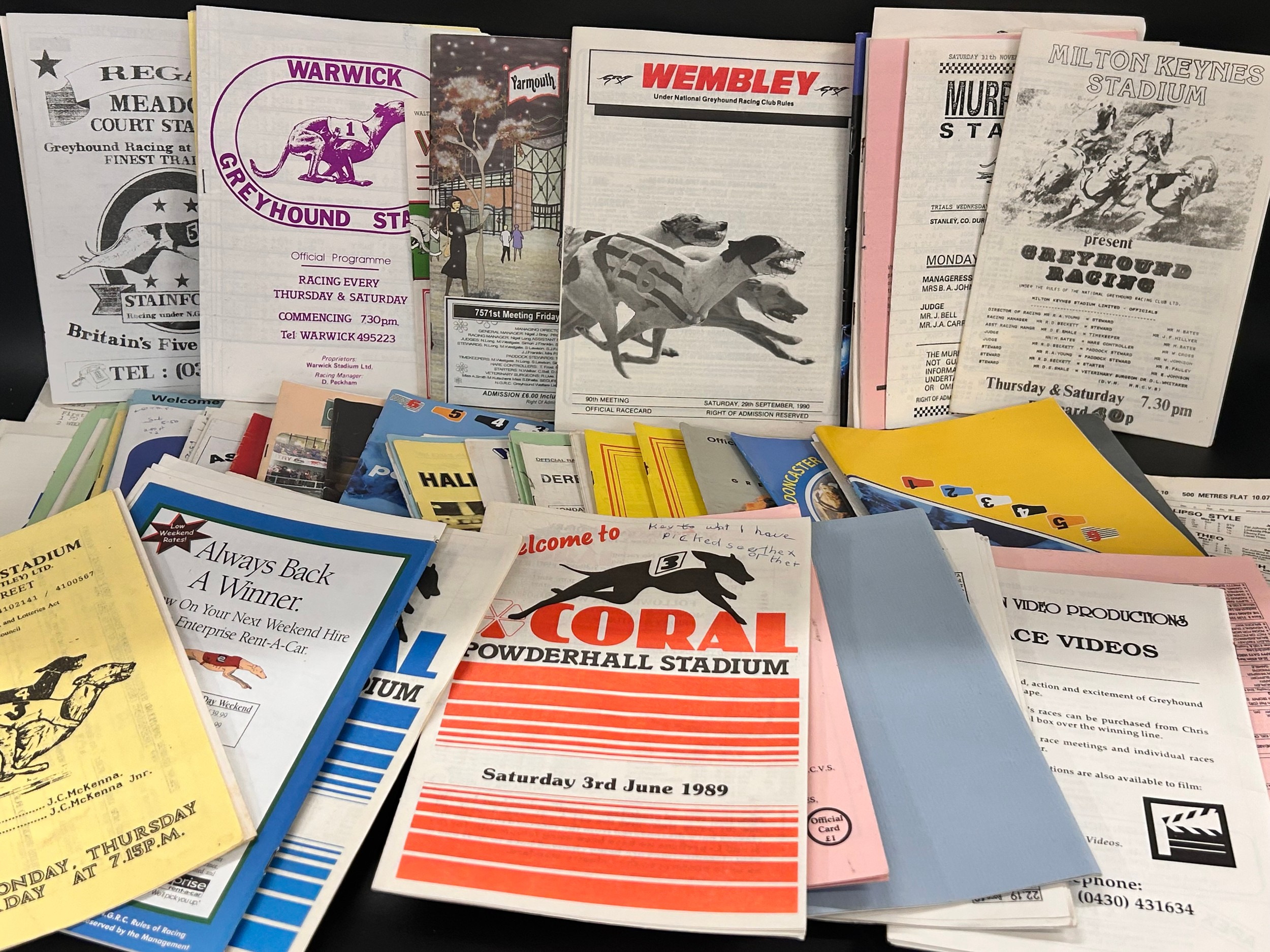 A collection of greyhound racing programmes, mostly 1990s and early 2000s