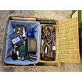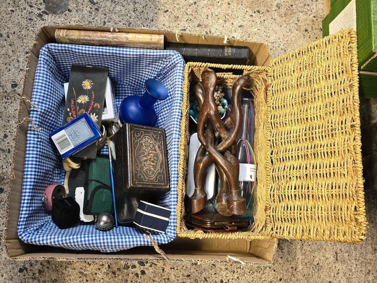 CARTON WITH MISC BRIC-A-BRAC INCL; WOODEN TABLE STAND, JEWELLERY, PLAYING CARDS, SMALL BLUE VASE, WICKER BASKET ETC