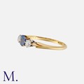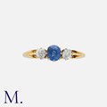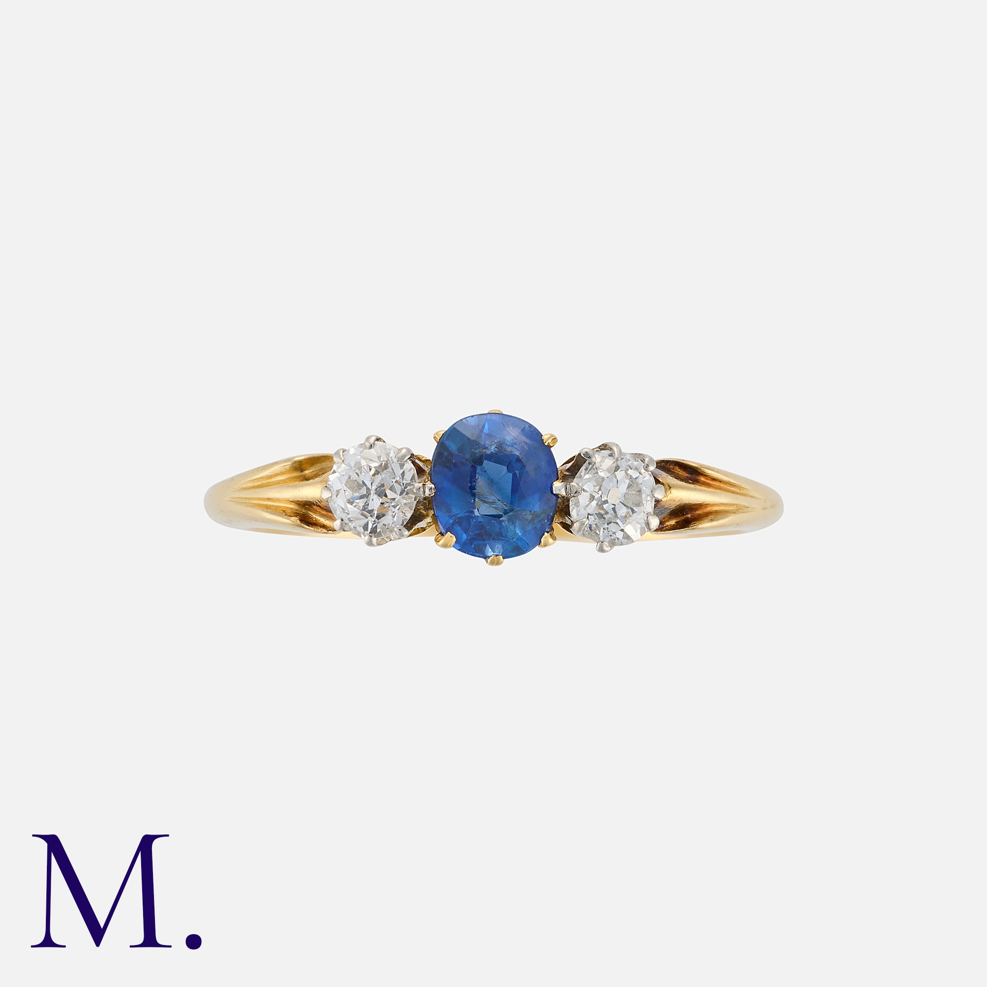 A Sapphire and Diamond Three Stone Ring in 18 carat yellow gold. Set with a principal cushion cut sapphire between two diamonds. Marked indistinctly, tests indicate 18ct.