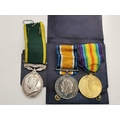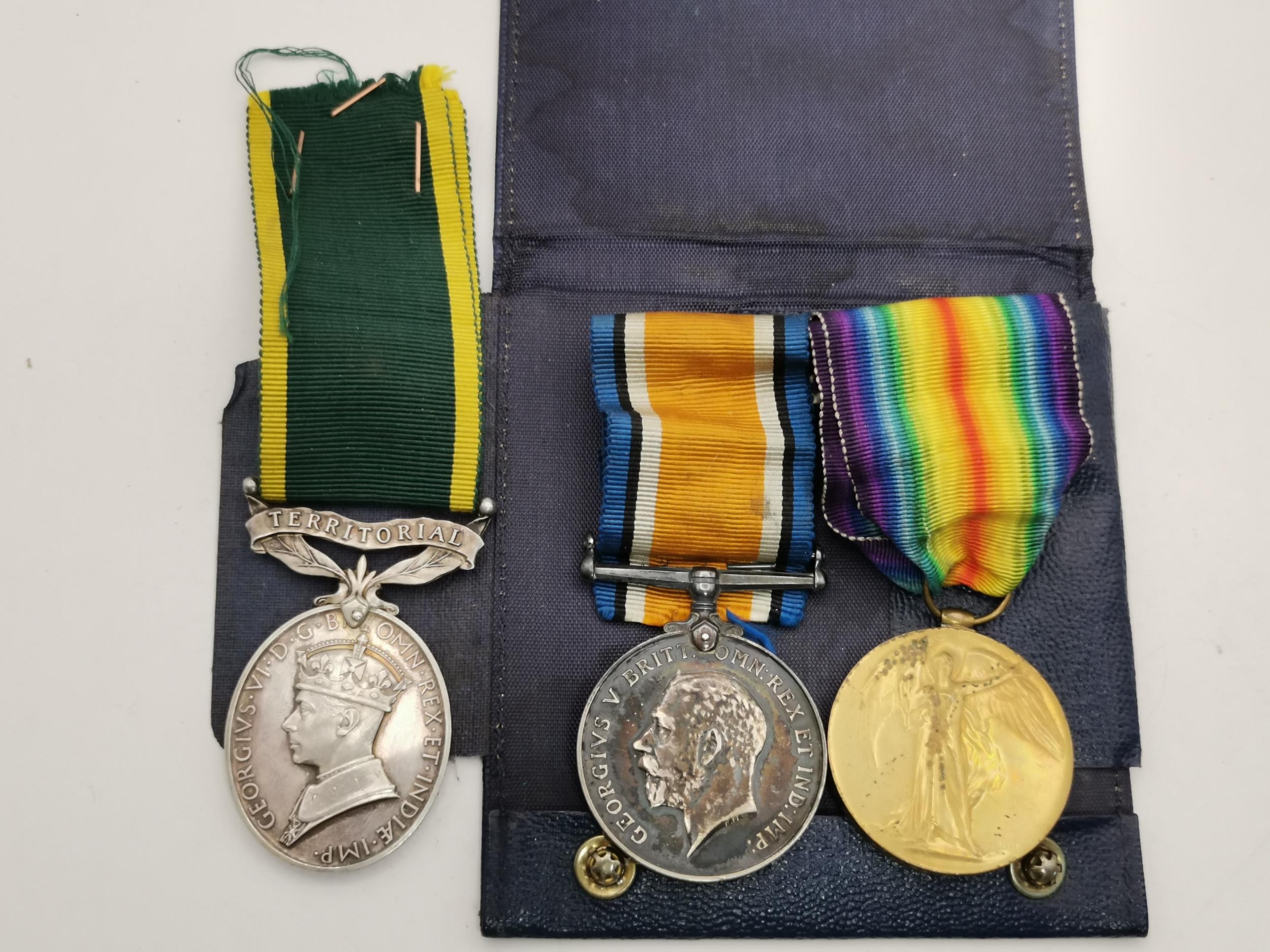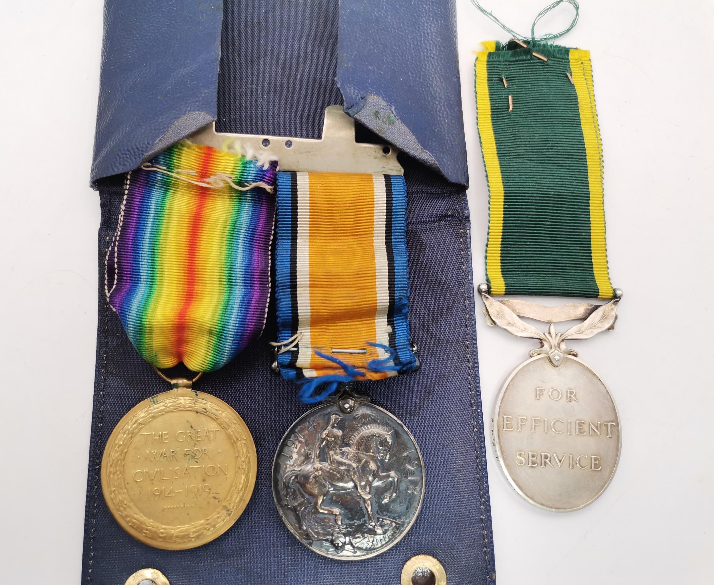 A First World War medal pair to 79465 PTE. A. B. PATRICK. DURH. L.I., comprising British War medal and Victory medal, mounted, in a British Legion 1914-18 pouch; together with a George VI Territorial Efficiency medal to 4539081. CFN. B. PATRICK. R.E.M.E., For Efficient Service, on ribbon.