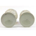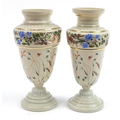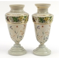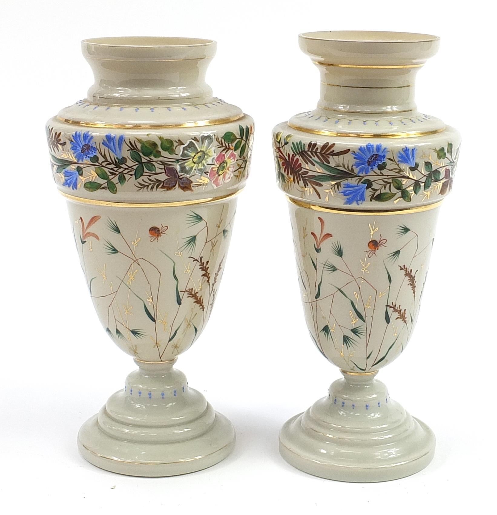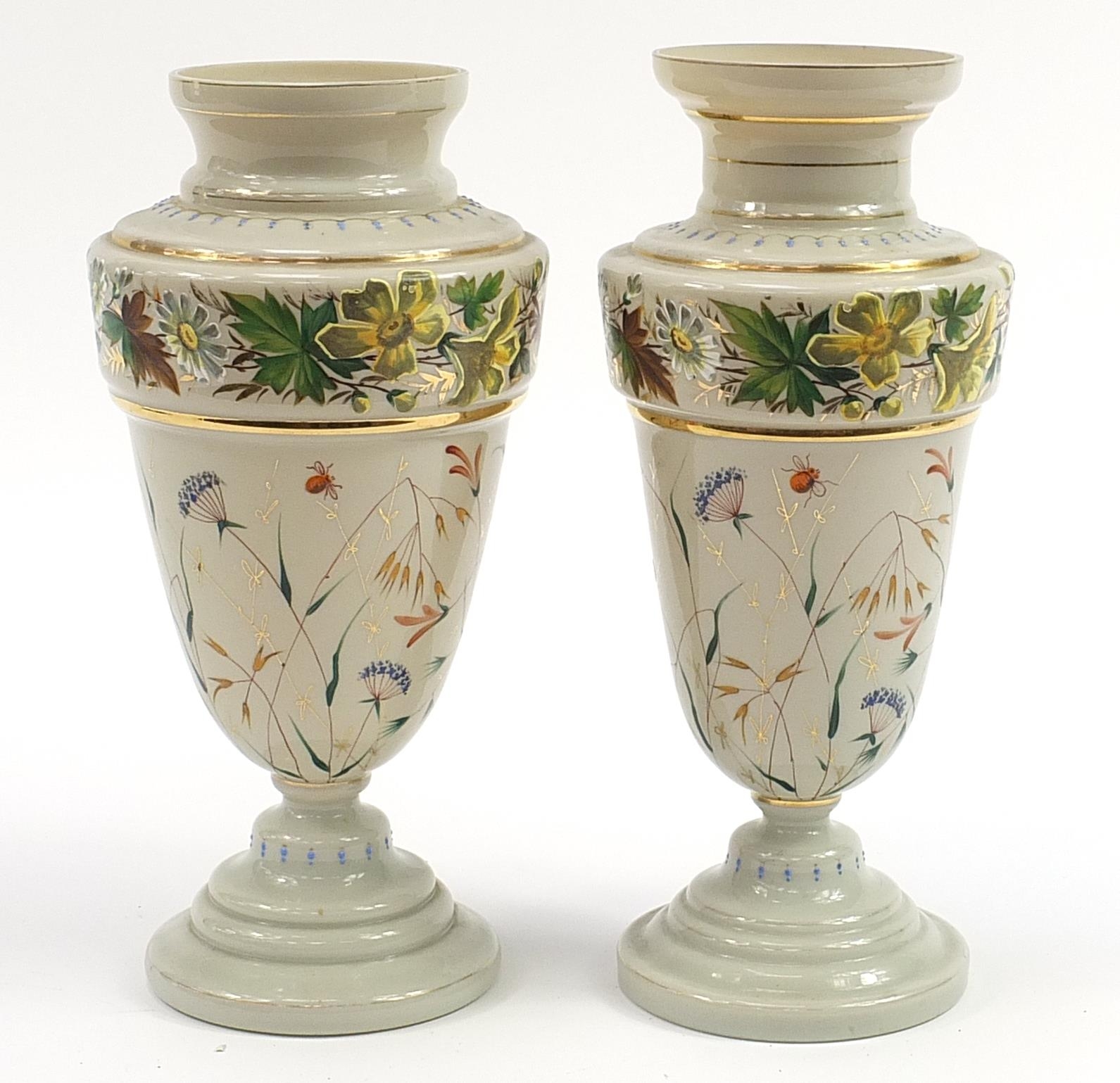 Matched pair of 19th century opaline glass vases, hand painted with flowers and insects amongst reeds, each 37.5cm high