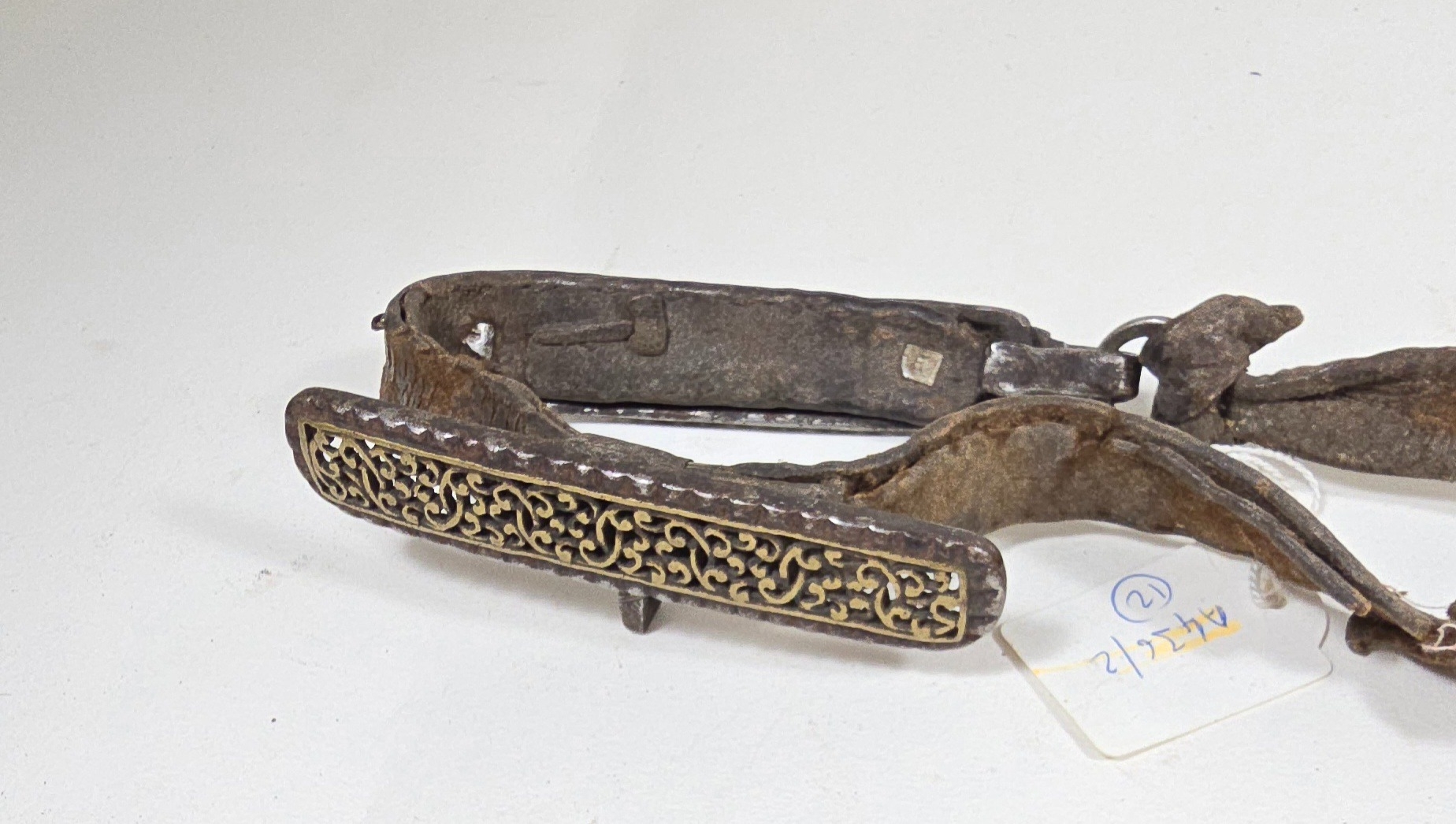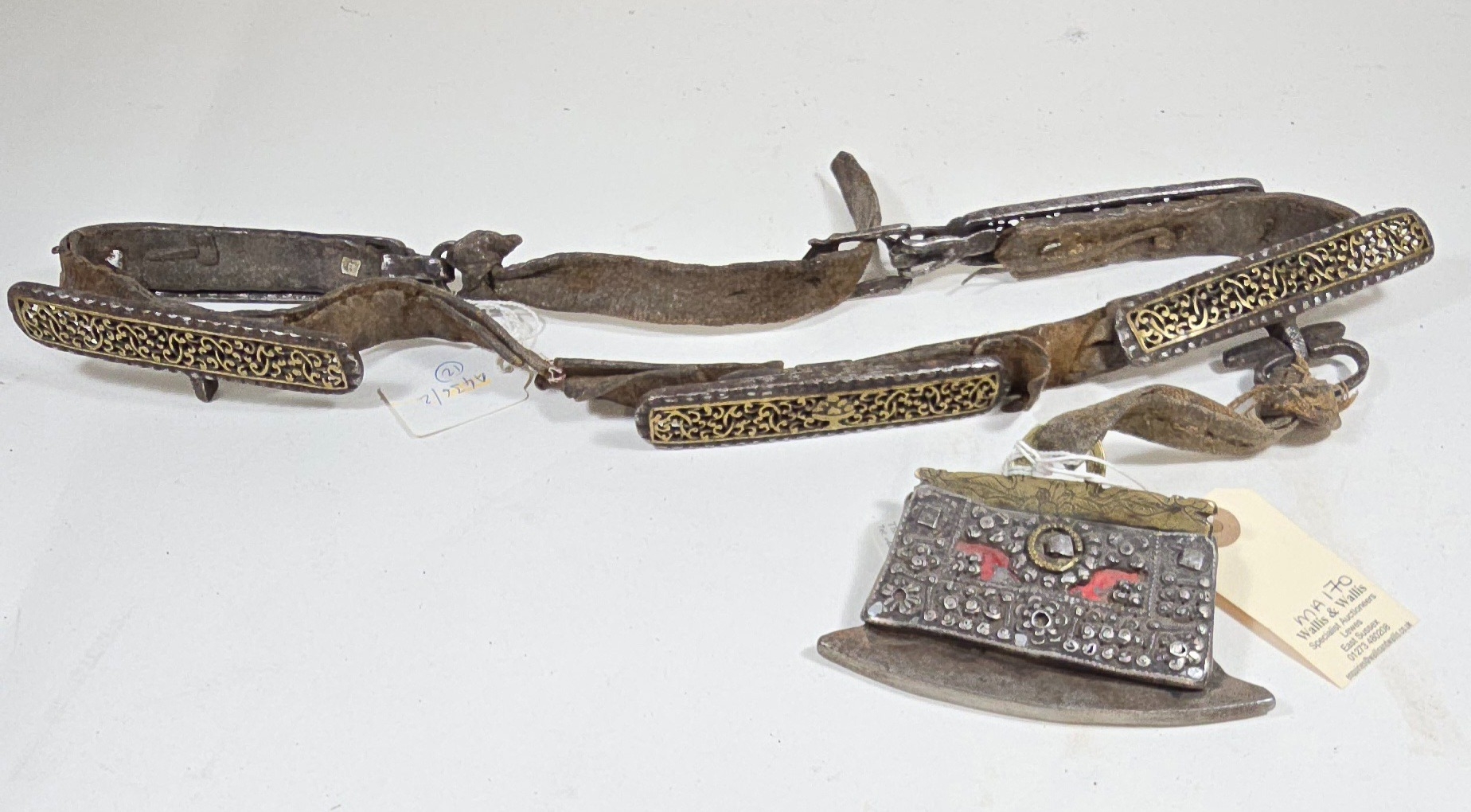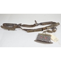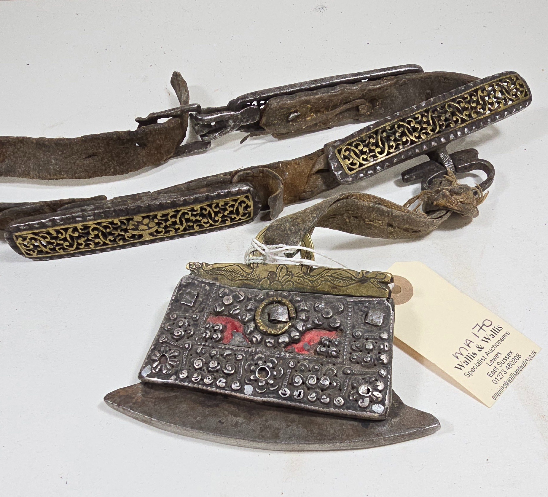 A scarce Tibetan leather belt and chukmuk with metal mounts, probably 18th century, the belt with 5 slender rectangular iron plates containing brass plated pierced with scroll-work, the chukmuk (strike-a-light) with pierced silver cover. Quite good condition, well worn overall.